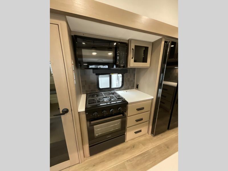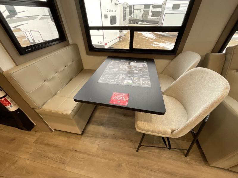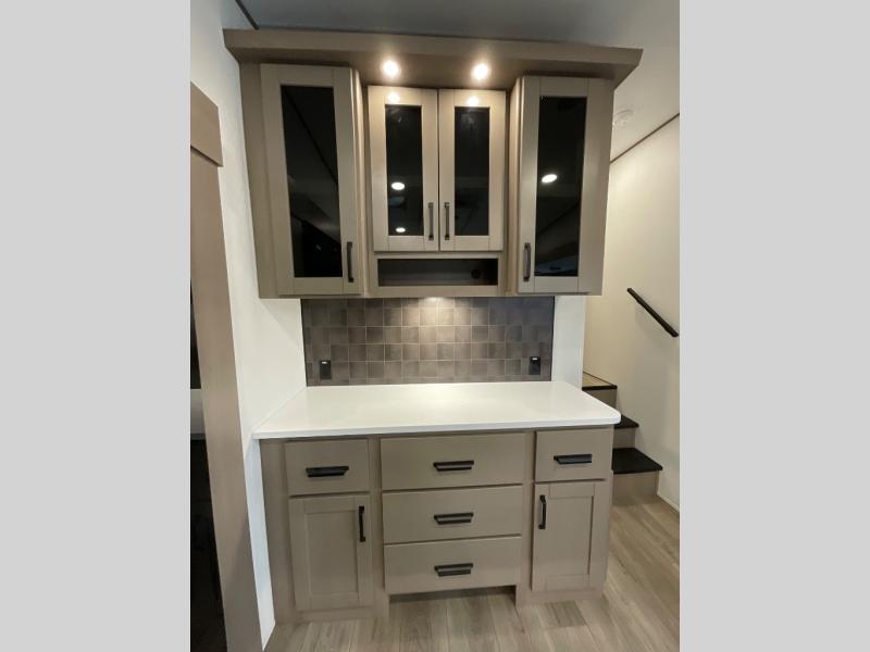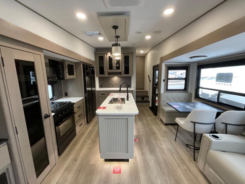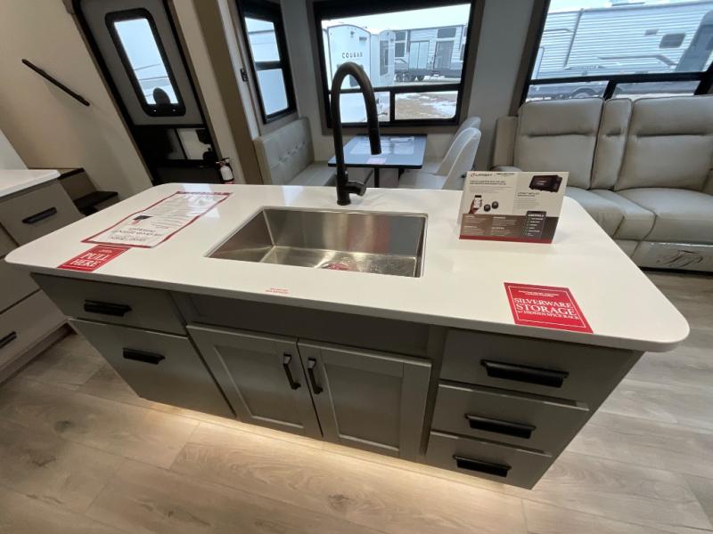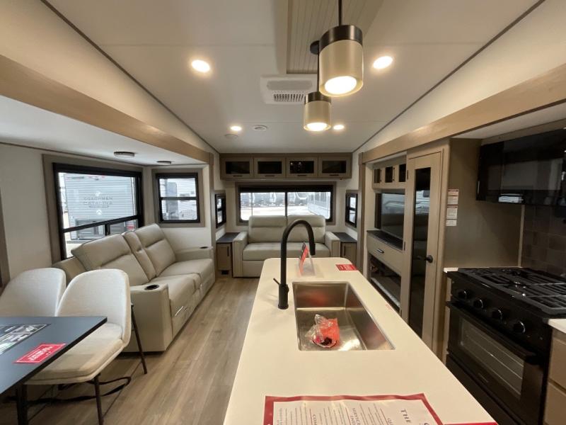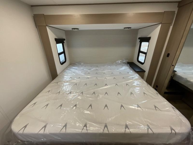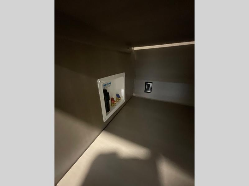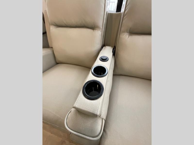 You can enjoy a spacious rear living area in this RV with dual opposing slides offering you entertainment, kitchen amenities, seating and windows for great views! The rear tri-fold sofa also converts into extra sleeping space for an extra guest or two, just like the booth dinette does. Yet you might like to add the swivel dinette option. There are theater seats to enjoy while you place your drinks in the cupholders and watch the entertainment center with a 40" LED HDTV and fireplace. The pantry is big enough to store your favorite snacks, and the kitchen island will make meal prepping easier, plus there is a 16 cu. ft. refrigerator to store any leftovers. The full bathroom has a 30" x 48" fiberglass shower and a linen closet to store your towels. The front private bedroom has a comfortable queen bed slide that can be switched out for the optional king bed, a dresser with overhead cabinets, and a full wall wardrobe that is prepped to add the optional washer and dryer so that you can extend your camping trip with clean clothes!