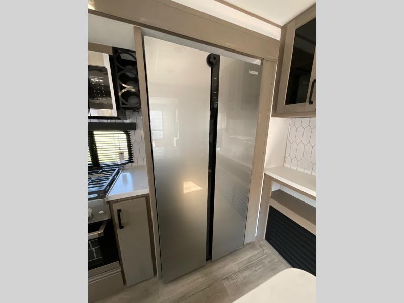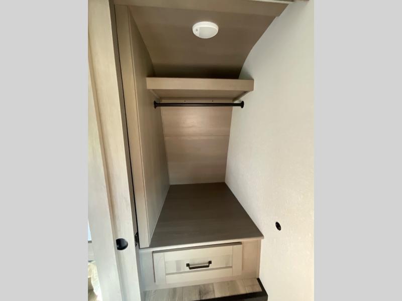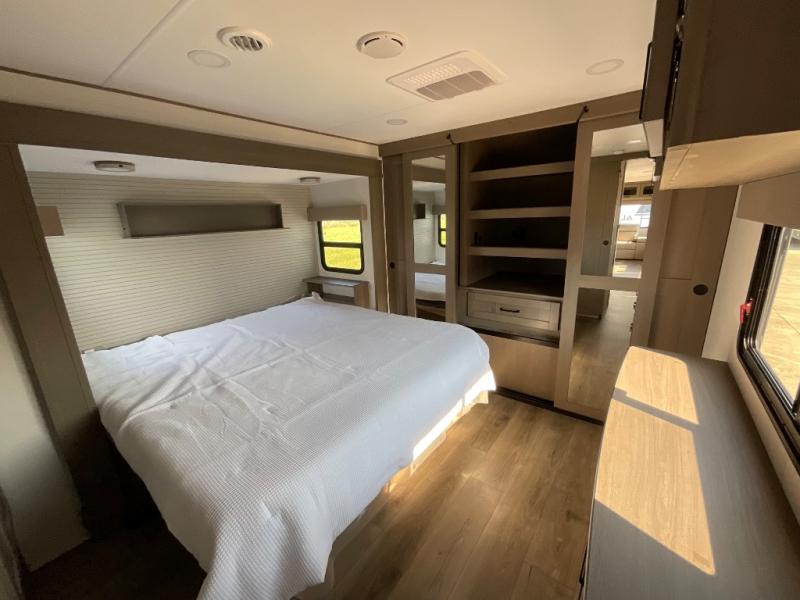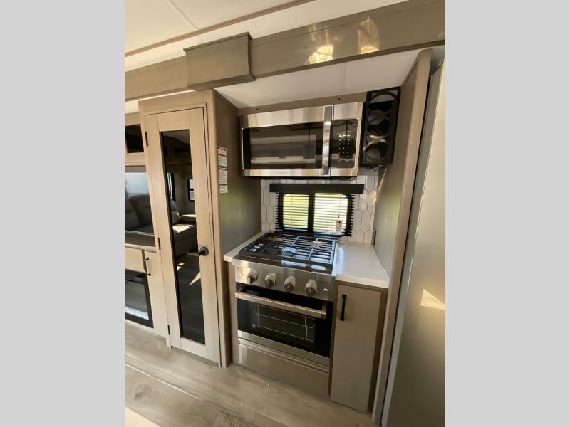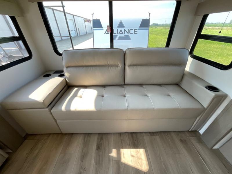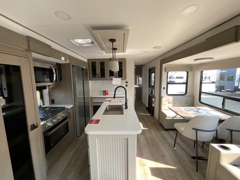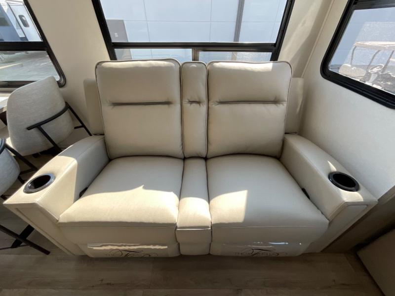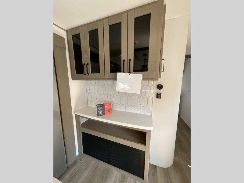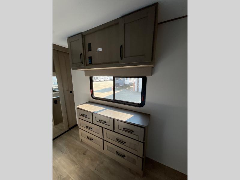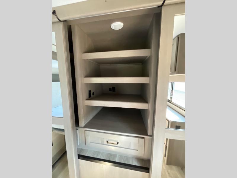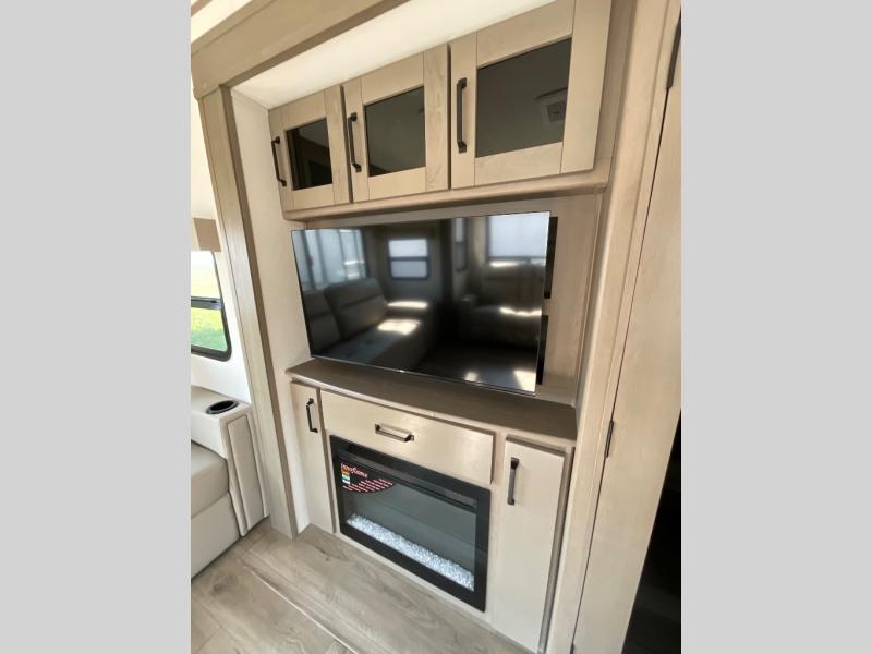 This rear living travel trailer will be perfect for extended stays at the campground or quick weekend trips to the lake! Once you've unloaded your gear from the pass-thru storage, head inside to relax on the rear tri-fold sofa with an adjustable headrest or on the theater seating across from the 40" TV and fireplace. There is also a booth dinette where you can dine together, or you can choose the optional swivel dinette. The spacious kitchen island will make meal time easier than ever, plus there is a pantry and 16 cu. ft. 12V refrigerator for food storage. The full bath is right next to the front private bedroom for easy nighttime use, and speaking of nighttime, you're sure to sleep soundly on the queen bed slide. There is also a large front closet, TV prep, plus washer and dryer prep if you choose to add these appliances.