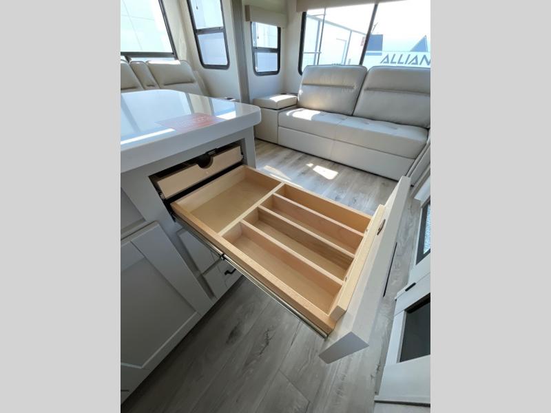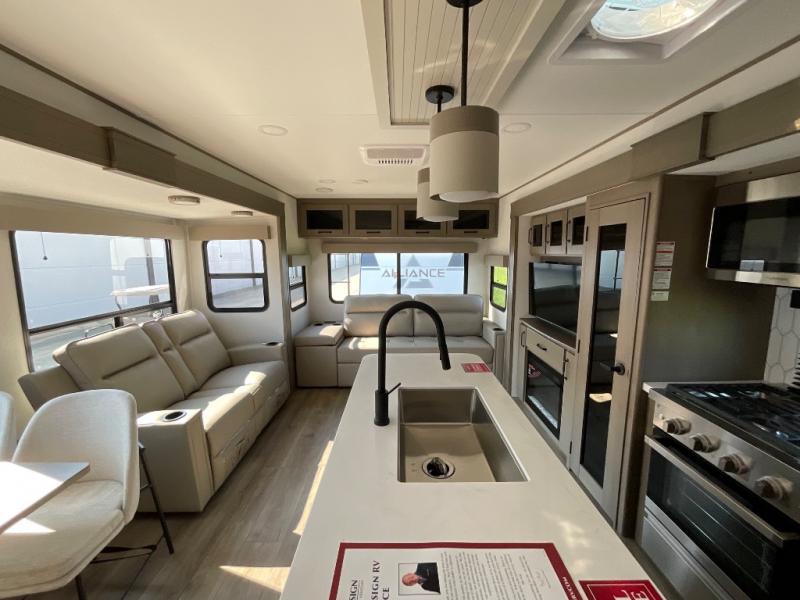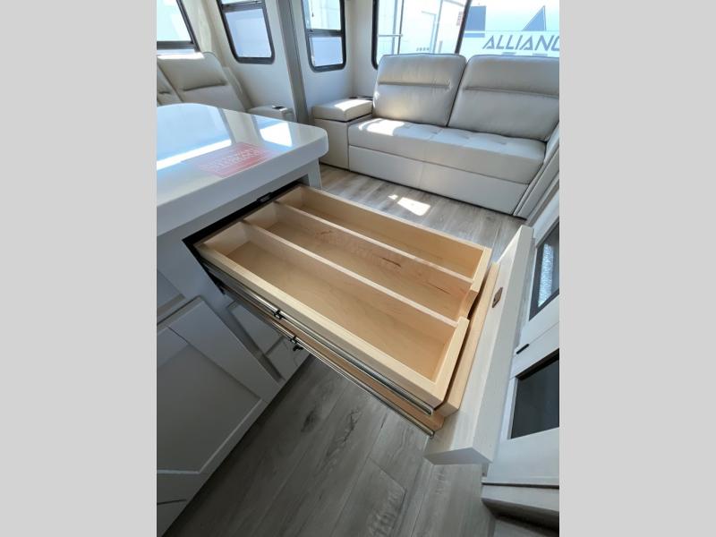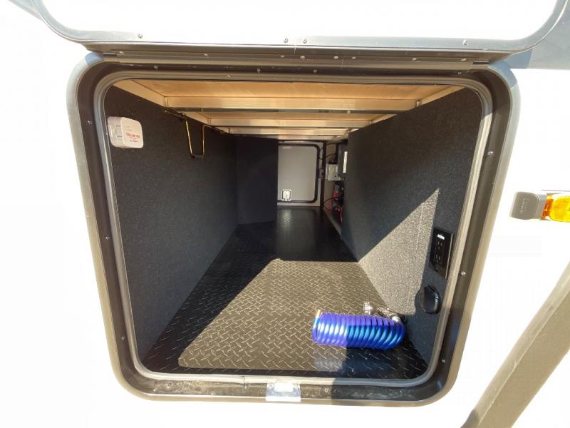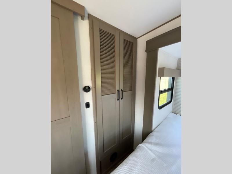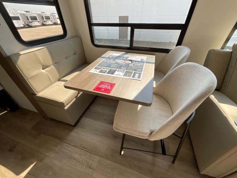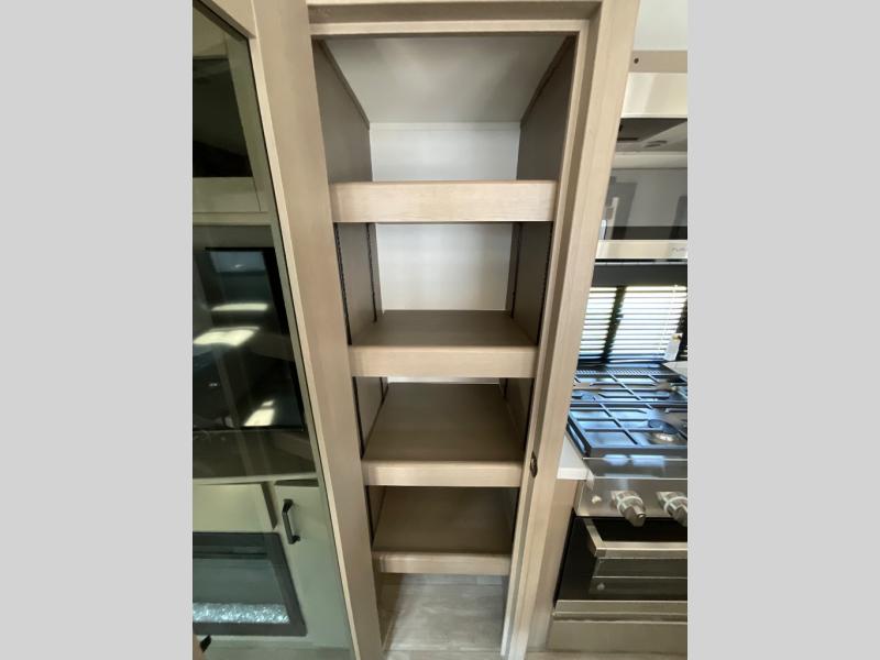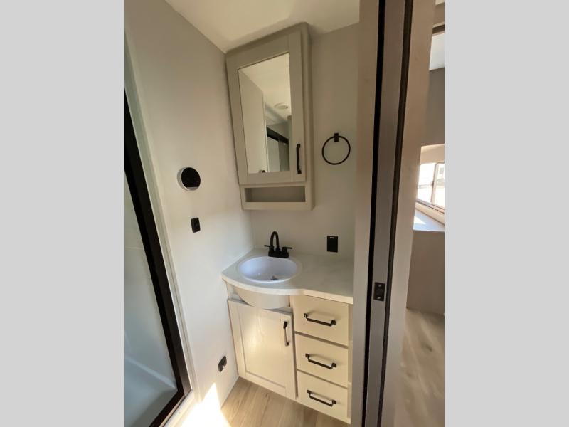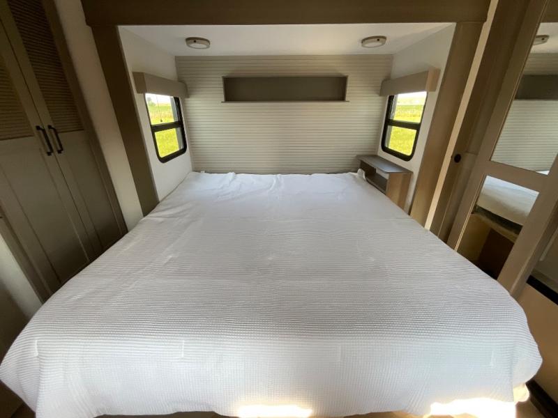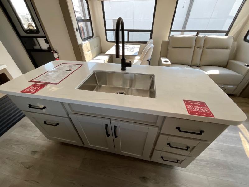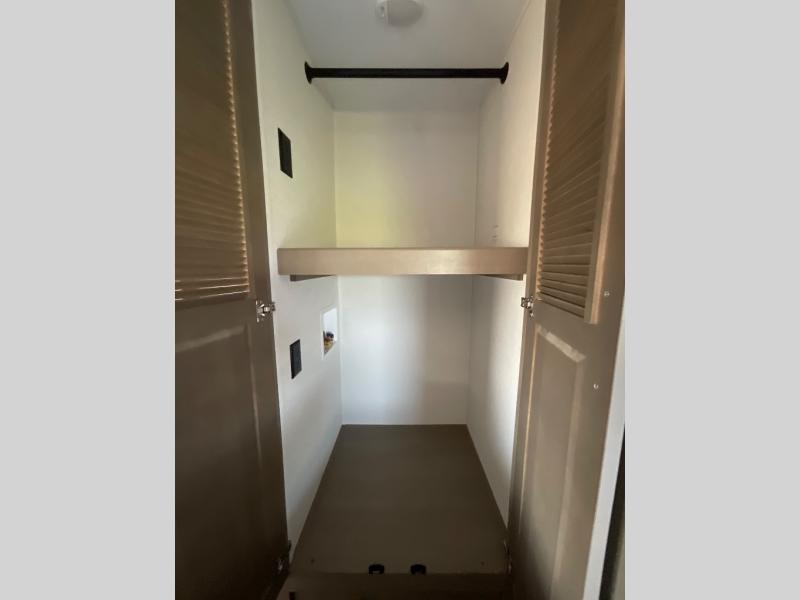 This rear living travel trailer will be perfect for extended stays at the campground or quick weekend trips to the lake! Once you've unloaded your gear from the pass-thru storage, head inside to relax on the rear tri-fold sofa with an adjustable headrest or on the theater seating across from the 40" TV and fireplace. There is also a booth dinette where you can dine together, or you can choose the optional swivel dinette. The spacious kitchen island will make meal time easier than ever, plus there is a pantry and 16 cu. ft. 12V refrigerator for food storage. The full bath is right next to the front private bedroom for easy nighttime use, and speaking of nighttime, you're sure to sleep soundly on the queen bed slide. There is also a large front closet, TV prep, plus washer and dryer prep if you choose to add these appliances.