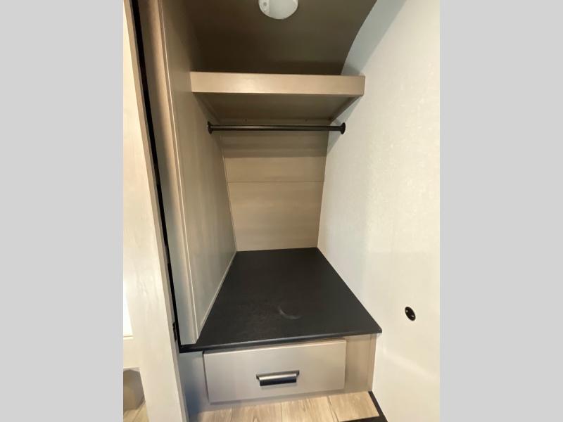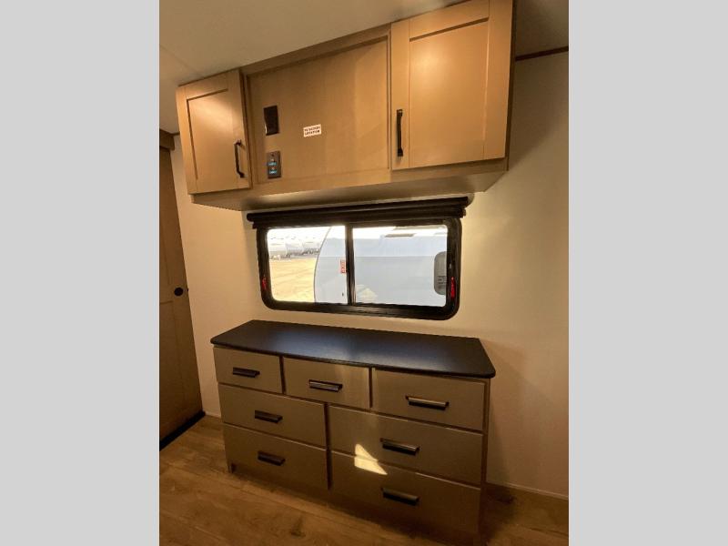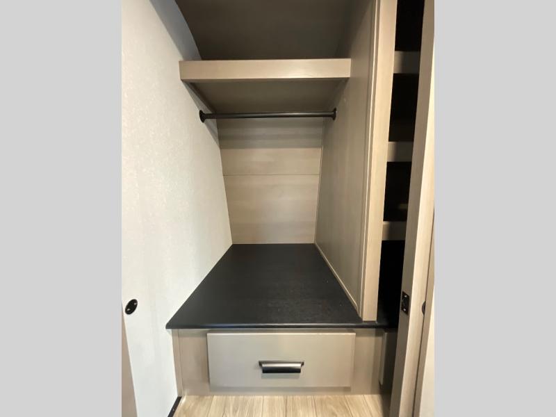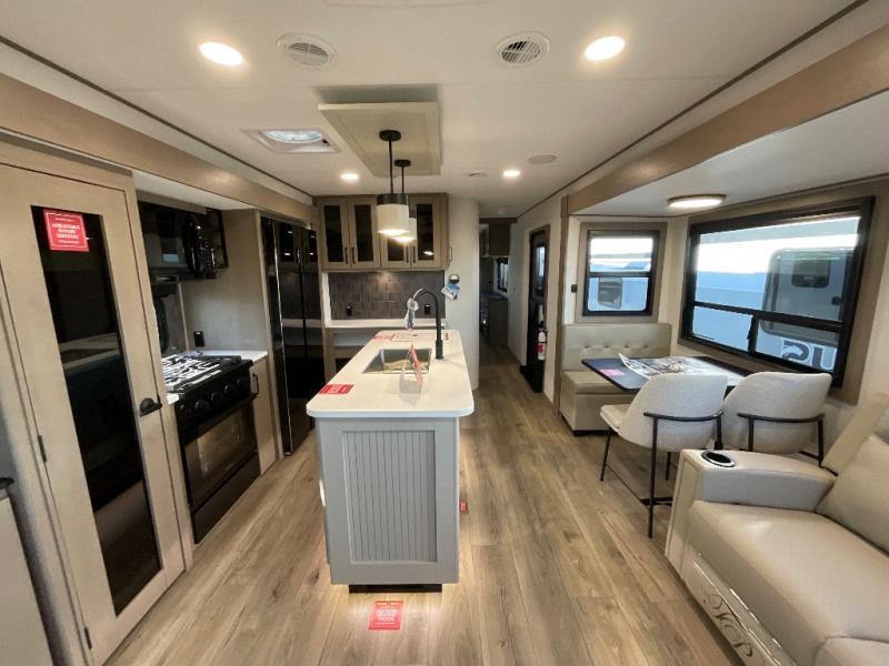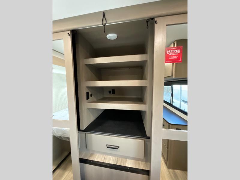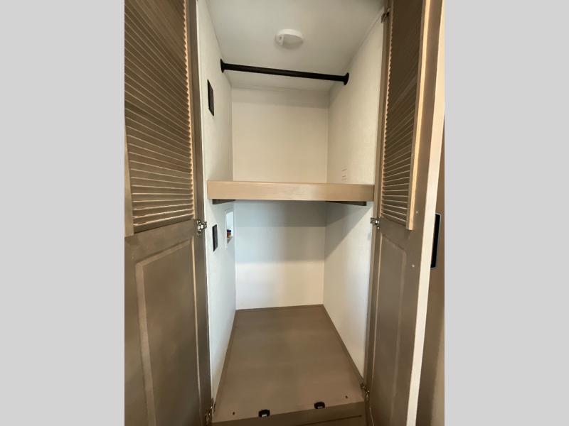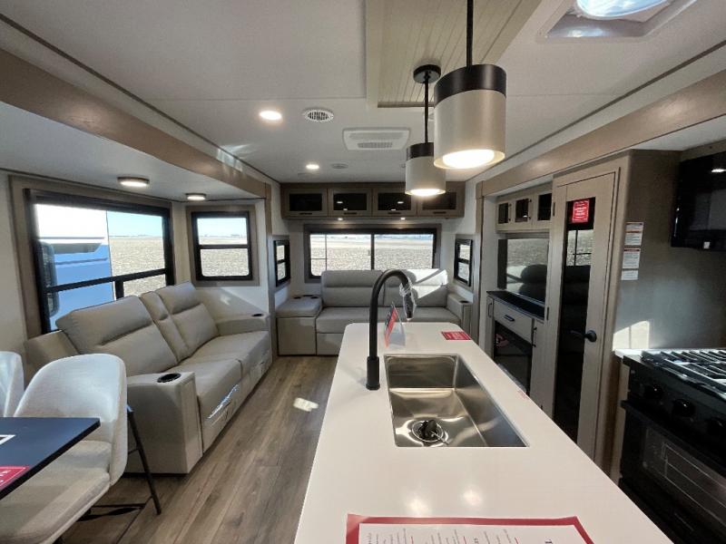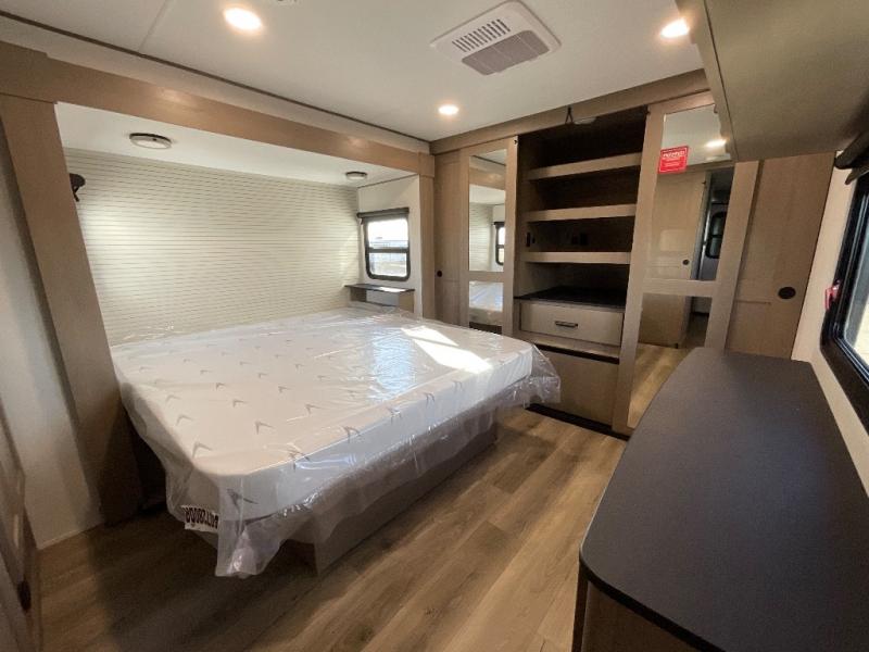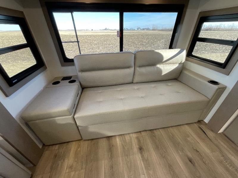 This rear living travel trailer will be perfect for extended stays at the campground or quick weekend trips to the lake! Once you've unloaded your gear from the pass-thru storage, head inside to relax on the rear tri-fold sofa with an adjustable headrest or on the theater seating across from the 40" TV and fireplace. There is also a booth dinette where you can dine together, or you can choose the optional swivel dinette. The spacious kitchen island will make meal time easier than ever, plus there is a pantry and 16 cu. ft. 12V refrigerator for food storage. The full bath is right next to the front private bedroom for easy nighttime use, and speaking of nighttime, you're sure to sleep soundly on the queen bed slide. There is also a large front closet, TV prep, plus washer and dryer prep if you choose to add these appliances.