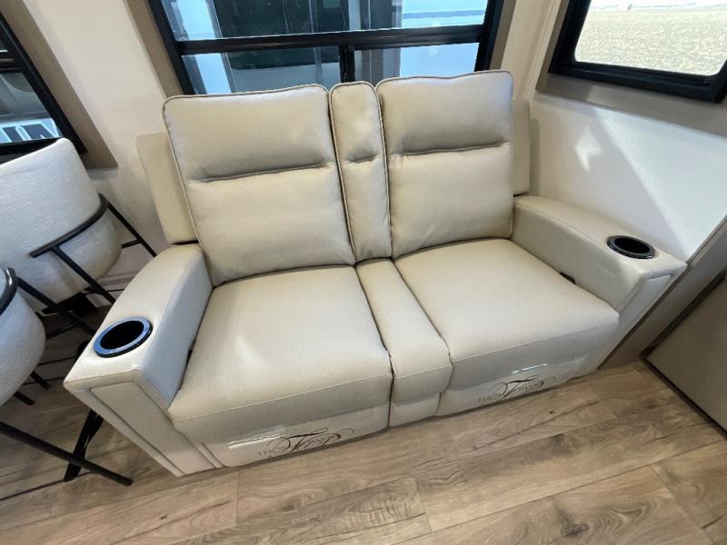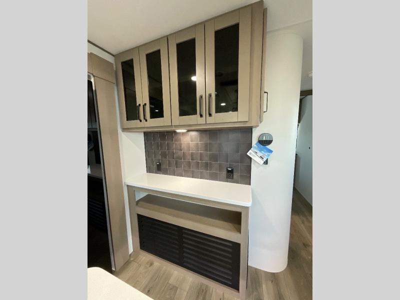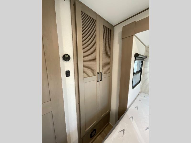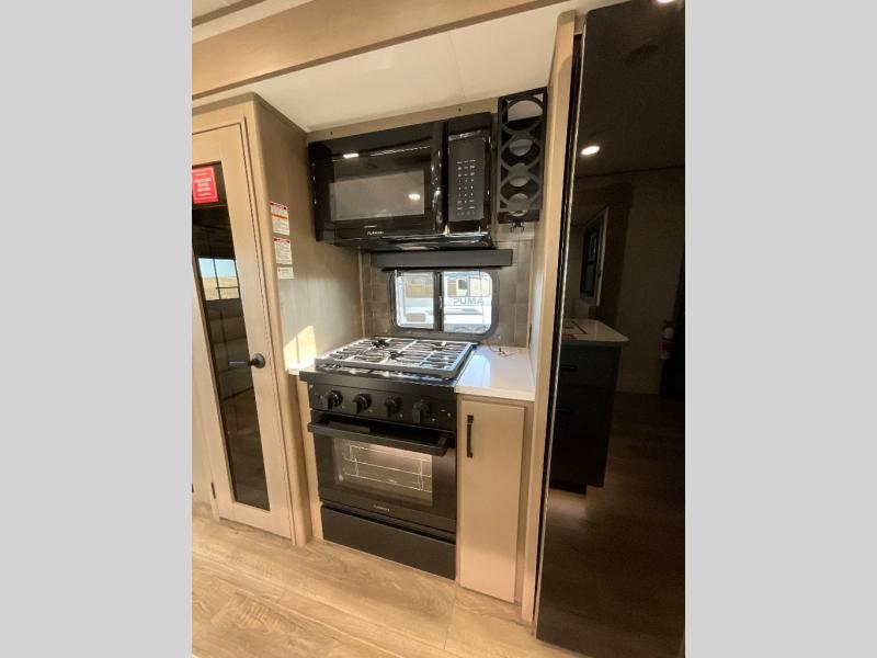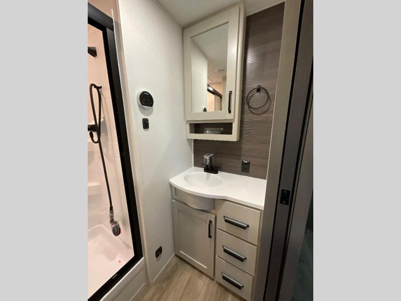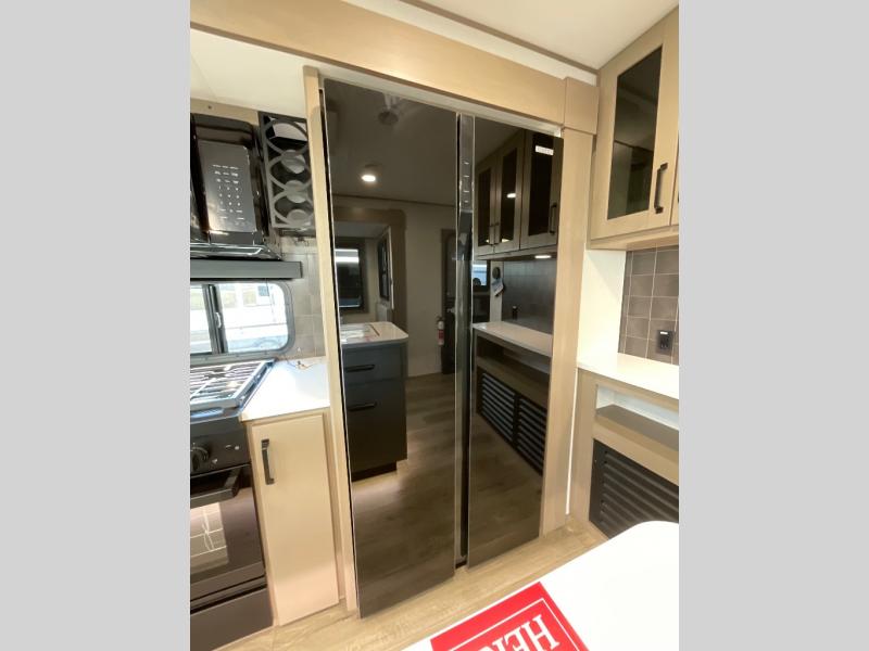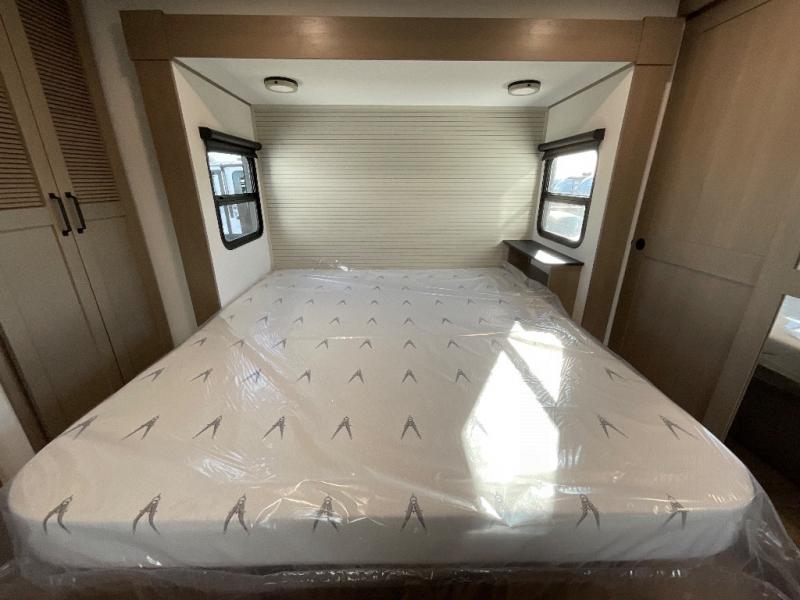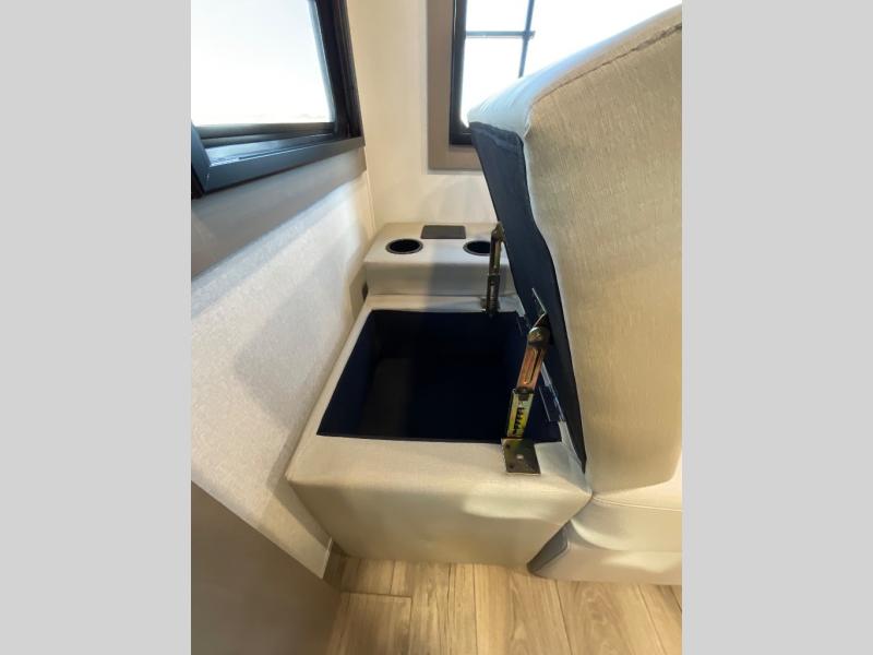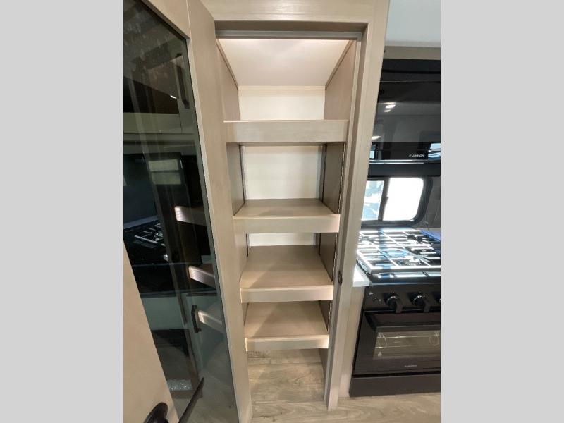 This rear living travel trailer will be perfect for extended stays at the campground or quick weekend trips to the lake! Once you've unloaded your gear from the pass-thru storage, head inside to relax on the rear tri-fold sofa with an adjustable headrest or on the theater seating across from the 40" TV and fireplace. There is also a booth dinette where you can dine together, or you can choose the optional swivel dinette. The spacious kitchen island will make meal time easier than ever, plus there is a pantry and 16 cu. ft. 12V refrigerator for food storage. The full bath is right next to the front private bedroom for easy nighttime use, and speaking of nighttime, you're sure to sleep soundly on the queen bed slide. There is also a large front closet, TV prep, plus washer and dryer prep if you choose to add these appliances.
