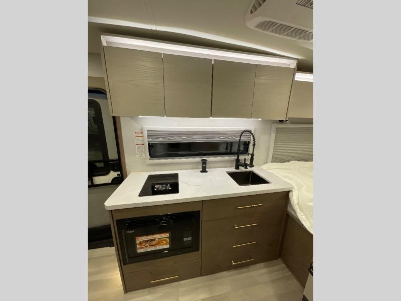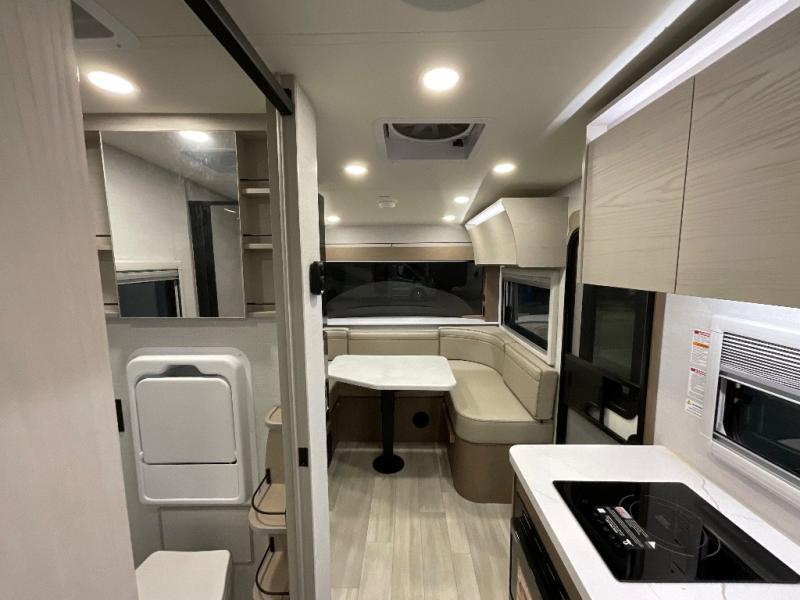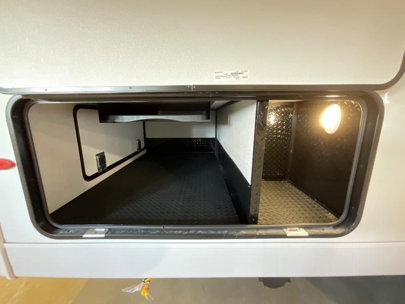 Trips to the lake are made complete in this cozy travel trailer for four. Once you arrive at the campground, you can unload the exterior storage, then start lunch on the induction cooktop and convection microwave. There is a front U-shaped sleeper dinette that will provide dining space and additional sleeping space for guests. This unit includes a private full bath with a shower, toilet, and flip-up bath sink plus some convenient storage for your necessities. You're sure to enjoy sleeping on the rear queen bed that includes wraparound overhead storage for your things!