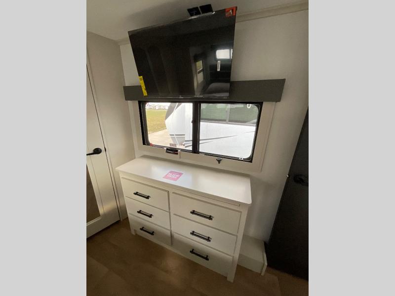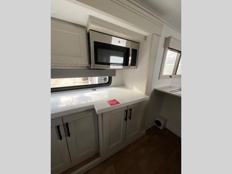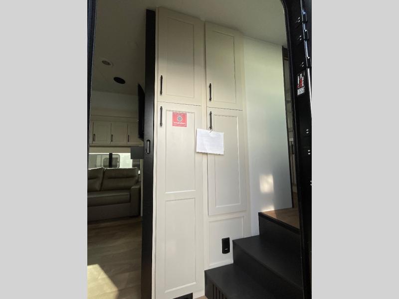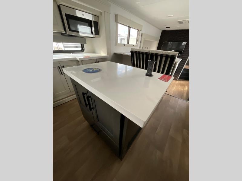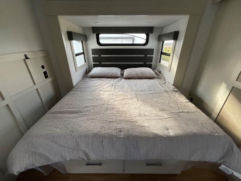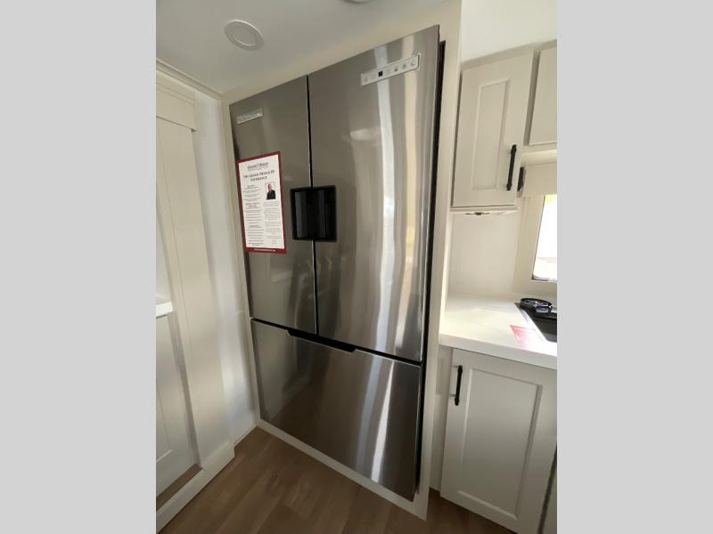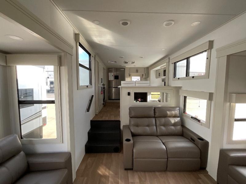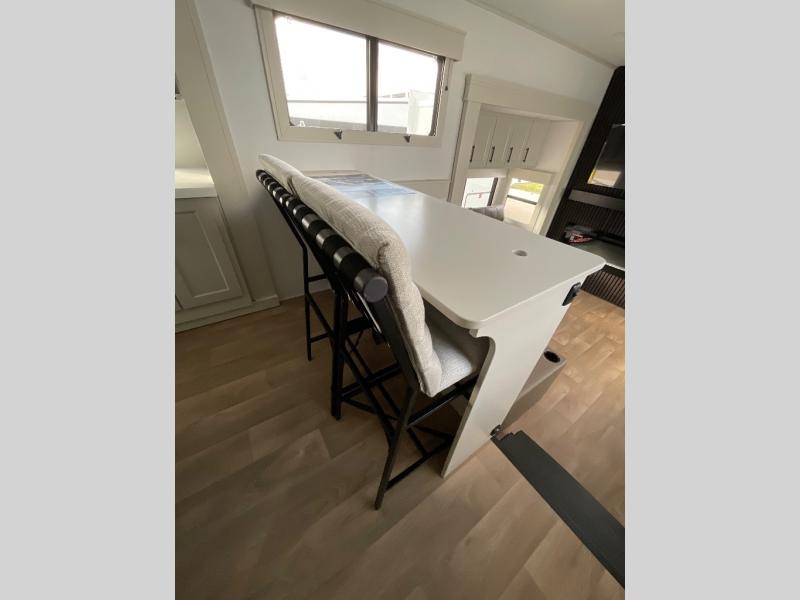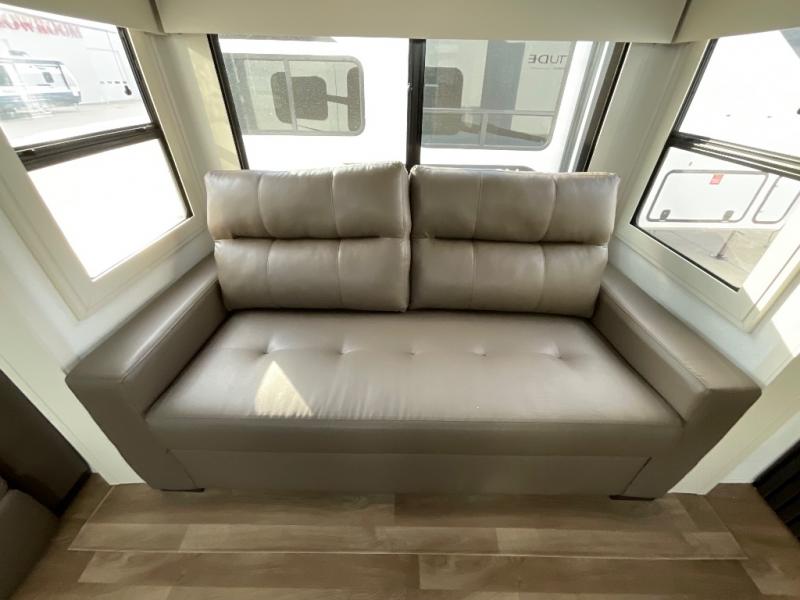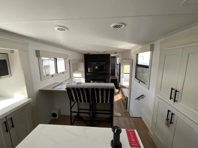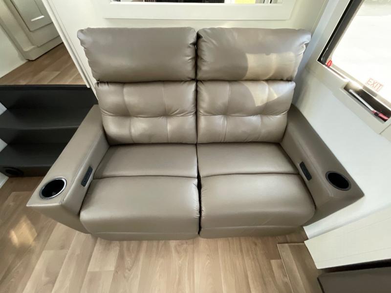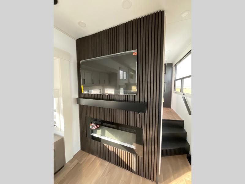 Enjoy each and every vacation, month-long trips, or even extended stays at an RV park in this spacious fifth wheel! The raised rear kitchen gives the cook plenty of room to whip up any type of meal using the stainless steel appliances including a built-in oven, an oversized pantry, and the raised bar top will provide you even more counter space on top of dining with two chairs that overlook the middle living area. Relaxing is made easy thanks to two tri-fold sofas and theatre seating while watching the big game on the LED Smart TV and enjoying the fireplace below. At night, retire to your own queen bed which slides out to provide more floor space, and you can store your clothes in the slide top dresser and front closet with washer and dryer prep.