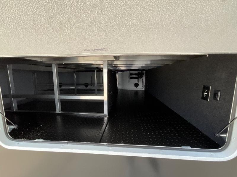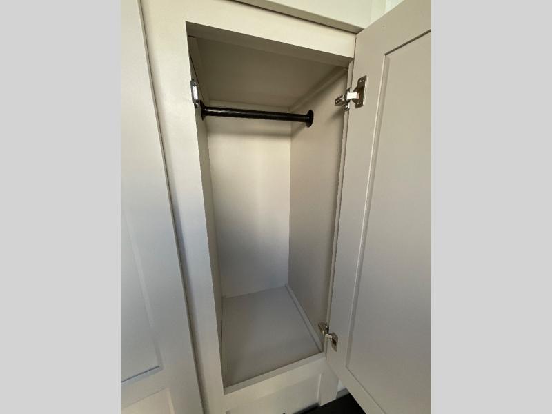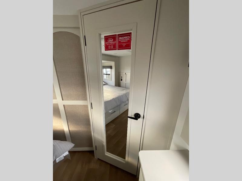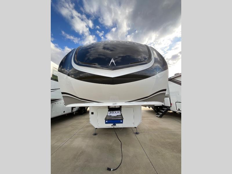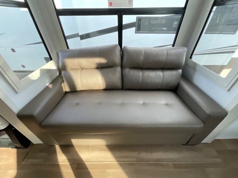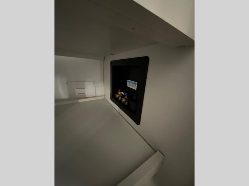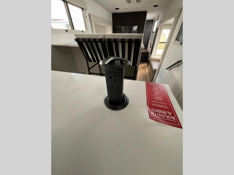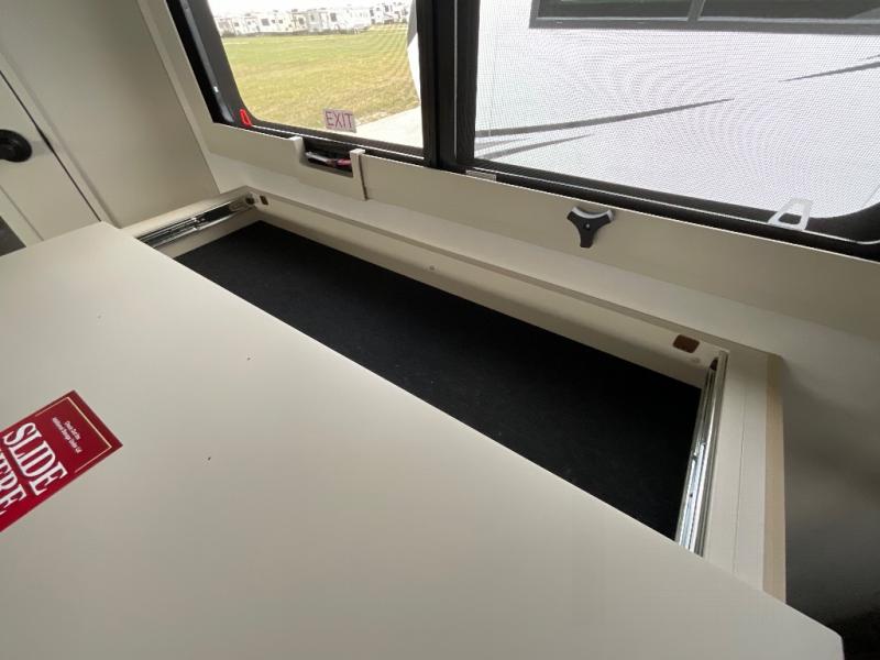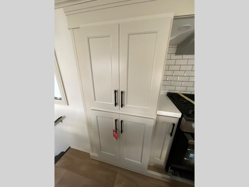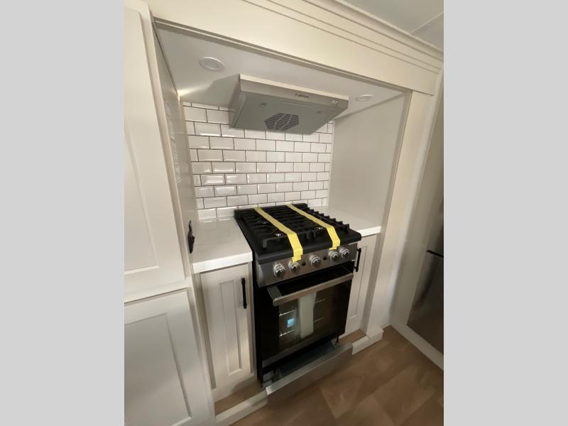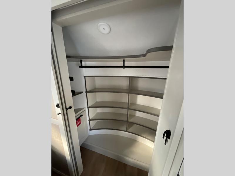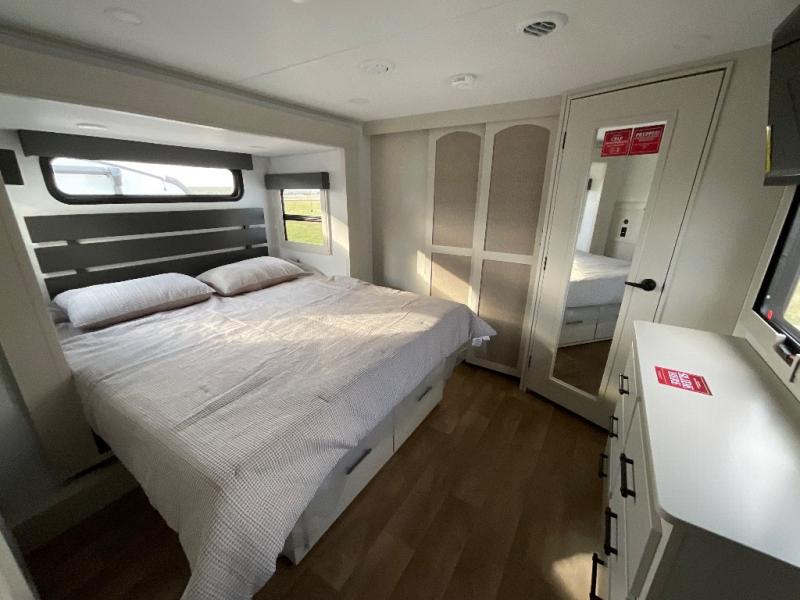 Enjoy each and every vacation, month-long trips, or even extended stays at an RV park in this spacious fifth wheel! The raised rear kitchen gives the cook plenty of room to whip up any type of meal using the stainless steel appliances including a built-in oven, an oversized pantry, and the raised bar top will provide you even more counter space on top of dining with two chairs that overlook the middle living area. Relaxing is made easy thanks to two tri-fold sofas and theatre seating while watching the big game on the LED Smart TV and enjoying the fireplace below. At night, retire to your own queen bed which slides out to provide more floor space, and you can store your clothes in the slide top dresser and front closet with washer and dryer prep.