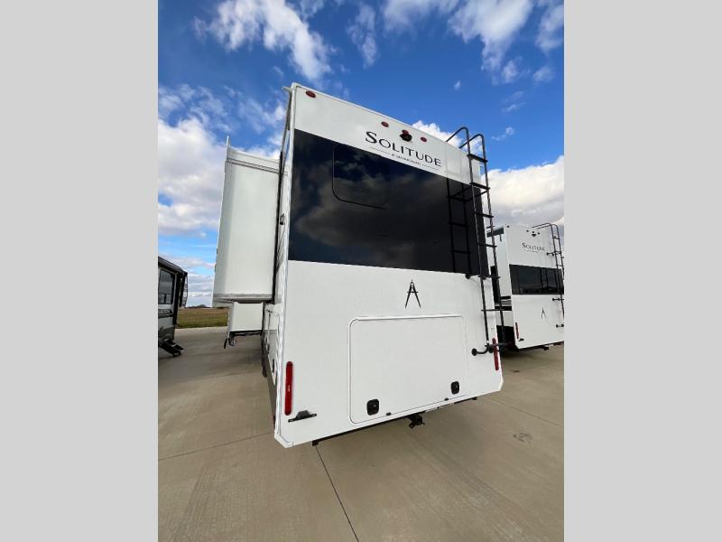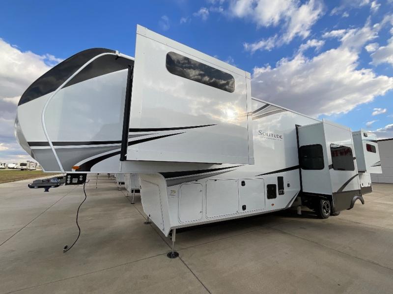 Each Solitude fifth wheel by Grand Design features a 101" wide-body construction, heavy duty 8,000 lb. axles, frameless tinted windows, and high-gloss gel coat sidewalls. You can camp year around thanks to the Weather-Tek Package that includes a 35K BTU high-capacity furnace, an all-in-one enclosed and heated utility center, and a fully enclosed underbelly with heated tanks and storage. Inside, you'll love the premium roller shades, hardwood cabinet doors, solid surface countertops, plus residential finishes throughout to make you truly feel at home. Each model also includes a MORryde CRE3000 suspension system, self adjusting brakes, and a MORryde pin box that will provide smooth towing from home to campground. Affordable luxury is possible with the Solitude fifth wheels; choose yours today!