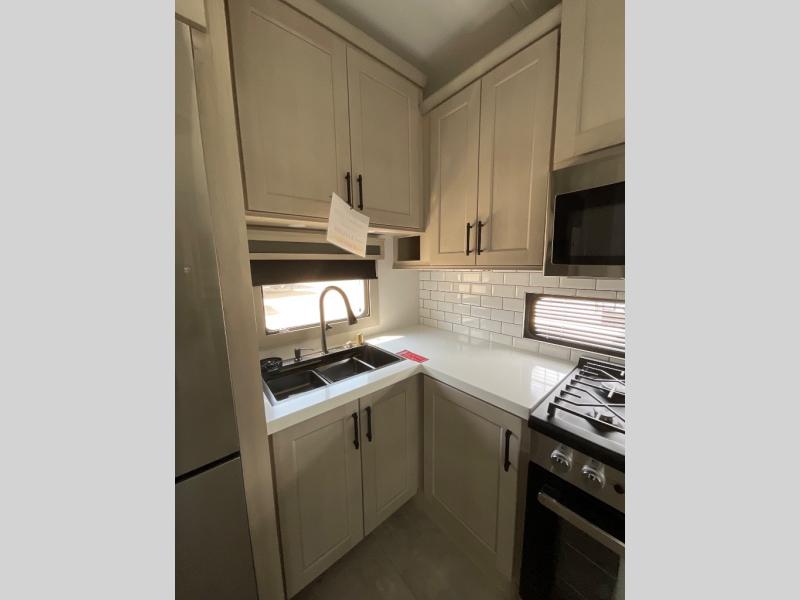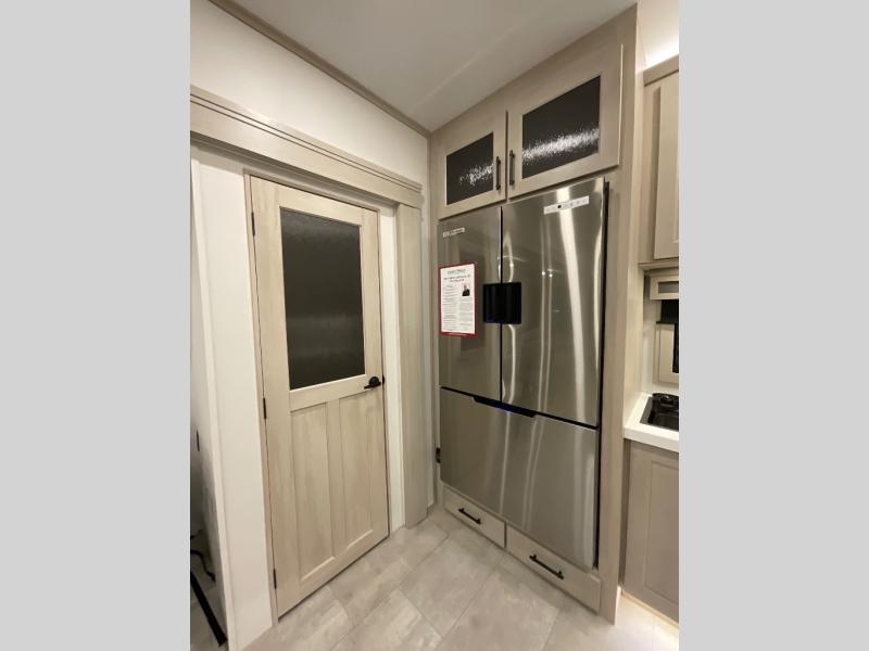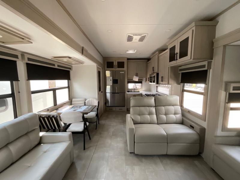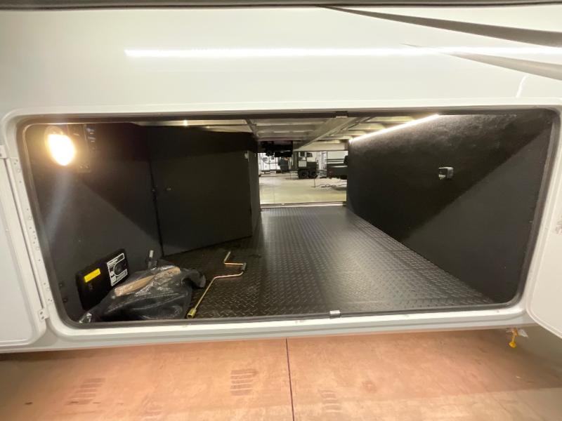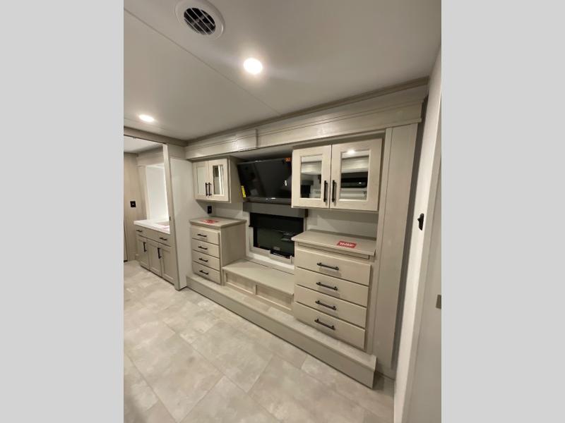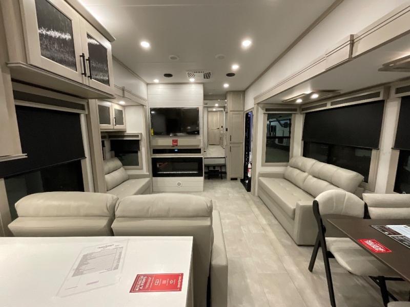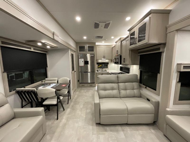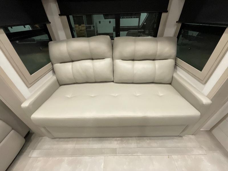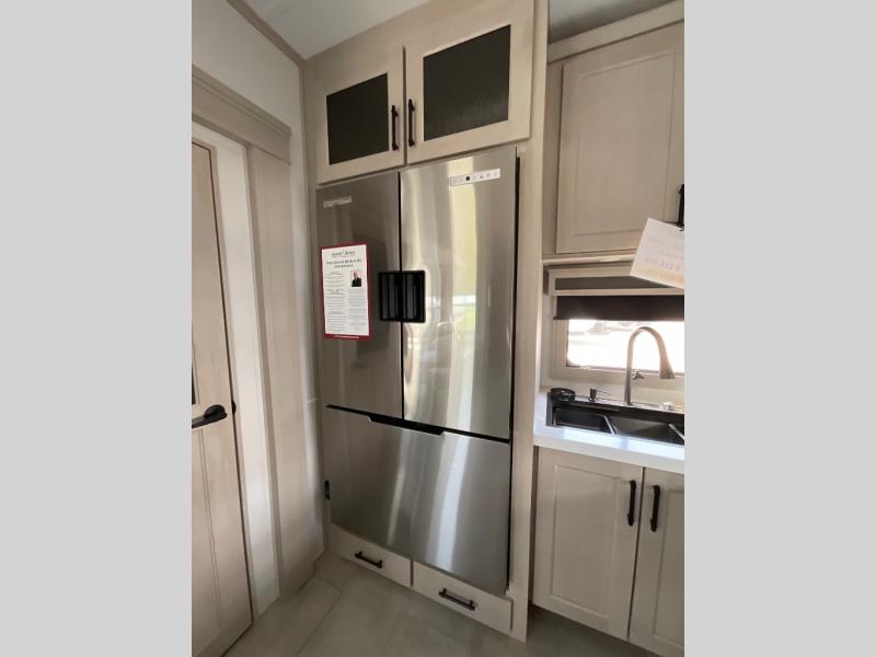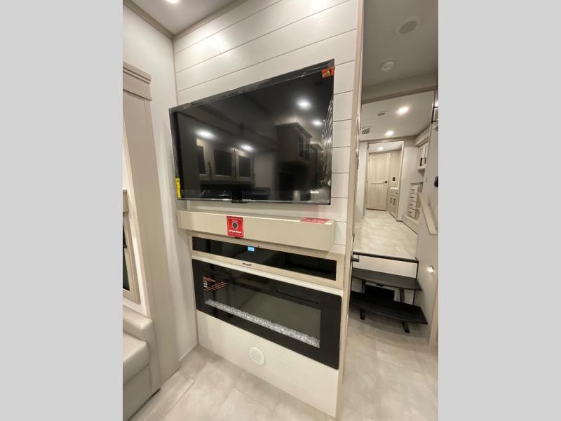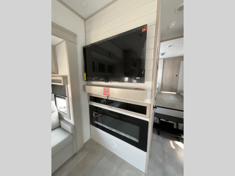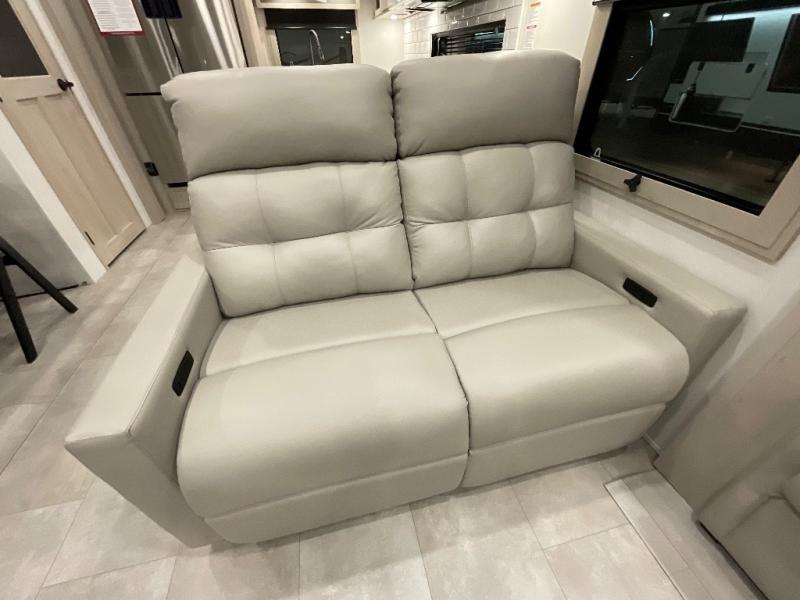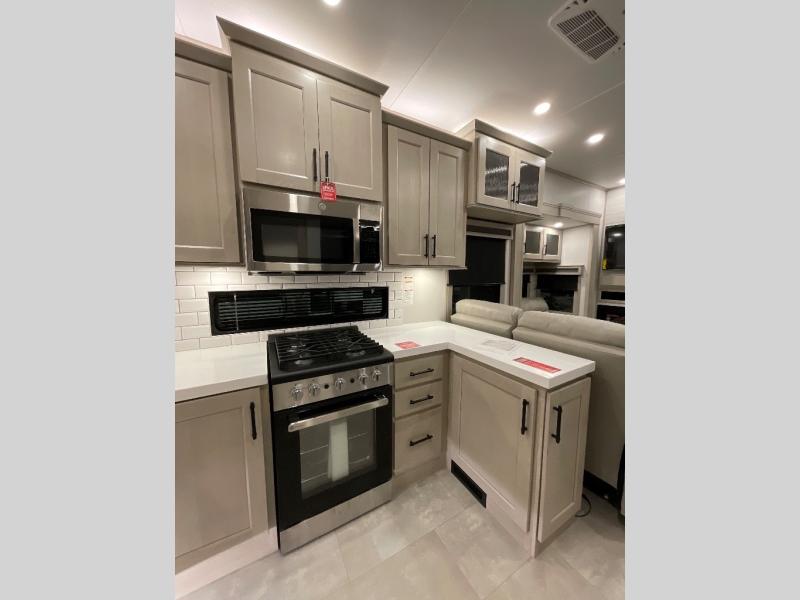 Comfort will come easy in this four slide out fifth wheel! You will feel right at home with a master bedroom that includes a queen bed slide out with a king bed option, dual dressers with a seat in between, plus a large front bath with tons of space. The convenient half bath is right as you enter the unit for convenience. Your crew can get cozy on the dual tri-fold sofas within dual opposing slides, or on the theater seating across from the LED TV and fireplace. One feature you will love about this fifth wheel is the rear kitchen with wrap-around counter space, a built-in oven, plus a 20 cu. ft. 12V refrigerator and a large pantry to keep food fresh.