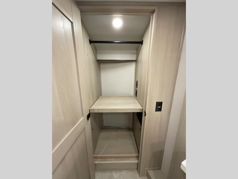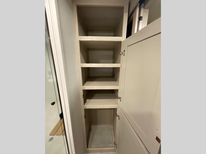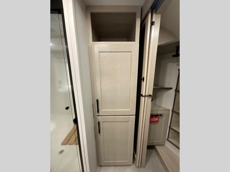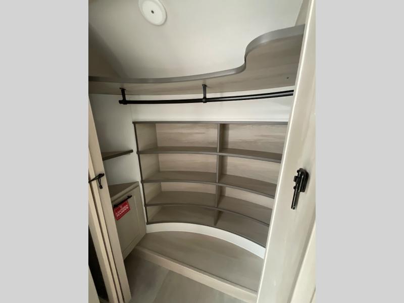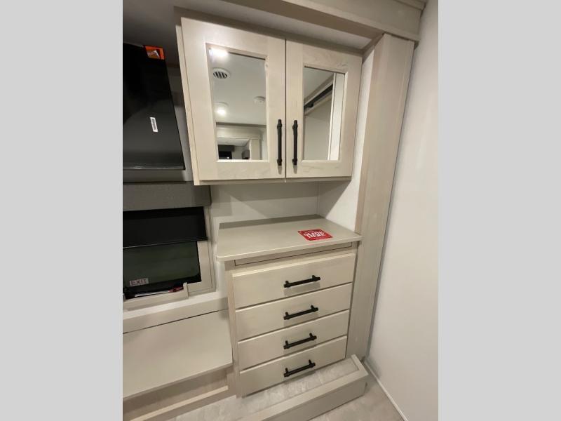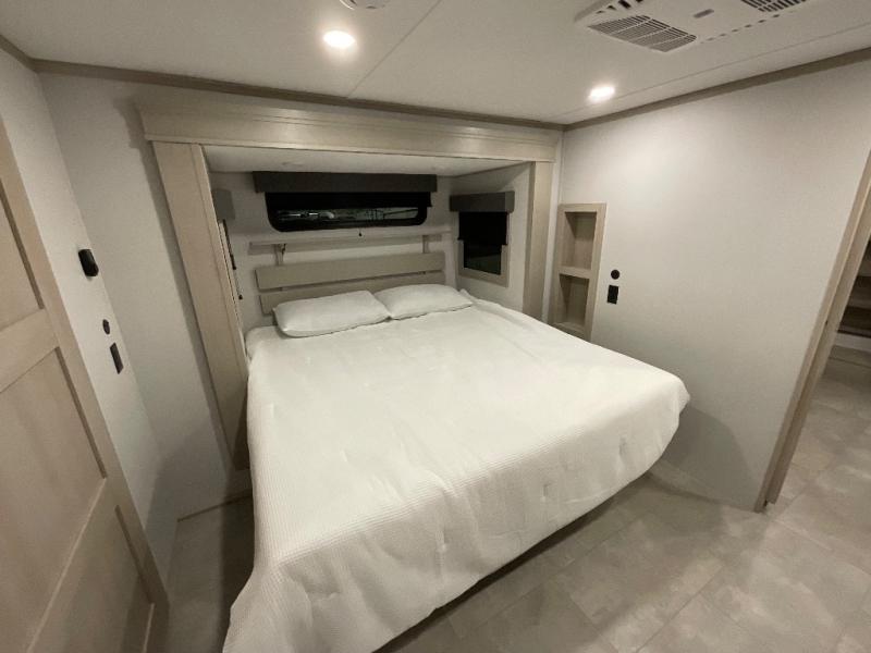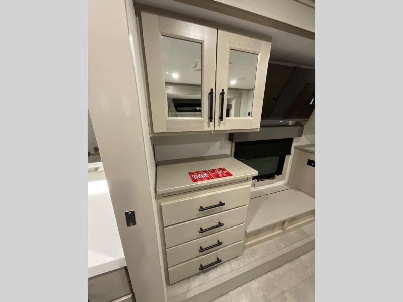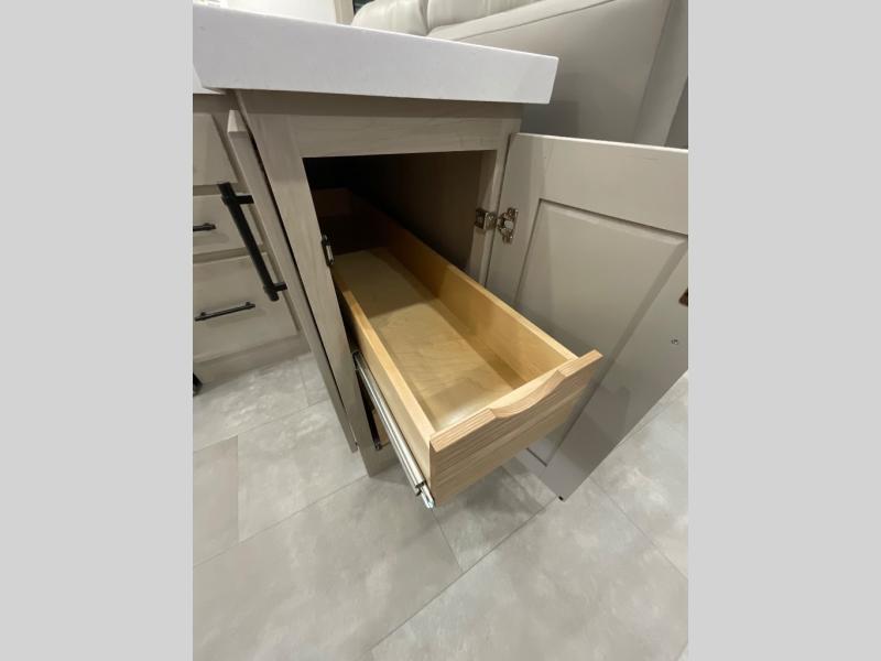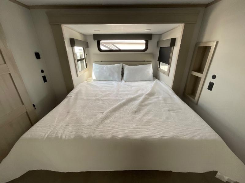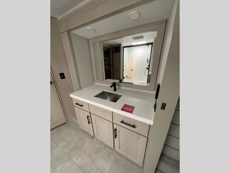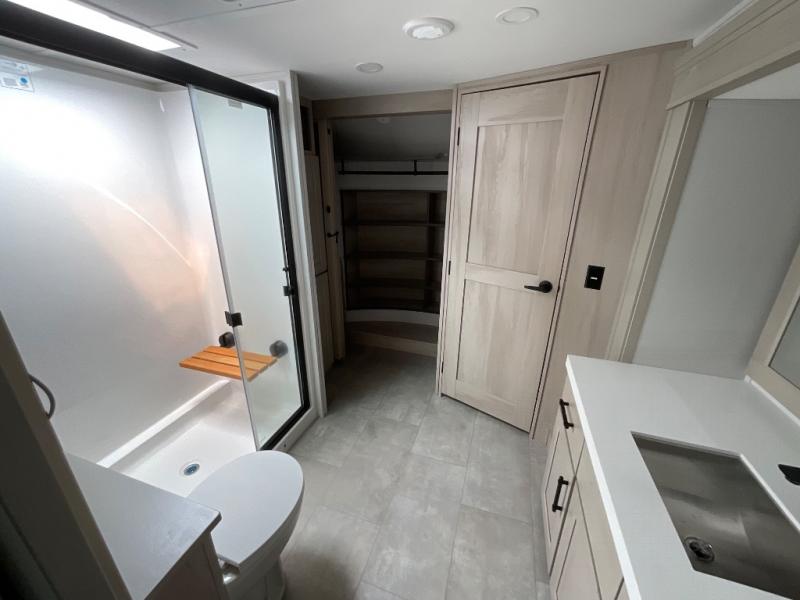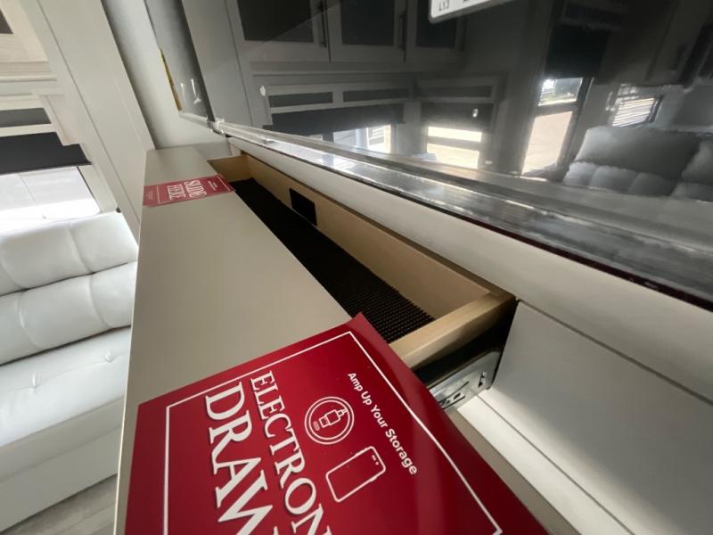 Comfort will come easy in this four slide out fifth wheel! You will feel right at home with a master bedroom that includes a queen bed slide out with a king bed option, dual dressers with a seat in between, plus a large front bath with tons of space. The convenient half bath is right as you enter the unit for convenience. Your crew can get cozy on the dual tri-fold sofas within dual opposing slides, or on the theater seating across from the LED TV and fireplace. One feature you will love about this fifth wheel is the rear kitchen with wrap-around counter space, a built-in oven, plus a 20 cu. ft. 12V refrigerator and a large pantry to keep food fresh.