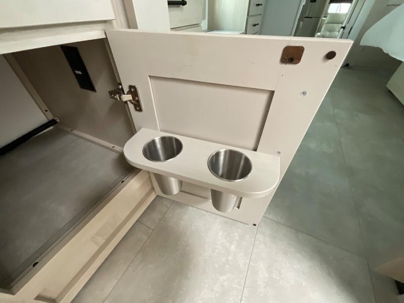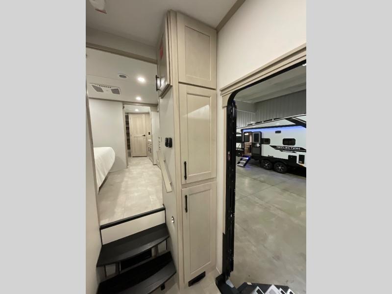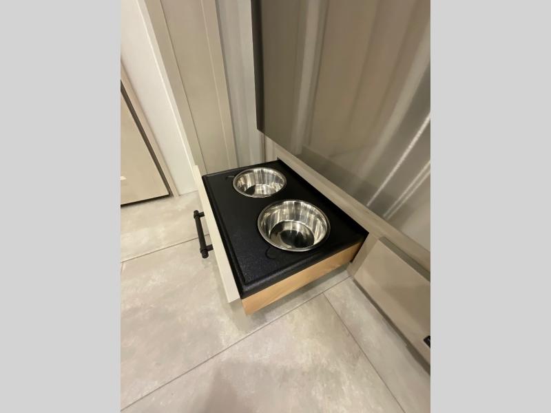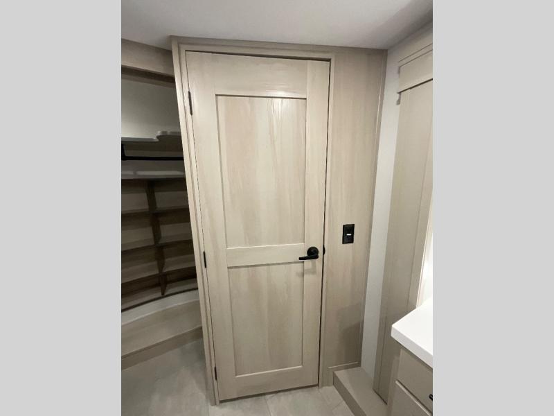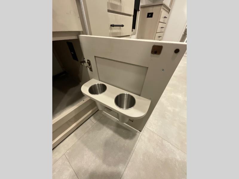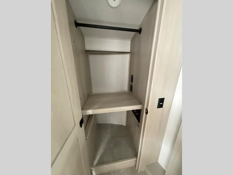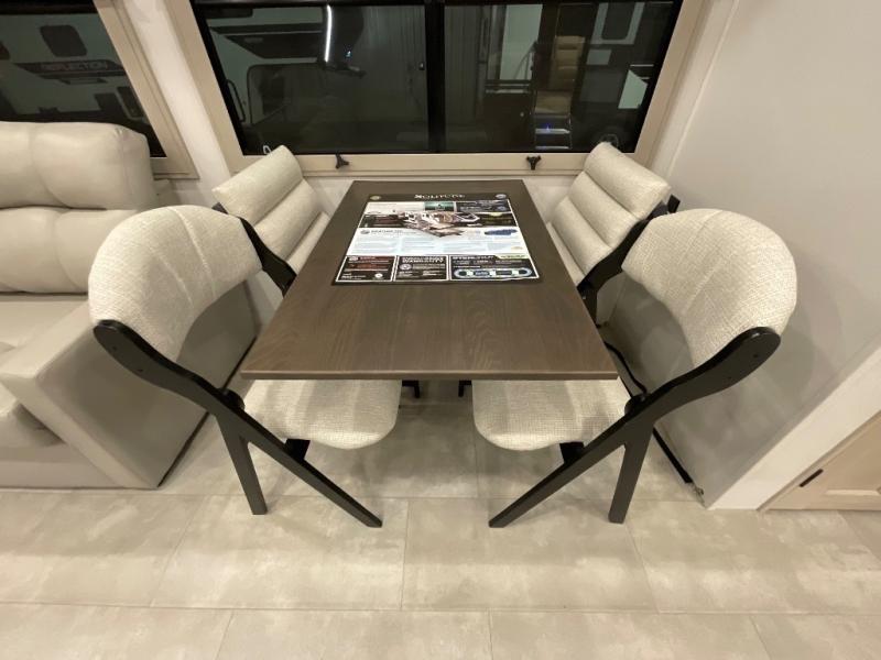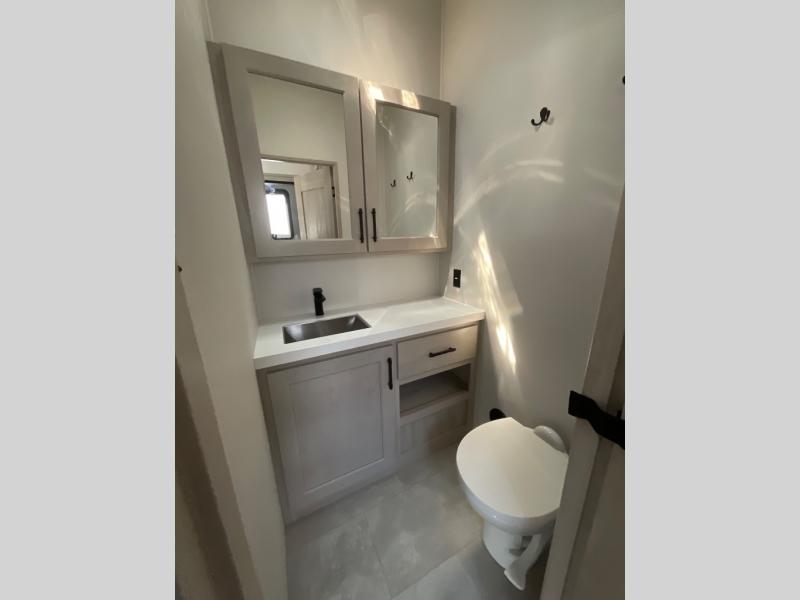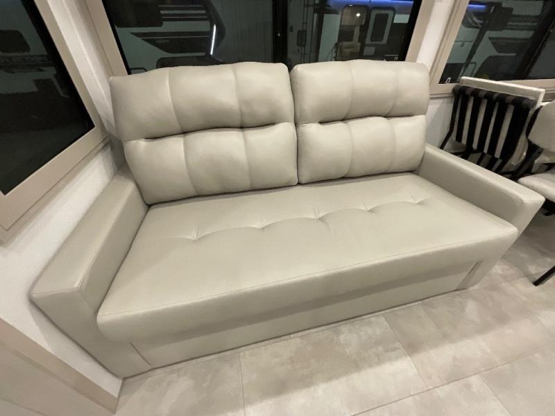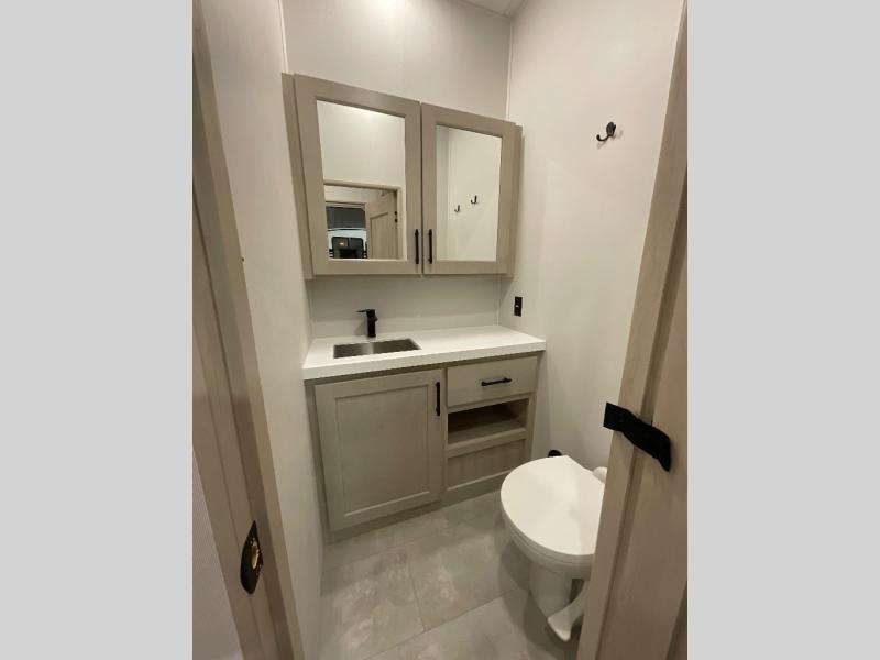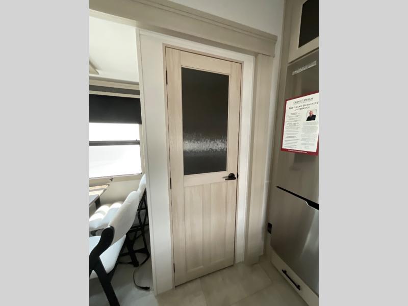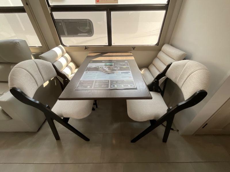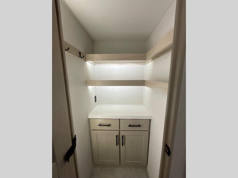 Comfort will come easy in this four slide out fifth wheel! You will feel right at home with a master bedroom that includes a queen bed slide out with a king bed option, dual dressers with a seat in between, plus a large front bath with tons of space. The convenient half bath is right as you enter the unit for convenience. Your crew can get cozy on the dual tri-fold sofas within dual opposing slides, or on the theater seating across from the LED TV and fireplace. One feature you will love about this fifth wheel is the rear kitchen with wrap-around counter space, a built-in oven, plus a 20 cu. ft. 12V refrigerator and a large pantry to keep food fresh.