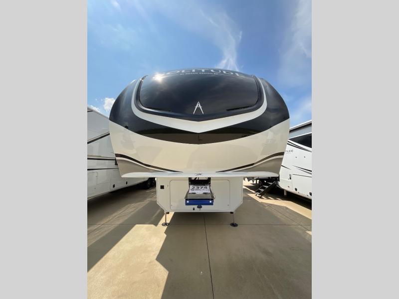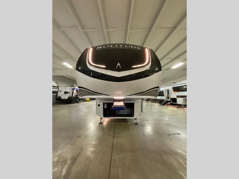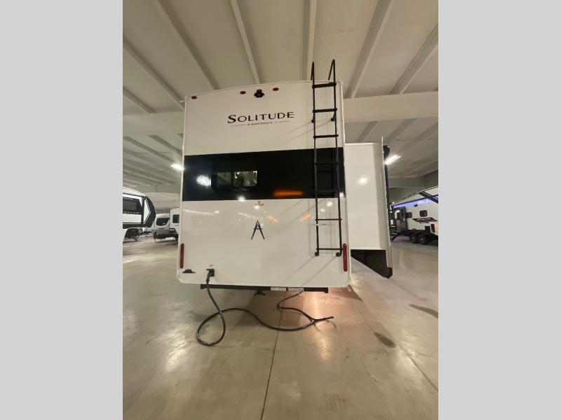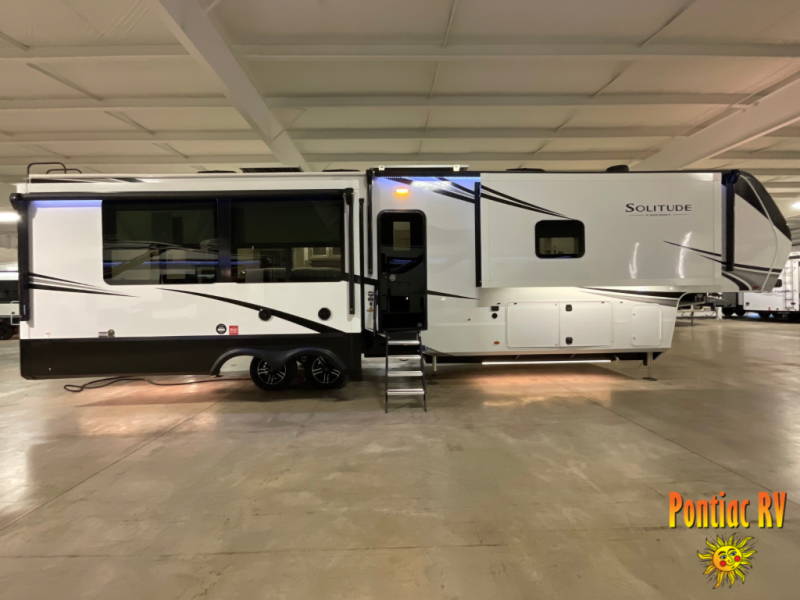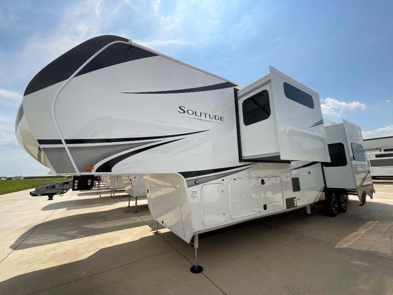 Each Solitude fifth wheel by Grand Design features a 101" wide-body construction, heavy duty 8,000 lb. axles, frameless tinted windows, and high-gloss gel coat sidewalls. You can camp year around thanks to the Weather-Tek Package that includes a 35K BTU high-capacity furnace, an all-in-one enclosed and heated utility center, and a fully enclosed underbelly with heated tanks and storage. Inside, you'll love the premium roller shades, hardwood cabinet doors, solid surface countertops, plus residential finishes throughout to make you truly feel at home. Each model also includes a MORryde CRE3000 suspension system, self adjusting brakes, and a MORryde pin box that will provide smooth towing from home to campground. Affordable luxury is possible with the Solitude fifth wheels; choose yours today!