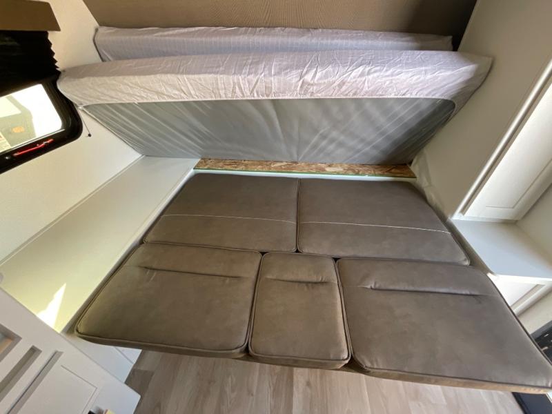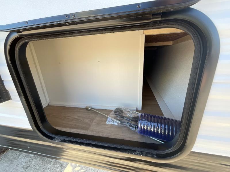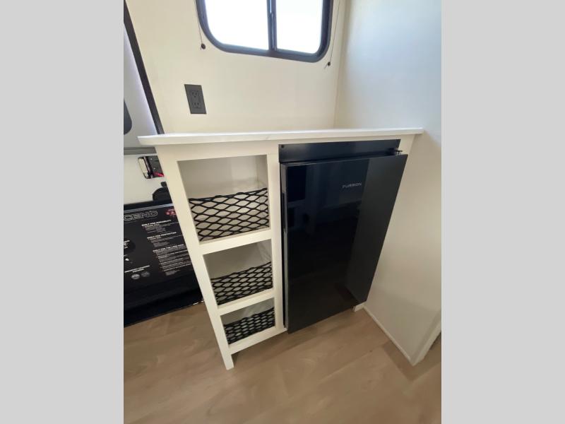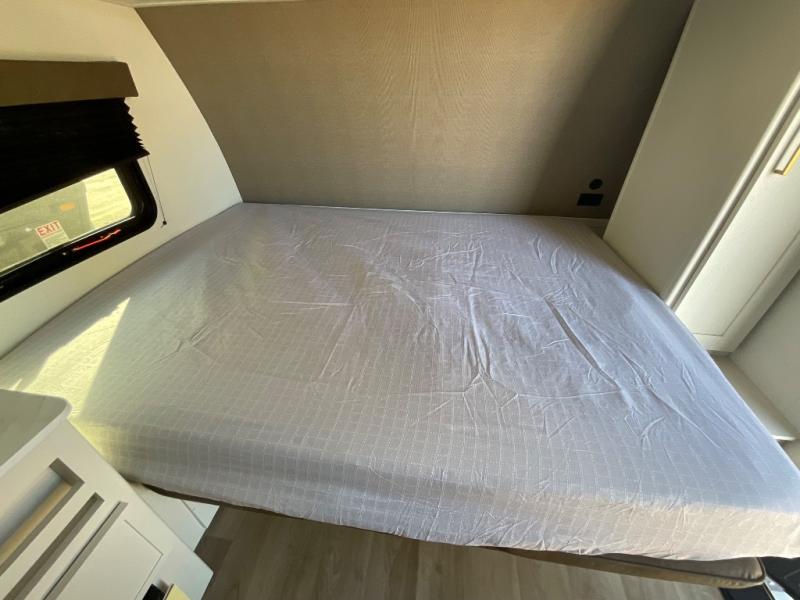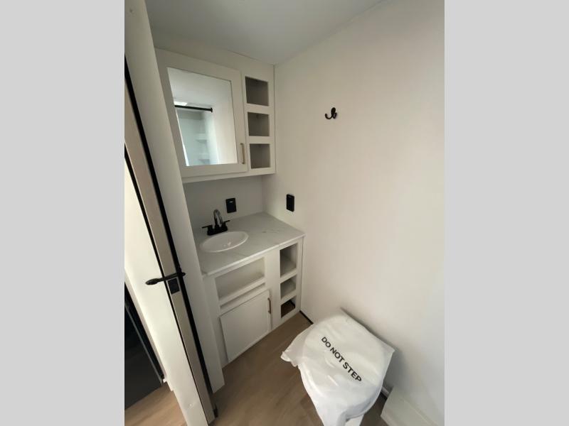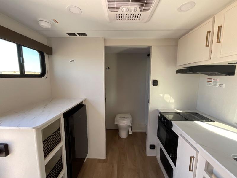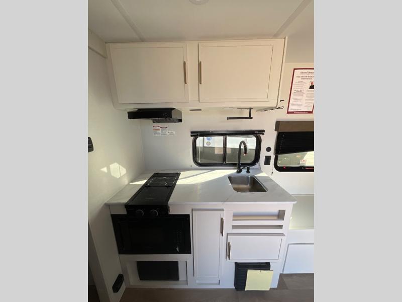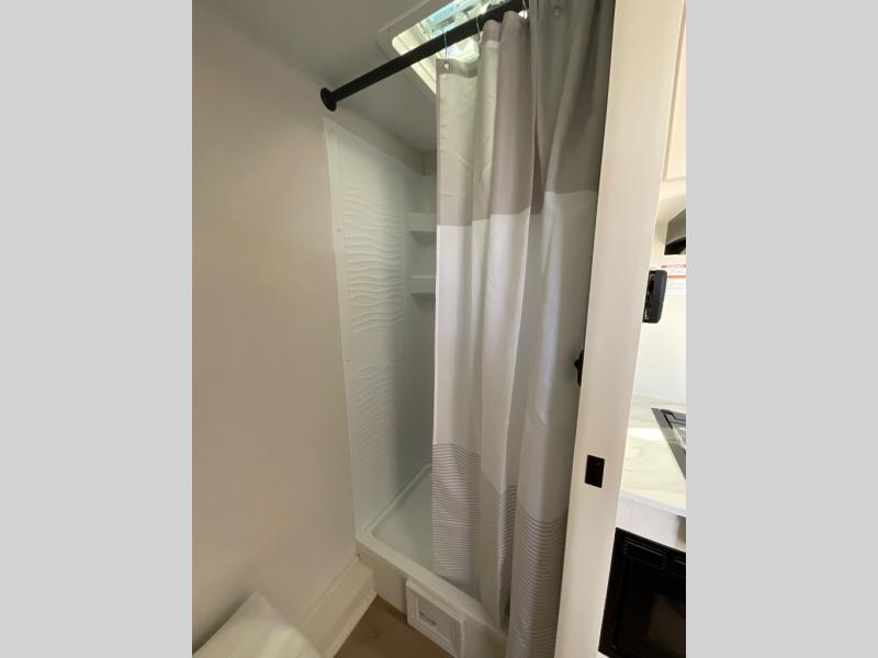Travel in this model and step inside through the sturdy aluminum entry steps and you'll be greeted by a versatile 60" x 80" Murphy bed that doubles as a comfortable seating area during the day. In the center, the kitchen offers all the essentials for preparing a delicious meal, featuring a microwave, 2-burner range, 3.3 cu. ft. refrigerator, and overhead cabinets for added storage. At the rear, enjoy the convenience of a full bathroom complete with a walk-in shower and foot-flush toilet, making life on the road both comfortable and functional.