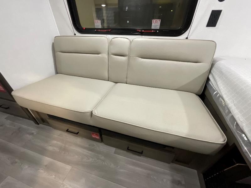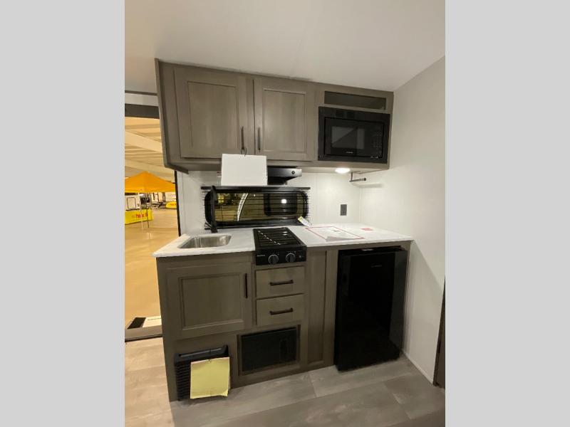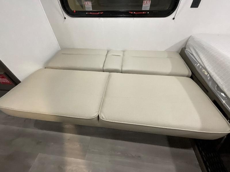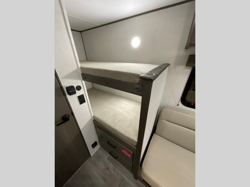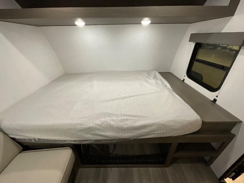 Camping trips to the lake have never been easier than with this travel trailer! The 28" x 67" bunks are right next to the private bath for easy nighttime use, and the front queen bed includes hidden storage for your things. There is also a 66" Jack knife sofa that provides a little more sleeping space for guests. A full kitchen lets you cook meals each day and there is an exterior LP quick connect if you want to fire up your own propane grill.