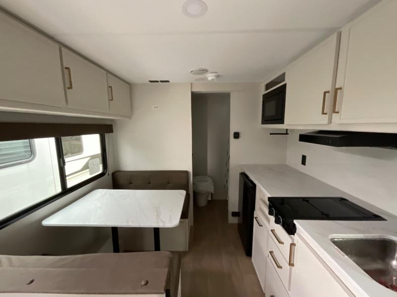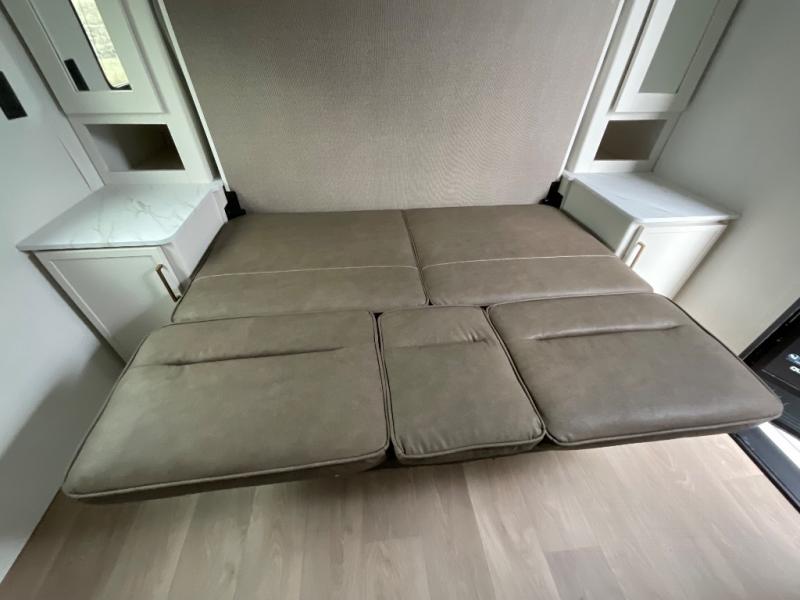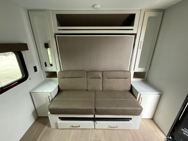 This is the perfect couple's trailer with versatile seating and sleeping space! You'll find a queen-size Murphy bed up front with storage space beside and above plus a full rear bath for added privacy. Once you've made lunch in the full kitchen, you can dine at the booth dinette or take your plate outdoors to sit under the 10' power awning. You'll also find pass-thru storage outside that will be perfect for fishing poles, lawn chairs, tools and more!