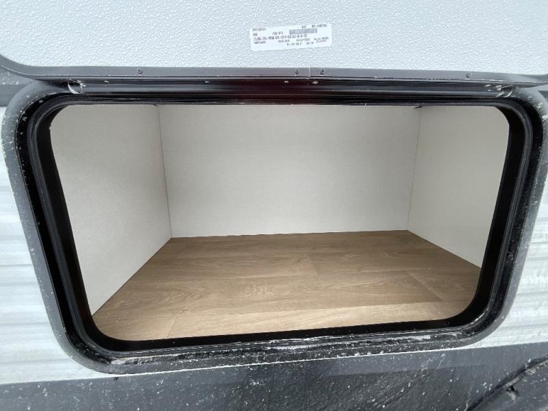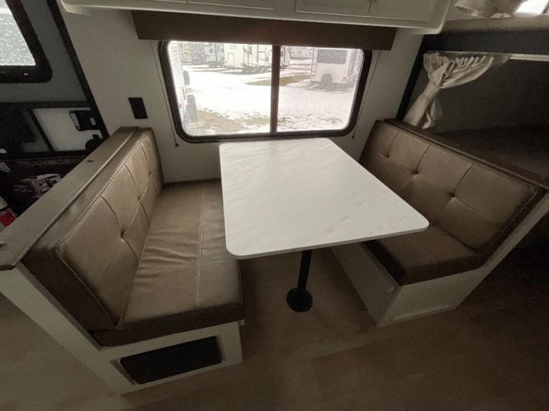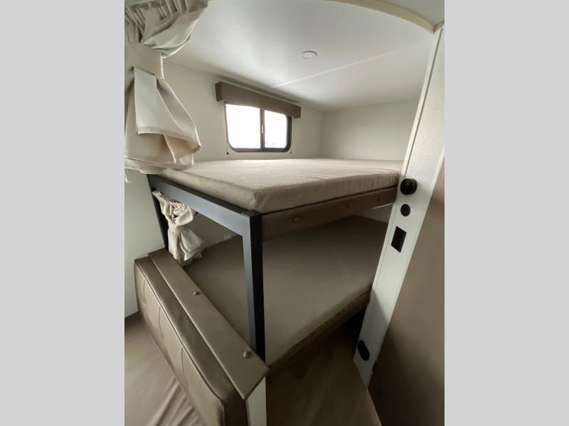 Camping trips are made complete in this travel trailer that can sleep seven each night! The little ones or your guest will love sleeping on the double-size bunks, while you take the queen bed in the front semi-private bedroom with a privacy curtain. A three-burner range and microwave oven will let you make meals each day, and a booth dinette provides a place to dine together. There are also convenient features found here, such as a pull-out pet dish and pull-out trash can, and there is ample storage space for your belongings. You will also appreciate the full bath that will let you stay clean throughout your trip without having to leave your trailer!