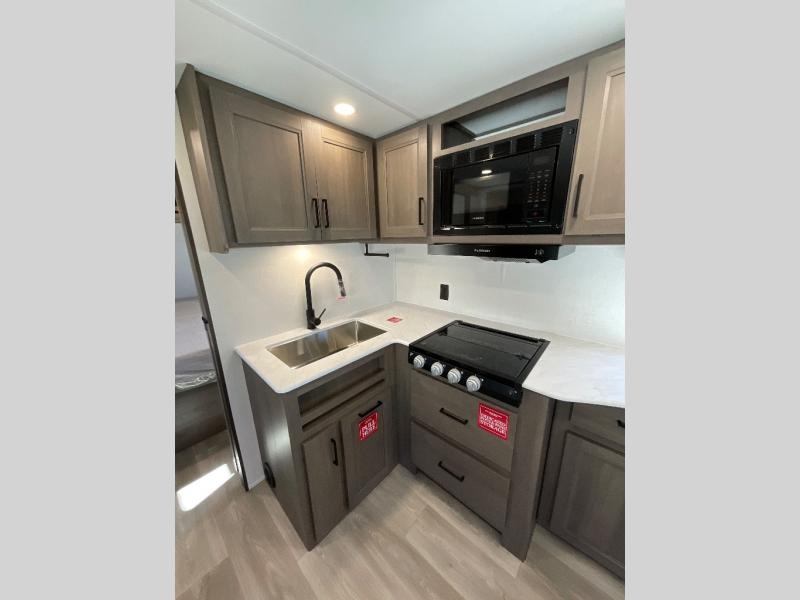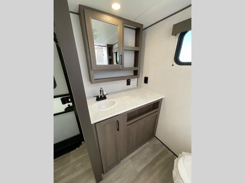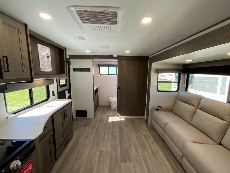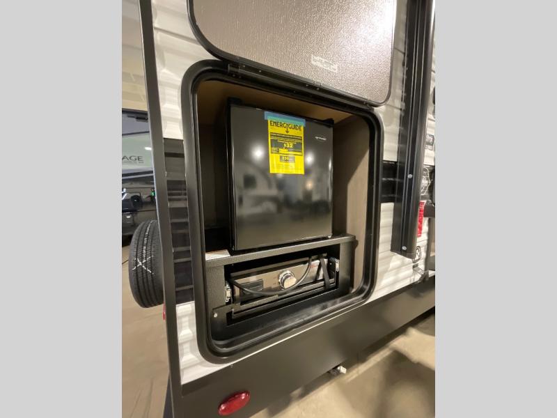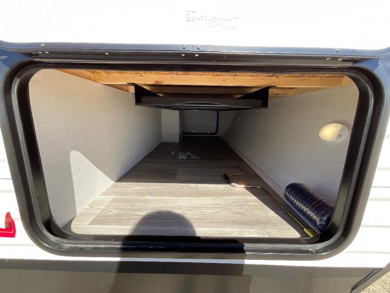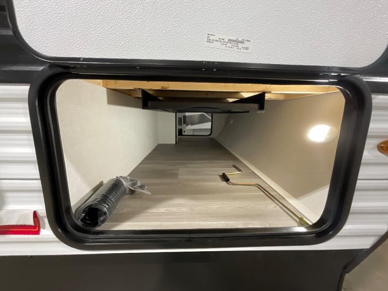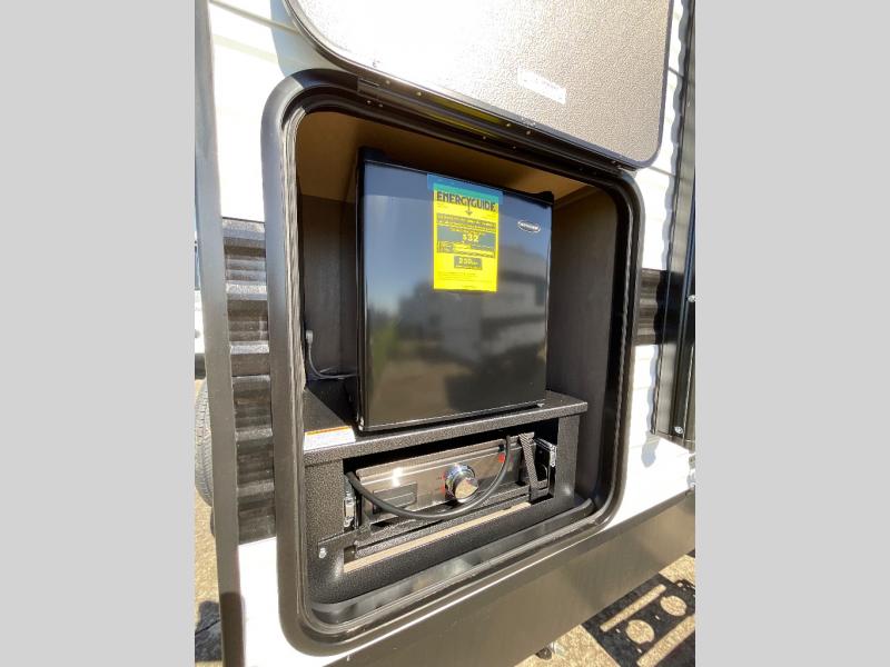 Pack your bags and head for the campground in this spacious travel trailer! Once you arrive, you can unload the pass-thru storage, then make lunch on the exterior griddle with a 1.7 cu. ft. exterior refrigerator. The U-shaped dinette slide will provide a place to dine if you decide not to stay outside under the 16' power awning. Optional theater seats can be chosen in place of the dinette for even more comfort! You'll sleep soundly on the queen bed in the front bedroom, and the full rear bath lets you freshen up each day.