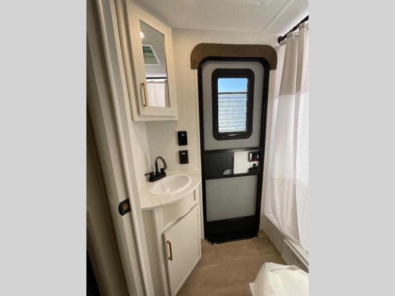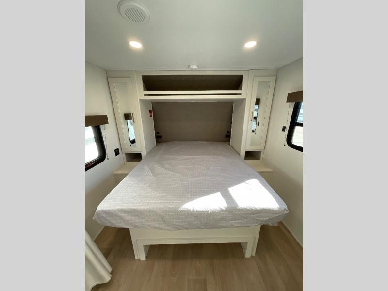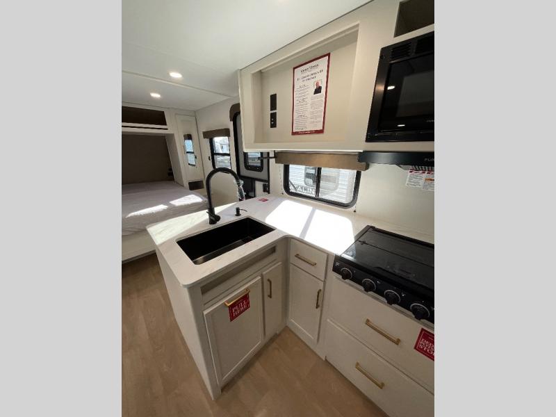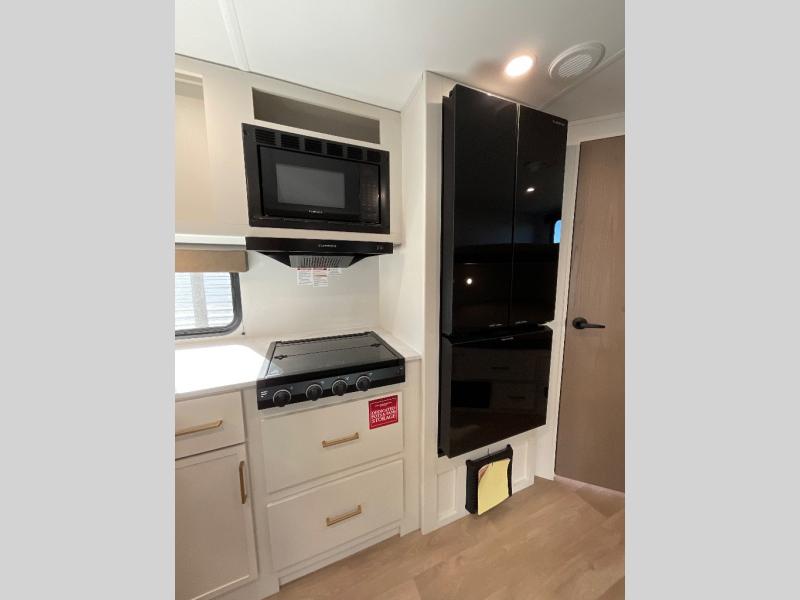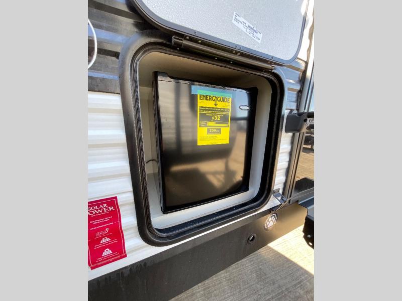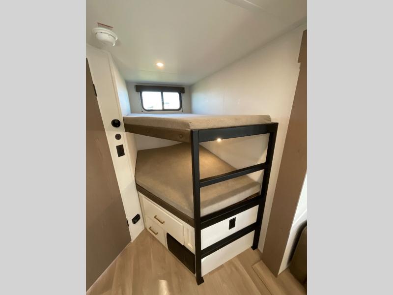 This fantastic travel trailer is designed to provide the ultimate in comfort, convenience, and adventure! The double-size bunk beds are perfect for kids, providing ample sleeping space and an under-bed storage space for all your belongings. The full bathroom features a linen closet, providing convenient storage for towels and toiletries. In the kitchen area, the U-shaped dinette is a great spot for creating memories that will last a lifetime, the refrigerator keeps your food and drinks fresh, while the microwave provides a quick and easy way to prepare meals. And for major convenience, the pull-out trash makes cleaning up a simple task. Take a nap in the comfortable front queen bed, which is a serene retreat, providing a comfortable spot to rest and relax. Jump to the exterior in a comfortable way with the double entry/exit door providing added convenience and flexibility, while the exterior awning provides shade and protection from the elements. The pass-through storage offers ample space for your outdoor gear and equipment.