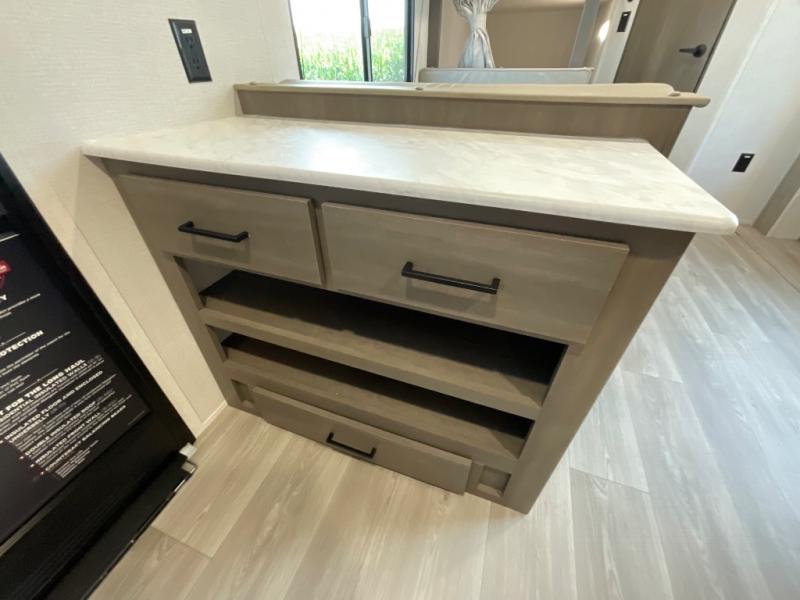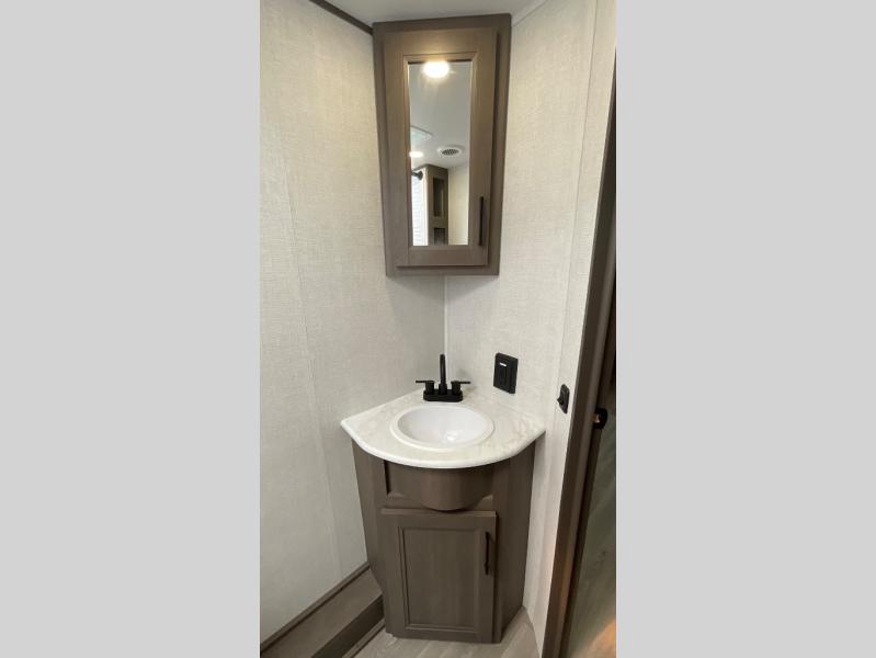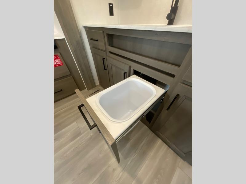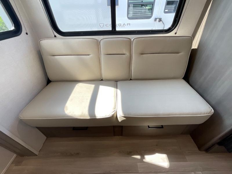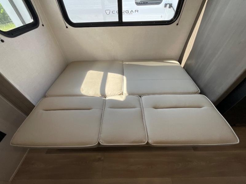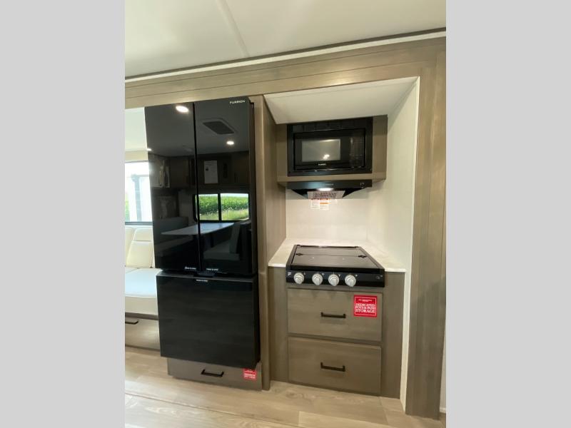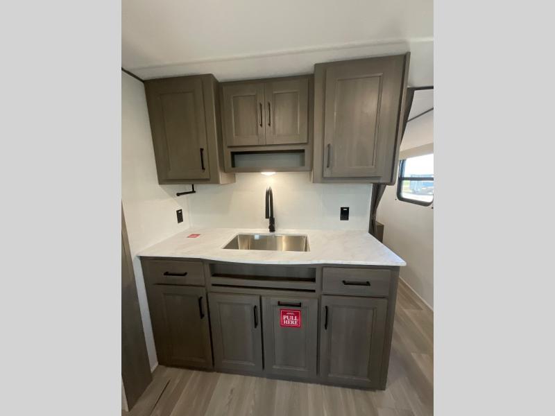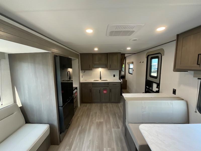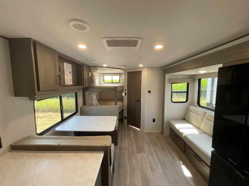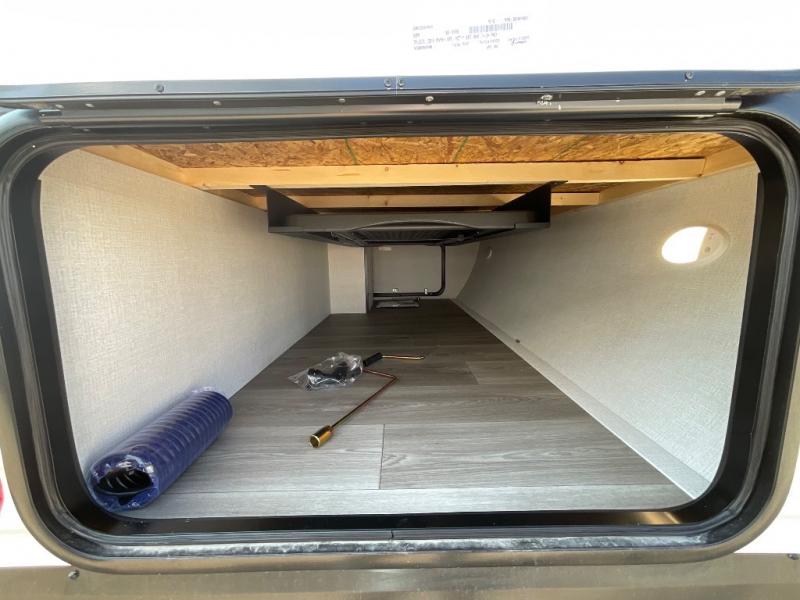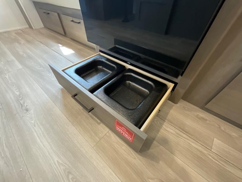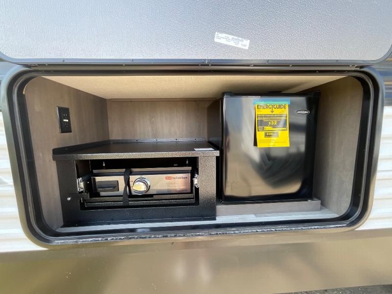 Camping with your larger family or when you want to take along a few extra friends is easy with this trailer. This unit sleeps nine with the double-size bunks in the rear corner, the 60" roll over sofa, and the queen bed in the front semi-private bedroom. The booth dinette can also be used to sleep a guest or two little ones at night once converted. Prepare your meals on the three-burner cooktop indoors, or out on the two-burner cooktop at the outside kitchen! You'll also find a handy exterior spray port and an outdoor refrigerator for cold drinks! It will be so easy to fill the dog's food bowl with the added pet dish under the refrigerator, and the full bath in this model means you don't have to use the camp's facilities. Having a 17' awning outside along with a large unobstructed pass-through compartment allows you extended living outdoors and plenty of space for all of your gear!