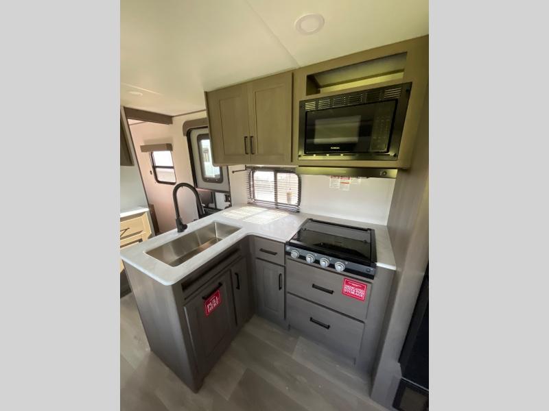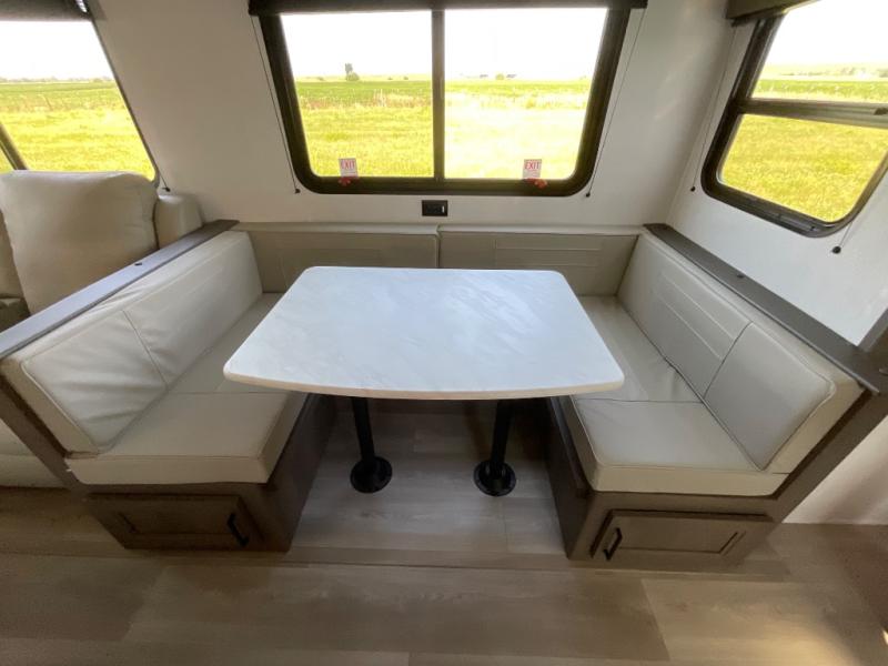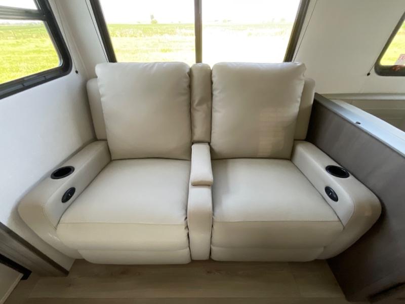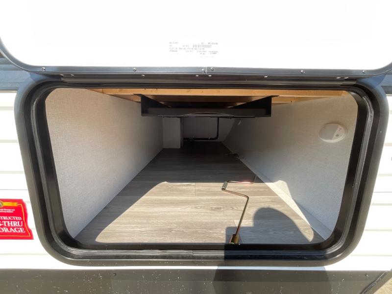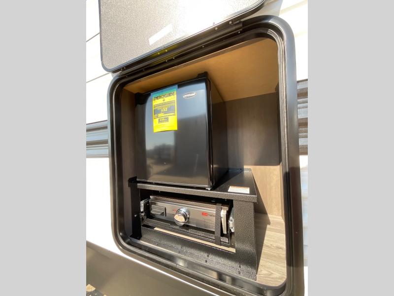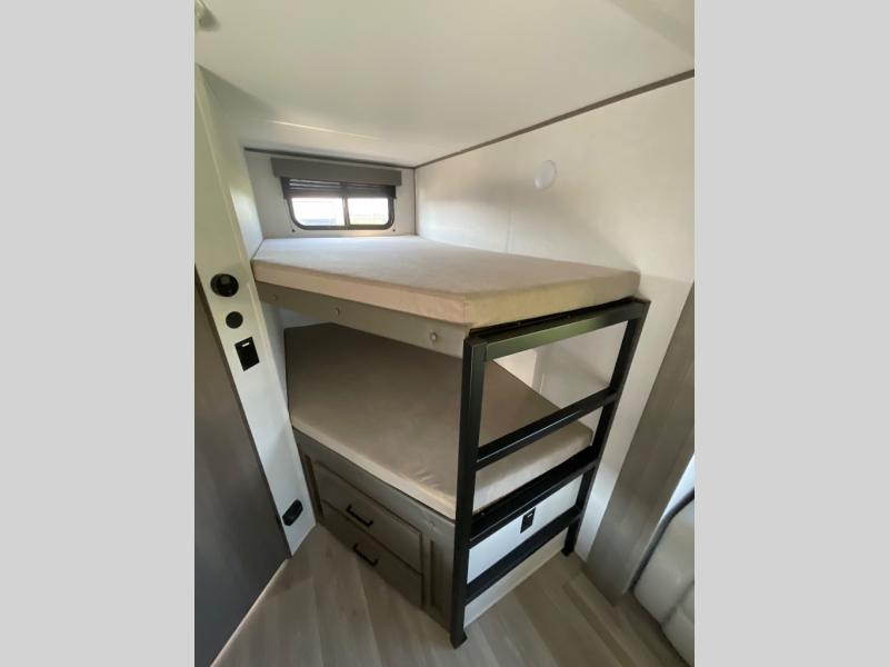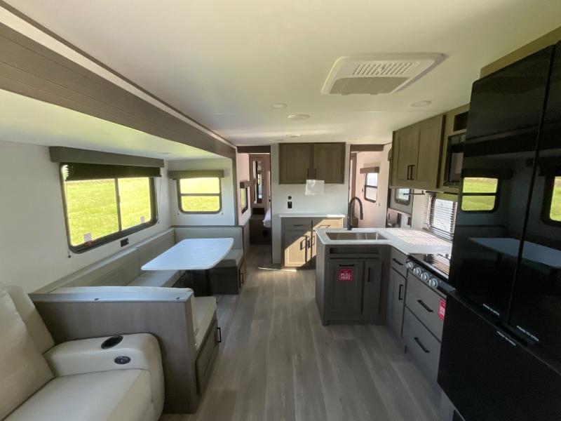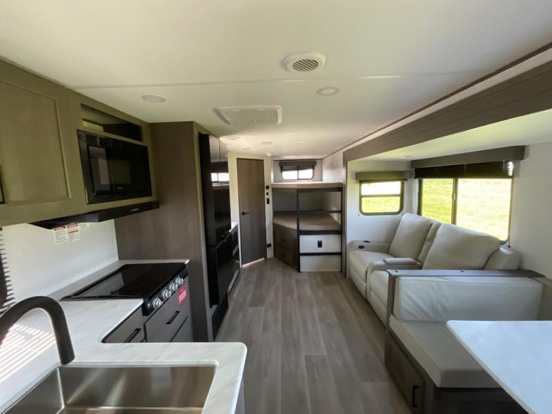 Get ready to take your travels to new heights with our incredible luxury travel trailer! The front bedroom has a queen bed, wardrobe, and overhead cabinets for all your favorite belongings, the perfect place to relax and recharge after a long day of adventure. The living room/kitchen combined area is equipped with a U-shaped dinette, three-burner cooktop, microwave, refrigerator, pantry, and 62” theater seating. Perfect for cooking up your favorite meals, entertaining friends and family, or simply relaxing and enjoying the comforts of home. The full bathroom is spacious and complete with a linen closet for added convenience. And with double-sized bunk beds featuring curtains and under-bunk storage, the kids will have their cozy retreat. But the adventure doesn't stop there! Outside, you'll find an exterior griddle with a 1.7 refrigerator, perfect for cooking up a storm in the great outdoors. And with a massive 19’ awning, you'll have plenty of shade and protection from the elements, plus, with two entry/exit doors and pass-through storage, you'll have easy access to the trailer and all your gear.