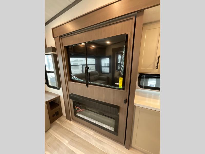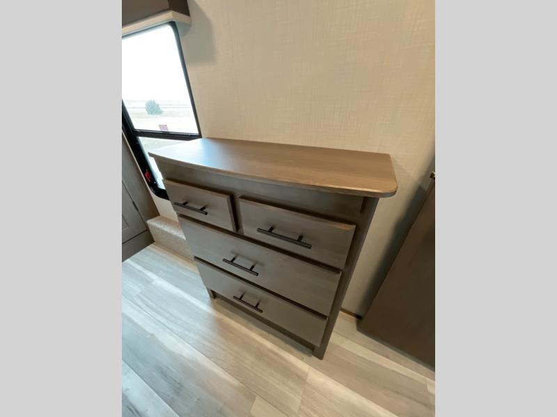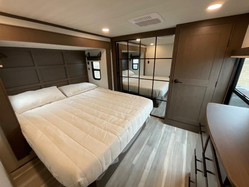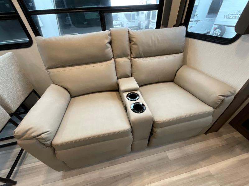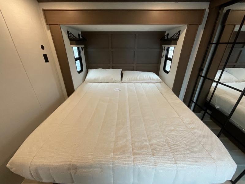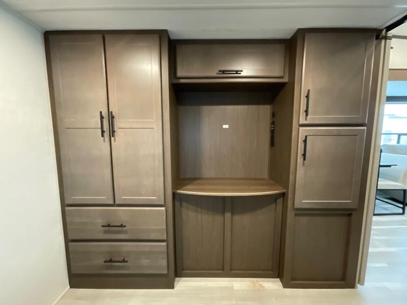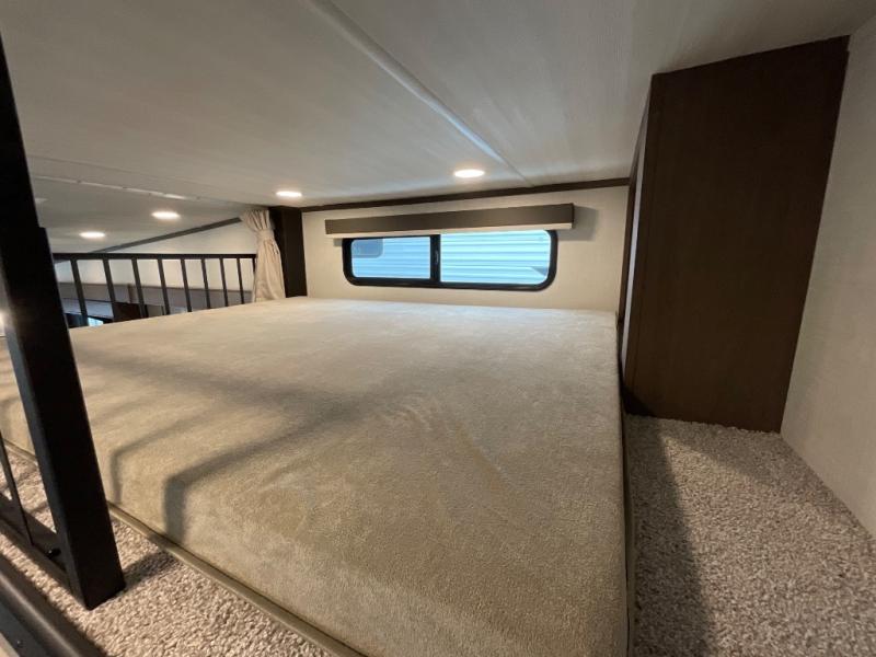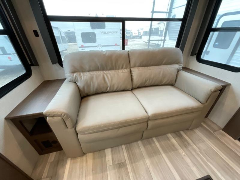 You'll love having an extra room that you can decide what to do with on this Cougar fifth wheel! There is a tri-fold sleeper sofa here, a desk plus two wardrobes for storage. Above this room is a loft which adds more sleeping space without taking up precious interior living space. And speaking of space, you'll find more of it in the main living area when you push out the opposing slides. A second tri-fold sleeper sofa sits in the living area, and there is also theater seating that you can rest on in front of the entertainment center with a hidden pantry. The full bathroom has a linen closet for your towels and washcloths, and there is also great storage in the front private bedroom with the under-bed storage, dresser with a sliding top, and a full-height wardrobe. Outside, you'll find two power awnings, an unobstructed pass-thru storage, and an outdoor kitchen prep area!