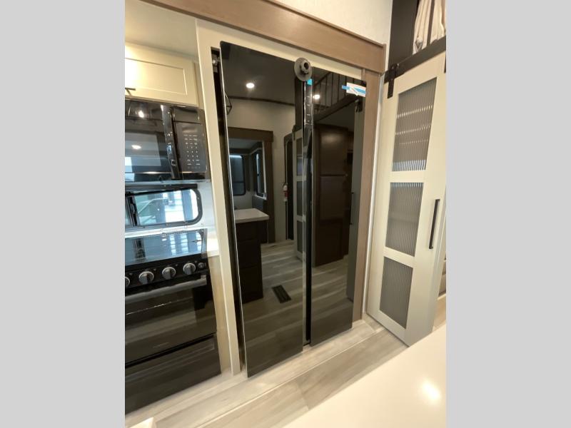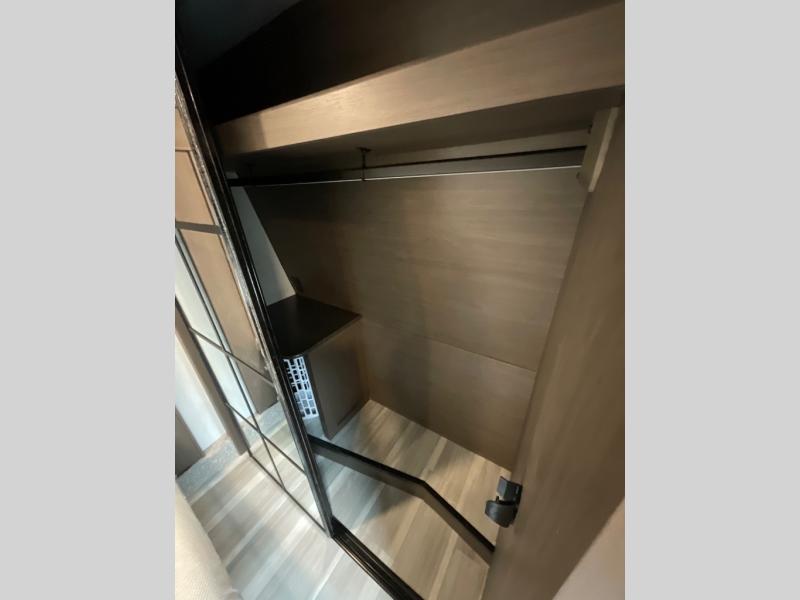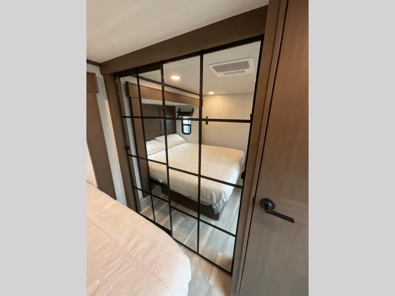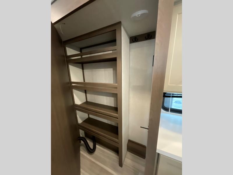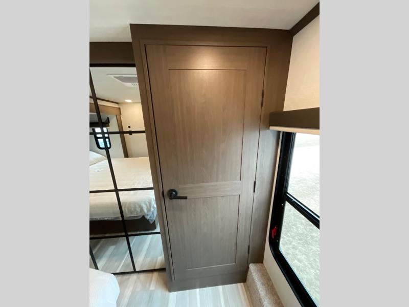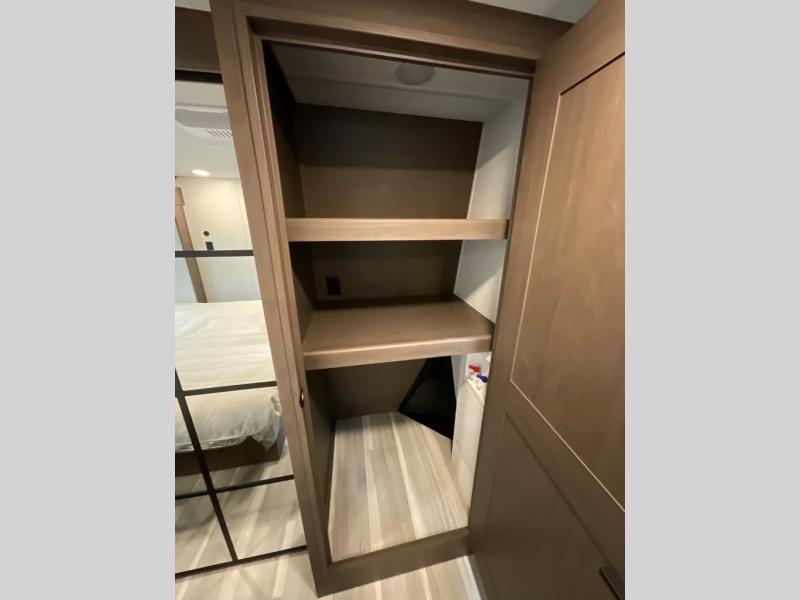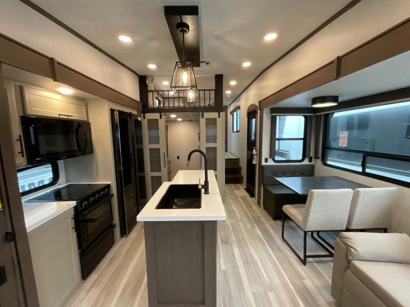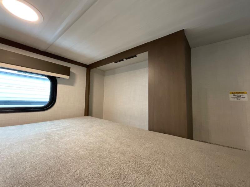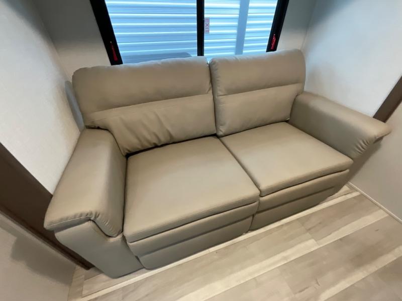 You'll love having an extra room that you can decide what to do with on this Cougar fifth wheel! There is a tri-fold sleeper sofa here, a desk plus two wardrobes for storage. Above this room is a loft which adds more sleeping space without taking up precious interior living space. And speaking of space, you'll find more of it in the main living area when you push out the opposing slides. A second tri-fold sleeper sofa sits in the living area, and there is also theater seating that you can rest on in front of the entertainment center with a hidden pantry. The full bathroom has a linen closet for your towels and washcloths, and there is also great storage in the front private bedroom with the under-bed storage, dresser with a sliding top, and a full-height wardrobe. Outside, you'll find two power awnings, an unobstructed pass-thru storage, and an outdoor kitchen prep area!