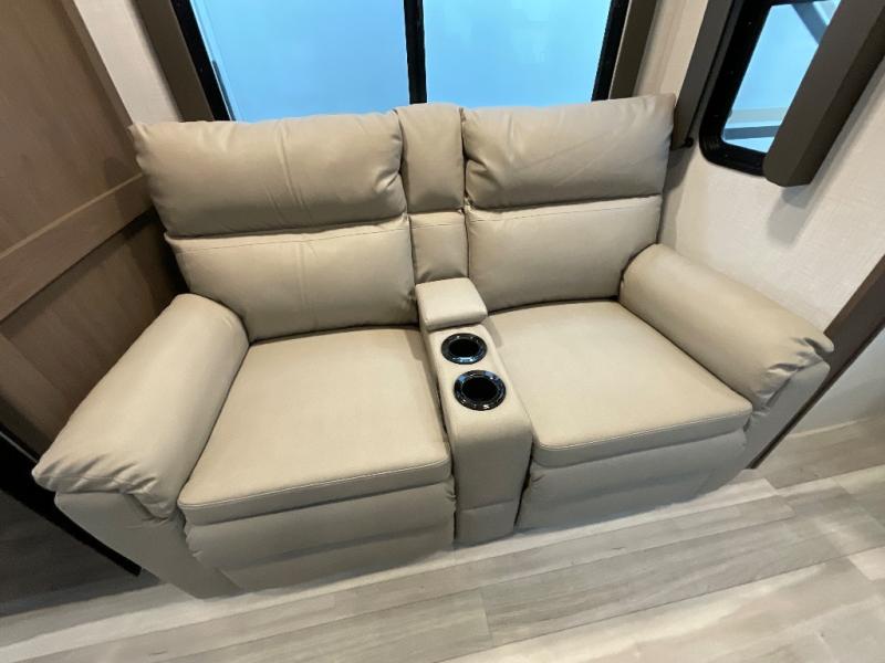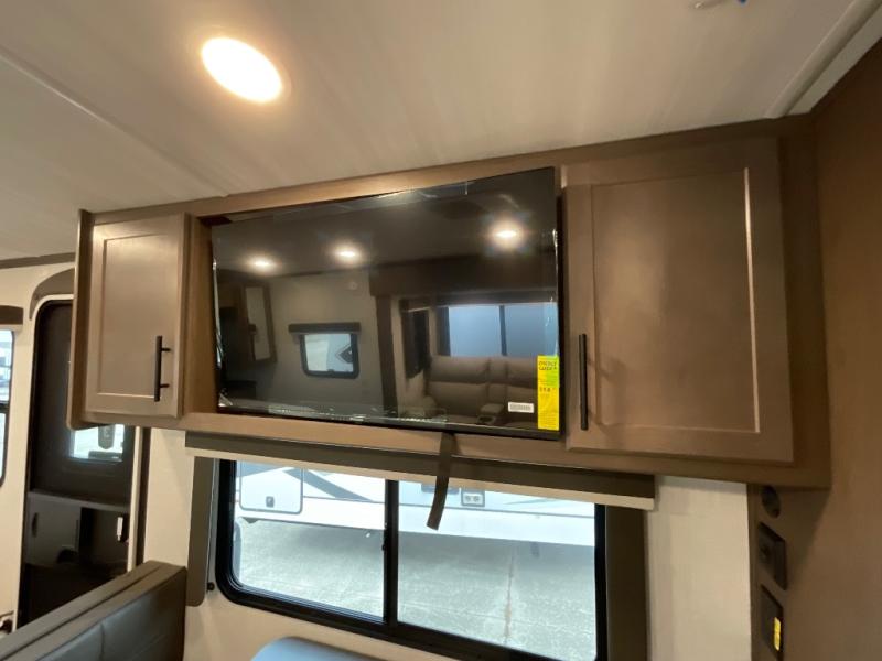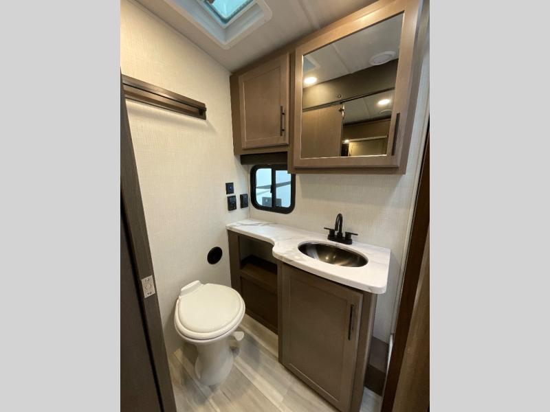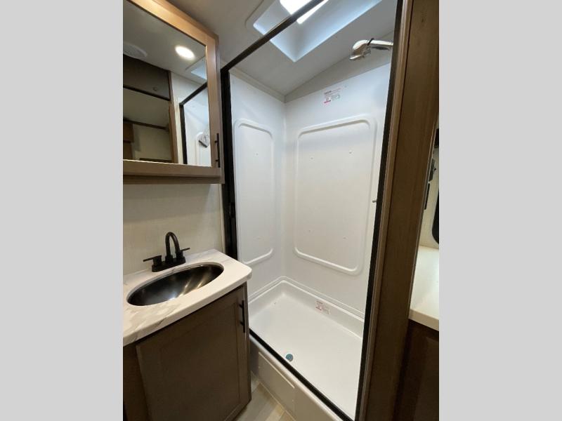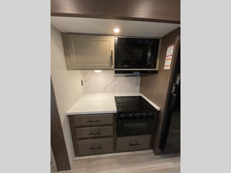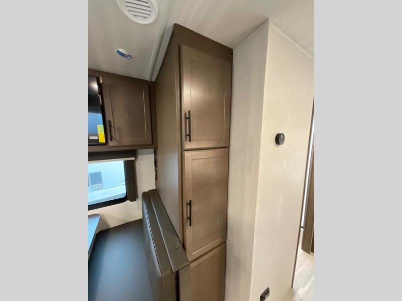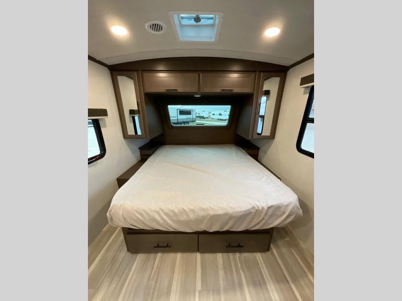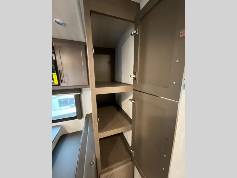 With a king-size bed, this Cougar Half-Ton travel trailer shows that you can still be comfortable even while you're away from home! The bed has drawers and nightstands on either side to keep your belongings tidy. There is a convenient shoe cubby right as you enter the unit to keep this space picked up as well. Right next to the booth dinette is the pantry, and next to the pantry is the full bathroom which is certainly one of the most valuable features to any trailer.