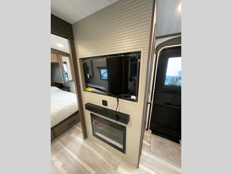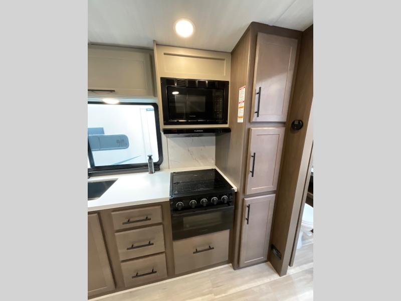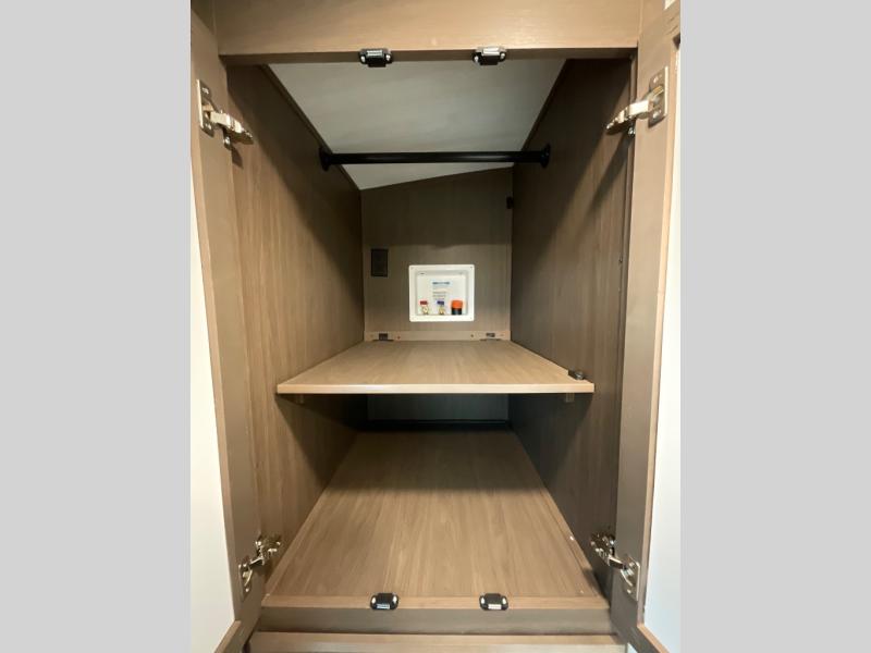 Wherever you decide to camp in this travel trailer, you'll be met with comfort and convenience! The full rear bath includes a space saving sliding door, toilet, sink, and linen closet for towels. A large slide out provides more space to move about, and here you'll enjoy the tri-fold sleeper sofa and booth dinette with storage drawers. There is also a fireplace and TV across from the furniture to enjoy movie nights! The chef of your group can make meals on the cooktop or in the microwave, and there is a pull-out countertop for extra counter space. Up front, a private bedroom includes a king bed, dual nightstands, and washer and dryer prep.