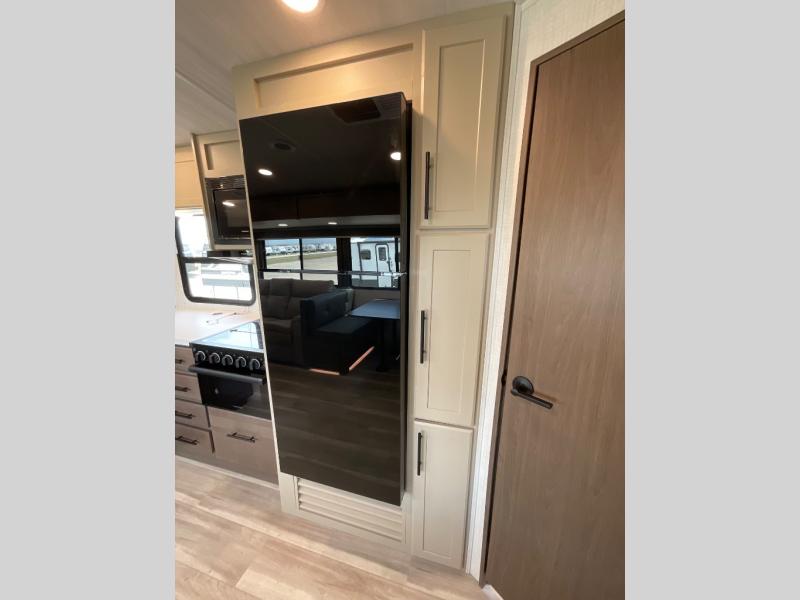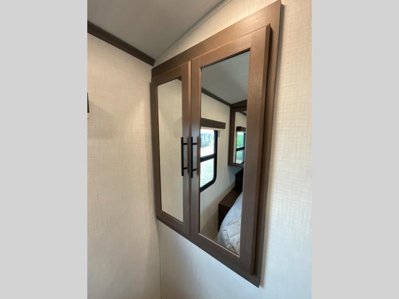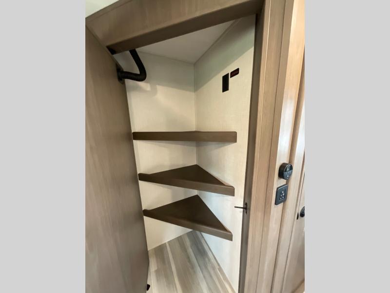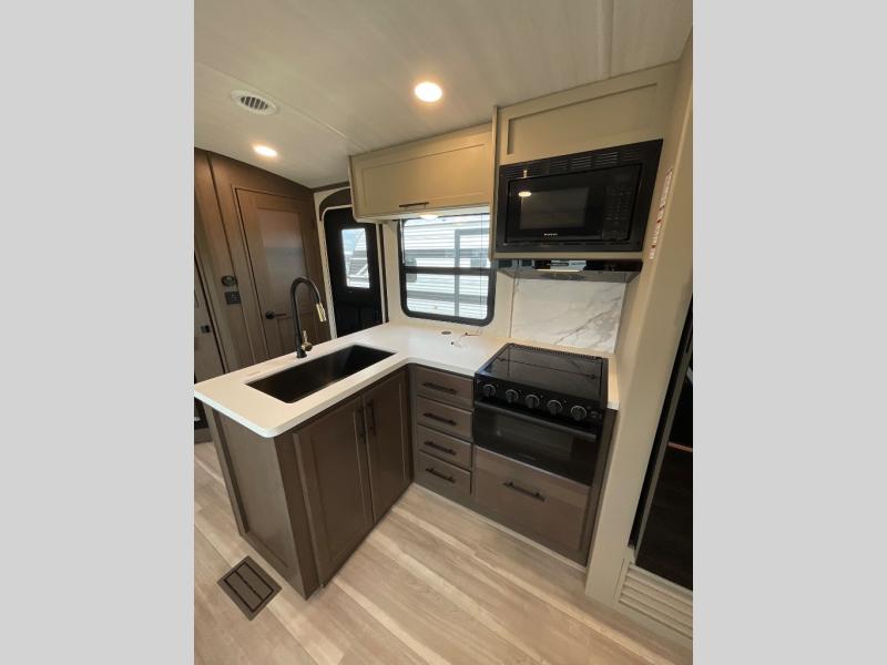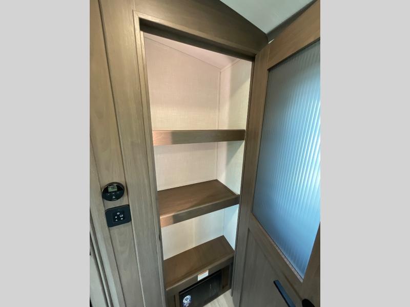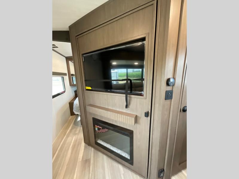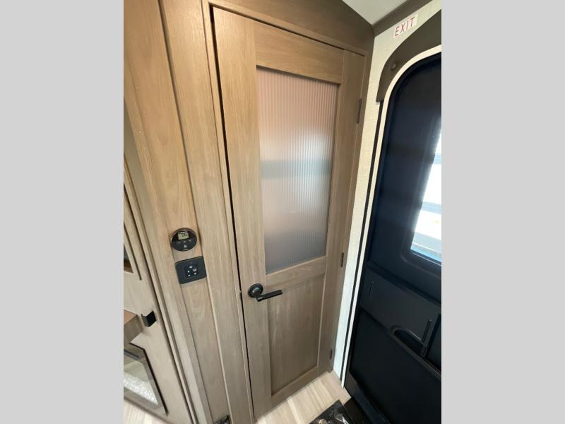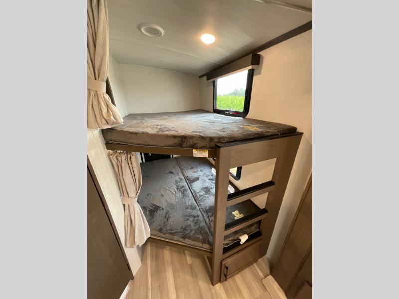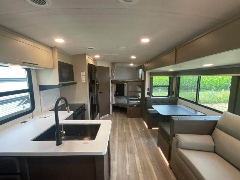 With dual entry doors in this travel trailer, you can enter in through the main living area or the full bath for convenience! Once inside, the sleeper sofa and booth dinette provide places to relax, eat, and play games, plus there is an entertainment center with hidden storage behind to keep movies organized. A full kitchen with a three burner cooktop and 12V refrigerator will allow you to cook and store food, or you can head outdoors to use the outdoor kitchen prep area. There is also drop-frame storage outside for fishing poles and hiking gear, and the 21' electric awning provides shade as you relax. When it's time to call it a night, the king bed in the front private bedroom is sure to bring comfort, while the little ones take the double-size bunks, and any other guests can sleep on the living room furniture!