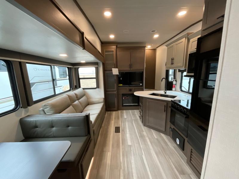 You won't have any trouble convincing your friends or family to join you on an adventure with this Cougar Half-Ton fifth wheel! Since this unit has both a full and a half bathroom, it will be easy for everyone to get ready in the morning, and the 21" Furrion range will allow you to whip up a full batch of pancakes for your guests. Store any leftovers in the 12V refrigerator before heading out on your next exciting expedition. If you need your backpacks and hiking gear, you can grab them from the exterior pass-through storage, and you will enjoy the cozy living space with the fireplace!