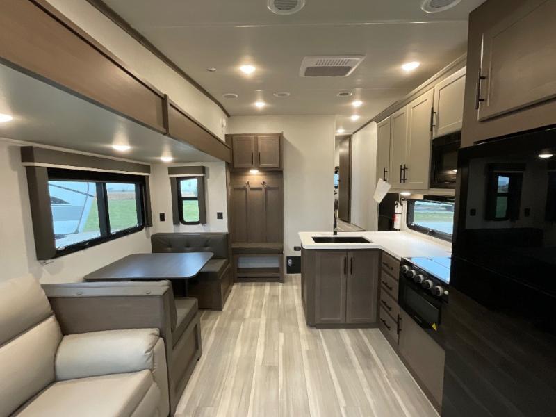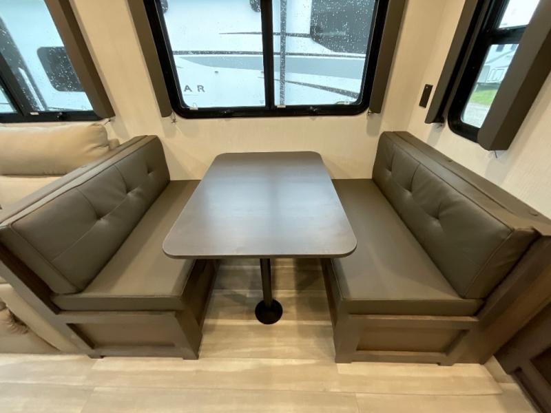 This lightweight fifth wheel is big enough for your small family to camp together! Enter to find a convenient combined kitchen and living space with large slide for added space. The slide features theater seating and a booth dinette which offers ample seating for meals and hanging out. There is a flip up table along the rear wall with a nearby 40" LED TV which features a butler pantry behind. Head up the steps to the right of the entry door to a complete bath and private front bedroom featuring a queen size bed with dual nightstands on both sides of the bed. The bathroom offers a shower with a skylight for added headroom and natural lighting. Outside, a 16' awning provides added living space protected from the elements!