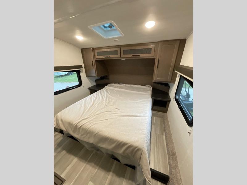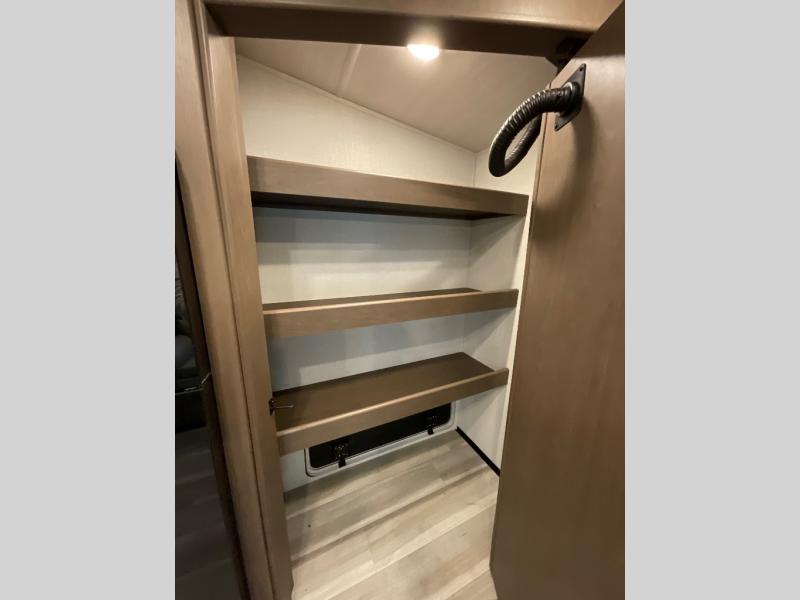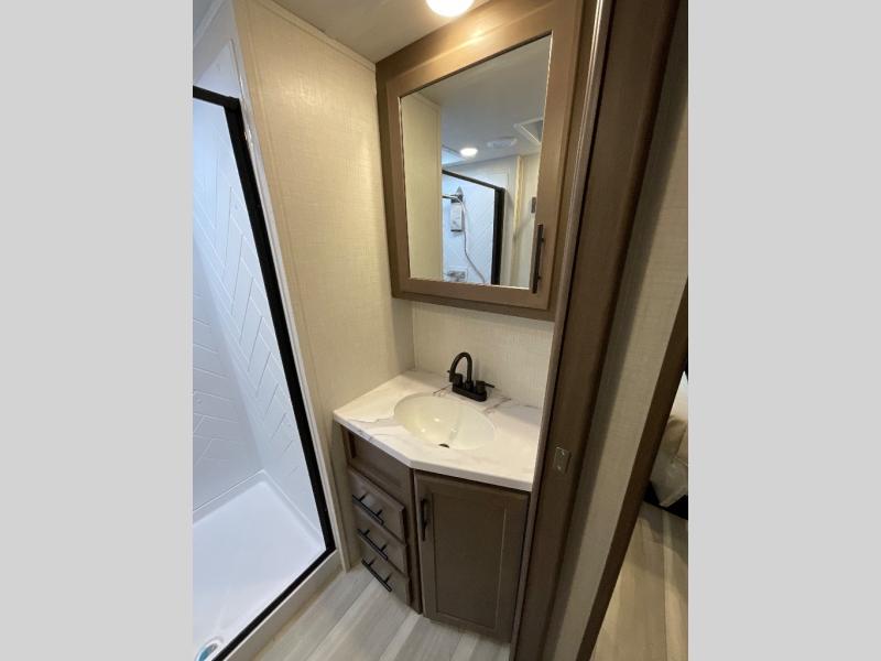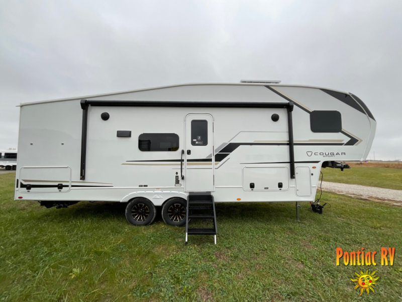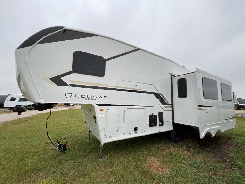 The Cougar Sport structural I-beam frame with stamped steel cross-members and outriggers, plus its AlphaPly roof membrane are what active RVers love about the construction of the Cougar line. The Cougar Sport models are no exception when it comes to a great package, as well as being smaller and lighter weight than their big brother Cougar models. A one-piece, heated and enclosed polypropylene underbelly will add protection against the elements, and the electric stabilizer jacks will provide more stability. On the inside, residential shaker style hardwood cabinet doors and decorative crown molding, plus seamless pressed countertops and an on-demand water heater will make your unit feel even more like home. You are also sure to appreciate the shiplap style decorative accent wall behind the bed, a porcelain foot flush toilet in the bathroom, plus residential kitchen hardware, and so much more.
