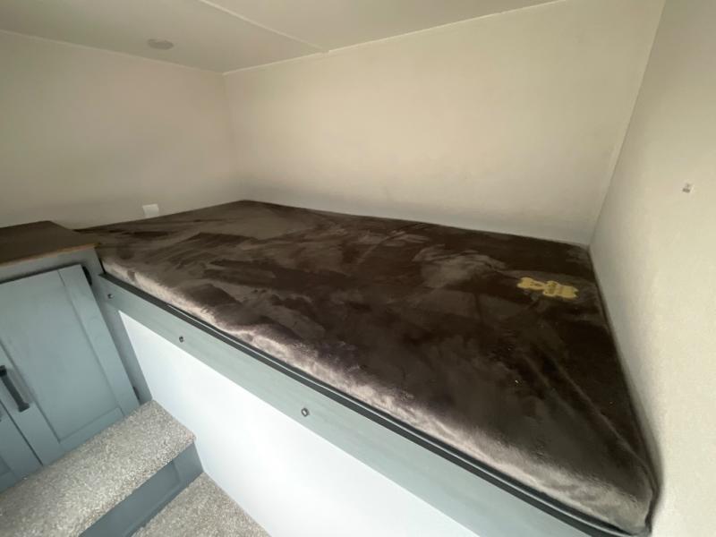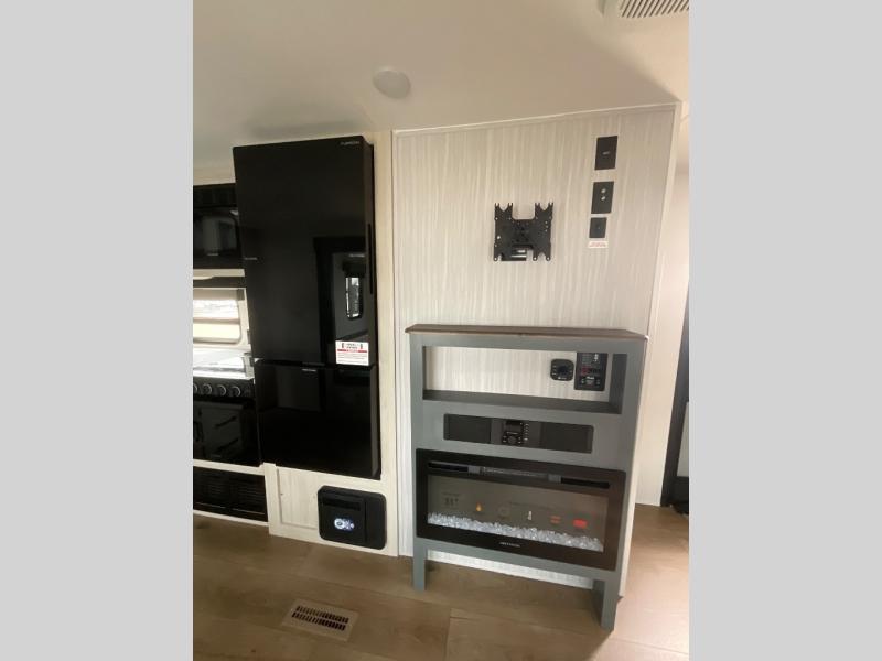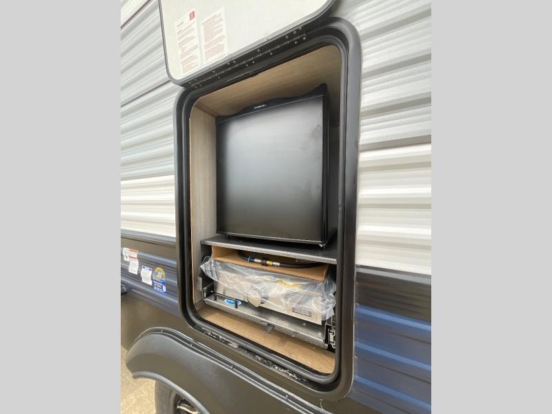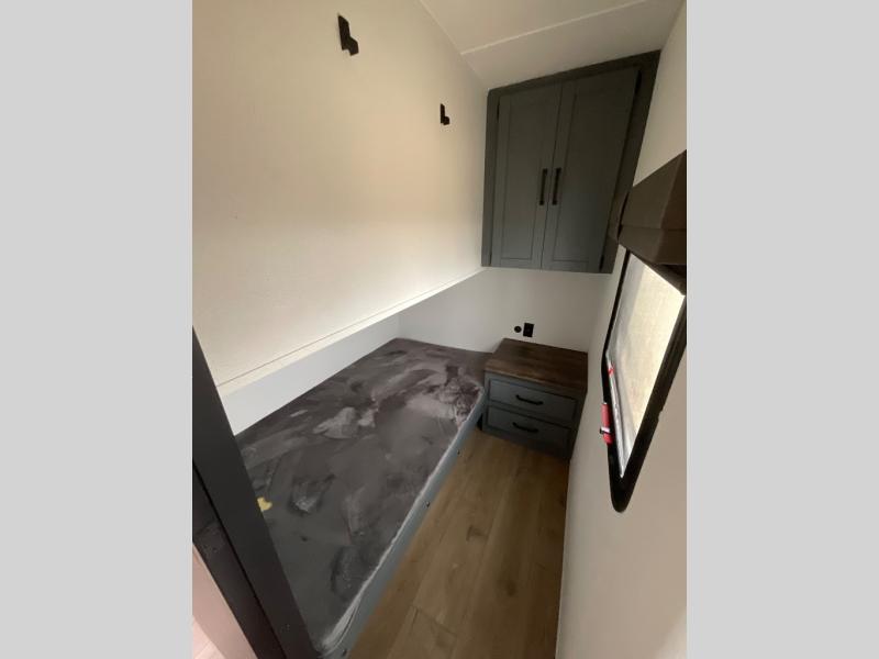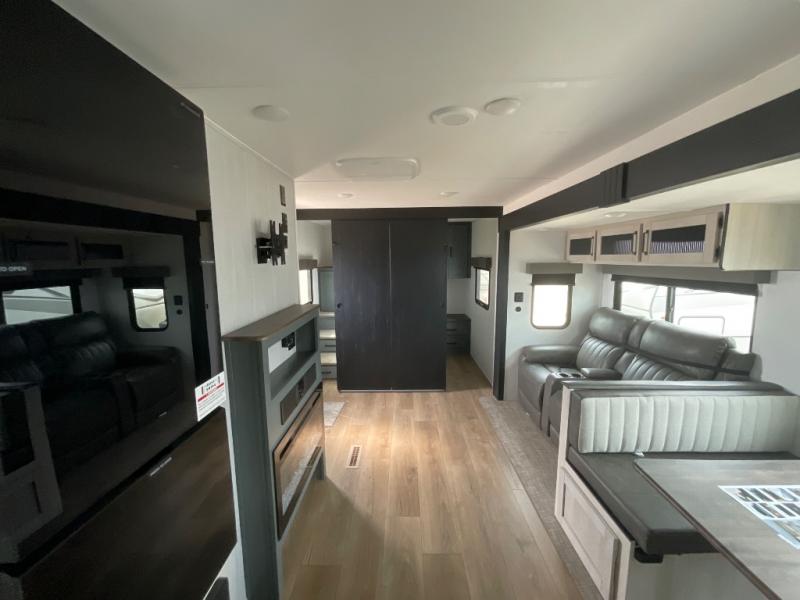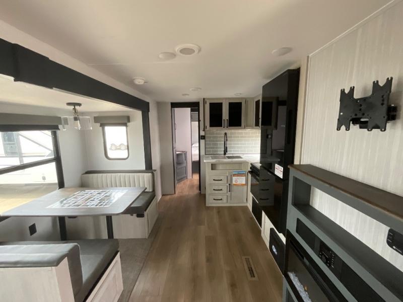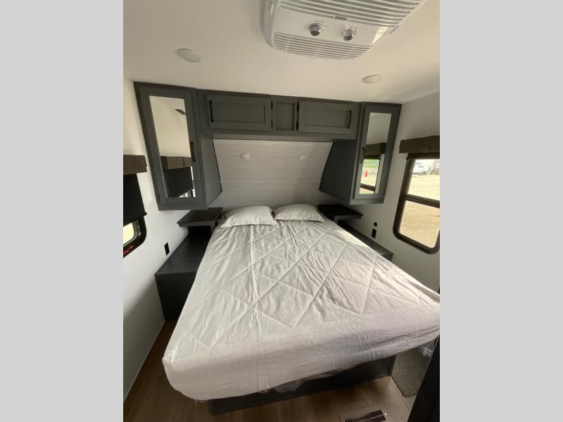 This travel trailer is perfect for camping with a larger group of friends or if you have older kids since there are two private bunkrooms! Each room includes a bunk bed and storage space for clothes, shoes, and more. You'll enjoy your own space up front in the master bedroom that includes a queen bed, dual shirt closets, and one of the dual entry doors to the unit for added convenience. Everyone can come together in the combined living area and kitchen that includes a large slide out with a sofa and booth dinette, plus there is a fireplace to make this space feel more like home. A full kitchen inside lets you create home-cooked meals each day, and you can choose to add the optional micro kitchen with a griddle for a pancake breakfast outdoors!