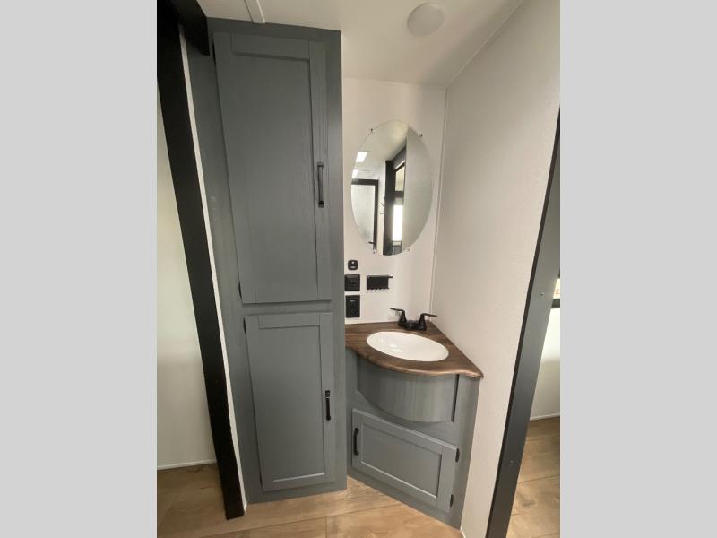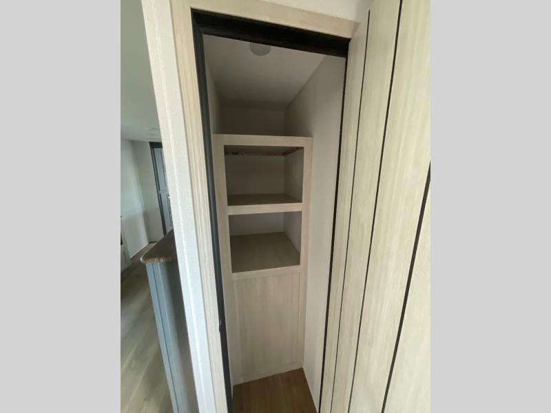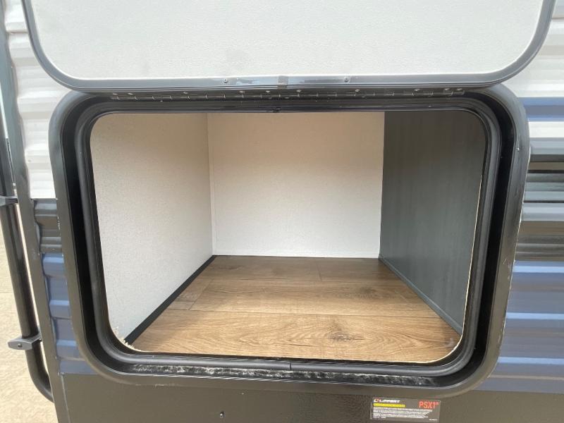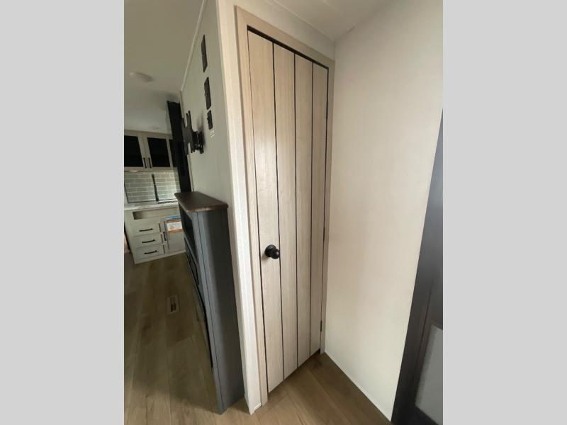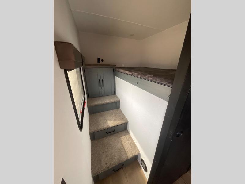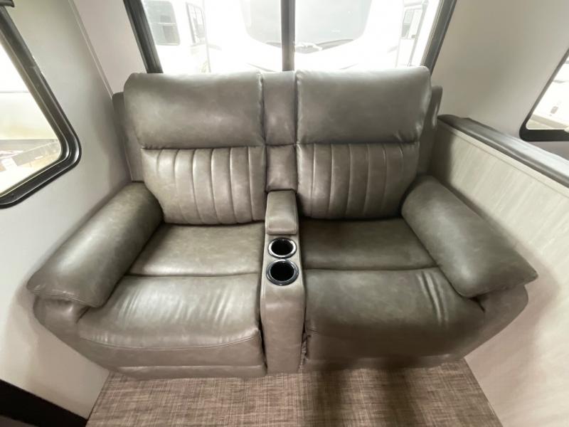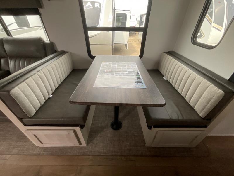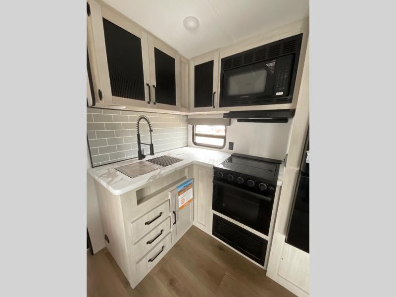 This travel trailer is perfect for camping with a larger group of friends or if you have older kids since there are two private bunkrooms! Each room includes a bunk bed and storage space for clothes, shoes, and more. You'll enjoy your own space up front in the master bedroom that includes a queen bed, dual shirt closets, and one of the dual entry doors to the unit for added convenience. Everyone can come together in the combined living area and kitchen that includes a large slide out with a sofa and booth dinette, plus there is a fireplace to make this space feel more like home. A full kitchen inside lets you create home-cooked meals each day, and you can choose to add the optional micro kitchen with a griddle for a pancake breakfast outdoors!