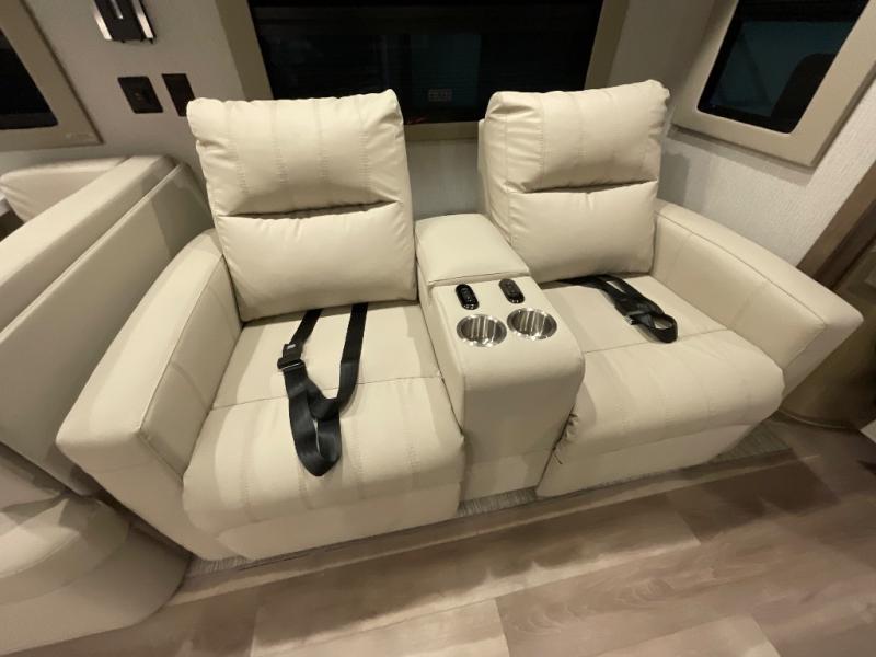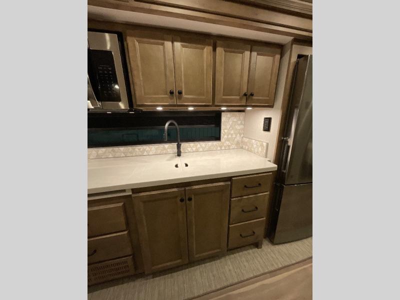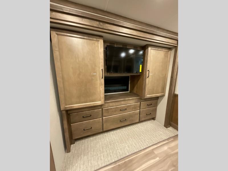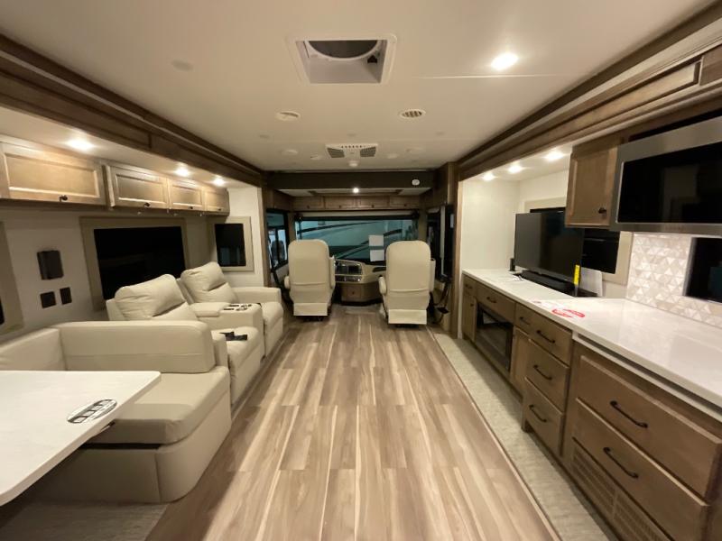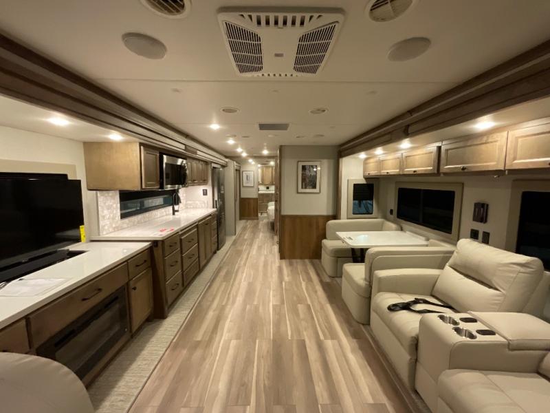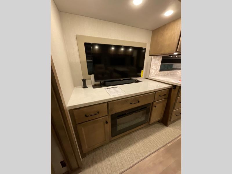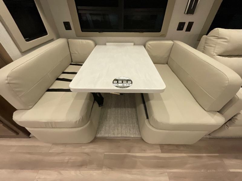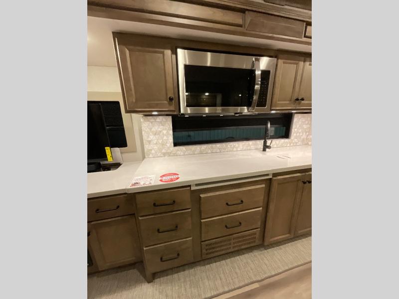 One step inside this spacious coach and you'll be sold! There is a bath and a half to make traveling with friends and family easier than ever. The full-wall slide will make your space feel more open, plus there is a king bed slide out and a third slide out so everyone is comfortable. This model includes theater seats, a lift TV within the entertainment center, along with drawer storage to keep movies organized, and an optional fireplace. You'll be pleasantly surprised by the full kitchen with its three burner cooktop, 1.5 cu. ft. Smart convection microwave, plus a pantry and 18 cu. ft. residential refrigerator with a bottom freezer to keep ice cream stocked up! When you're ready for some shut-eye, the master bedroom will be waiting for you, while your guests sleep on the booth dinette sleeper, or you can choose the optional drop-down front bunk for more sleeping space!