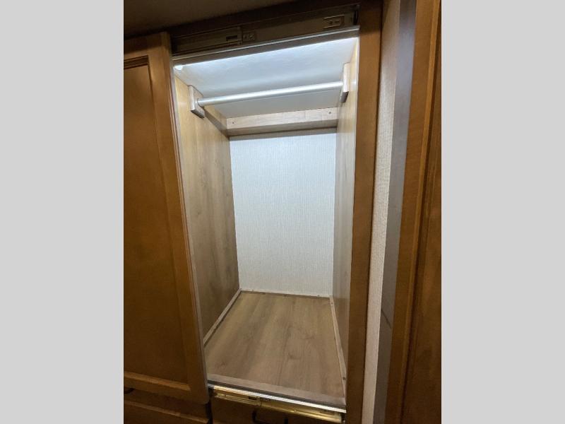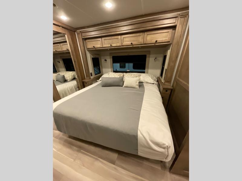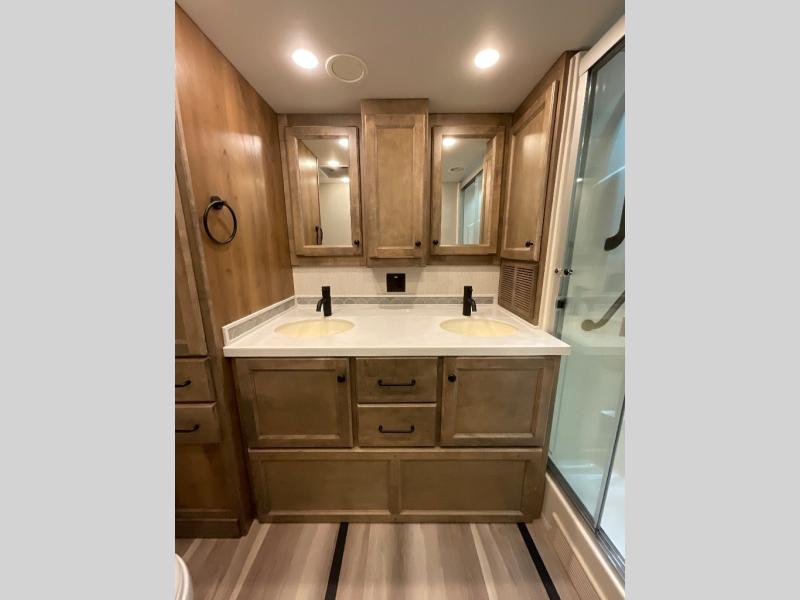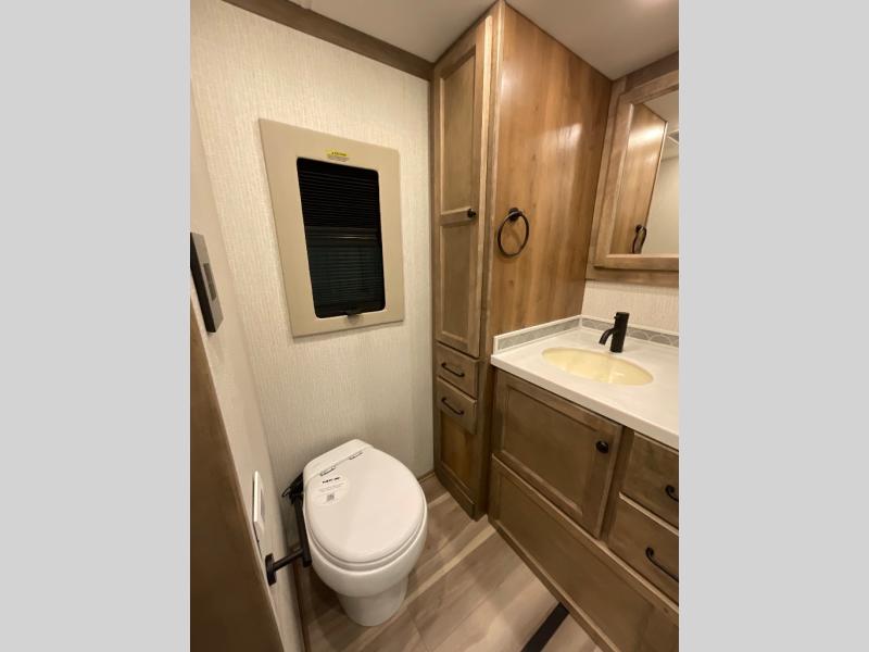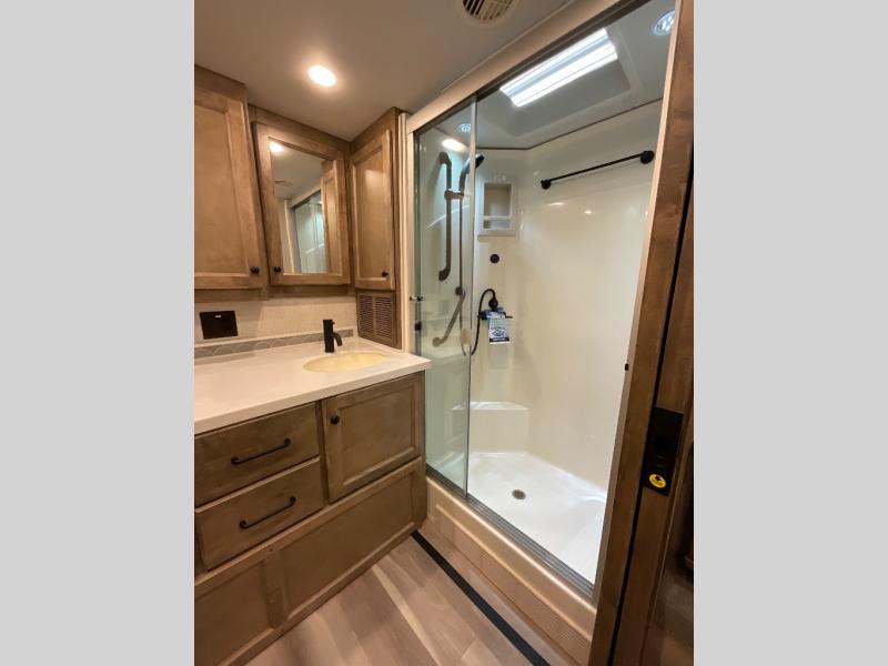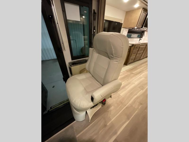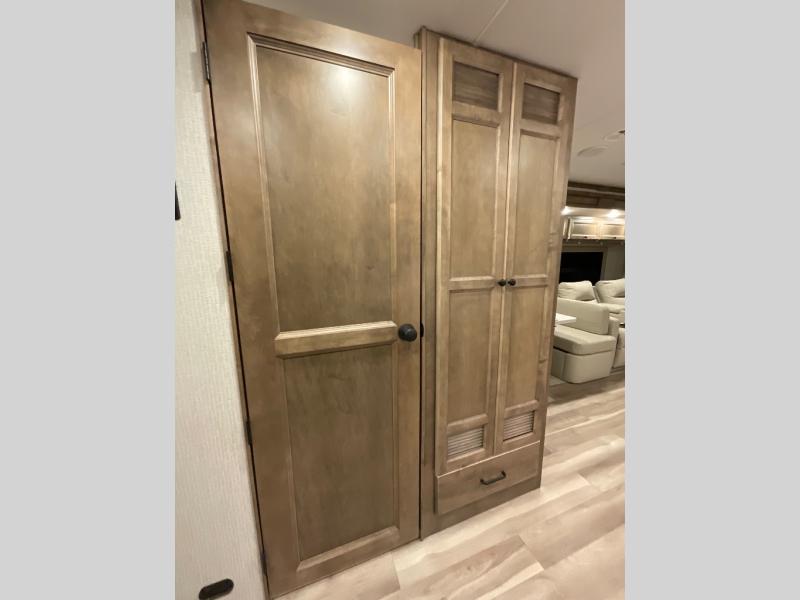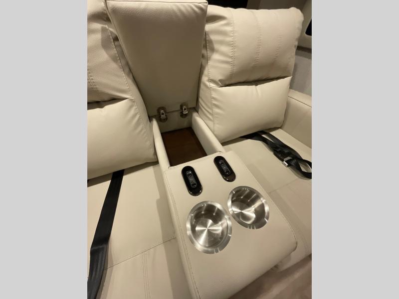 One step inside this spacious coach and you'll be sold! There is a bath and a half to make traveling with friends and family easier than ever. The full-wall slide will make your space feel more open, plus there is a king bed slide out and a third slide out so everyone is comfortable. This model includes theater seats, a lift TV within the entertainment center, along with drawer storage to keep movies organized, and an optional fireplace. You'll be pleasantly surprised by the full kitchen with its three burner cooktop, 1.5 cu. ft. Smart convection microwave, plus a pantry and 18 cu. ft. residential refrigerator with a bottom freezer to keep ice cream stocked up! When you're ready for some shut-eye, the master bedroom will be waiting for you, while your guests sleep on the booth dinette sleeper, or you can choose the optional drop-down front bunk for more sleeping space!