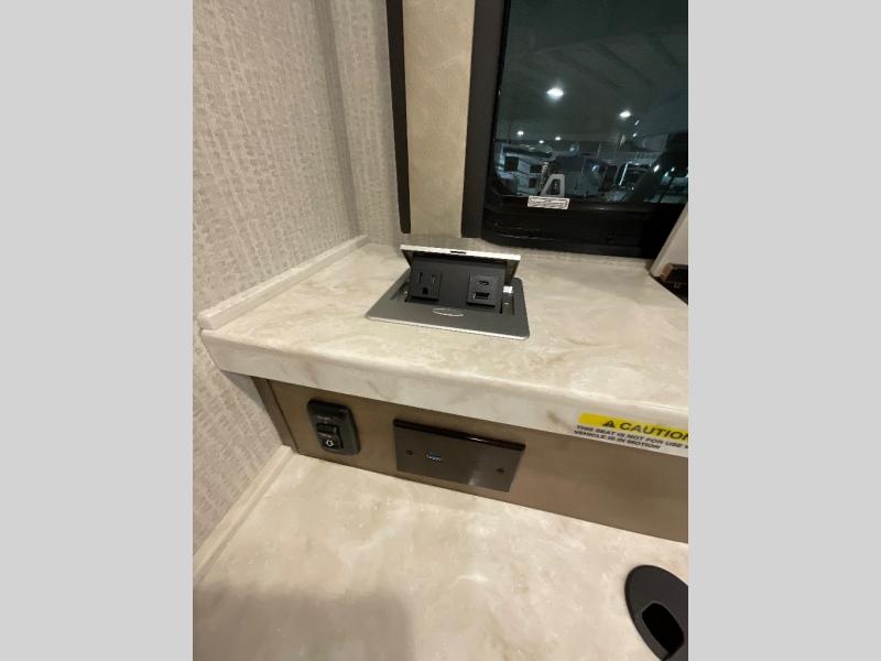 There are many standard luxurious features you will love about this motorhome! It also has many optional features you can add like the optional drop-down front bunk, the optional super sofa and the optional theater seating. The queen bed slide in the rear private bedroom offers a comfortable place to sleep, as well as the flip and fold sofa bed in the living area. You will love the dinette bar with a lift TV, a flip-up countertop, and two chairs that will make this the perfect place to get some work done while you're on the road. The kitchen includes everything you need to prepare meals each day, including a 1.7 cu. ft. smart convection microwave with an air fryer, a three burner liquid propane cooktop, and a 23 cu. ft. stainless steel residential refrigerator with French doors and a bottom freezer. Head to the rear master bedroom with a queen bed slide out, a large wardrobe, a cabinet with a TV and drawers below, plus a private entrance into the dual entry bath!
