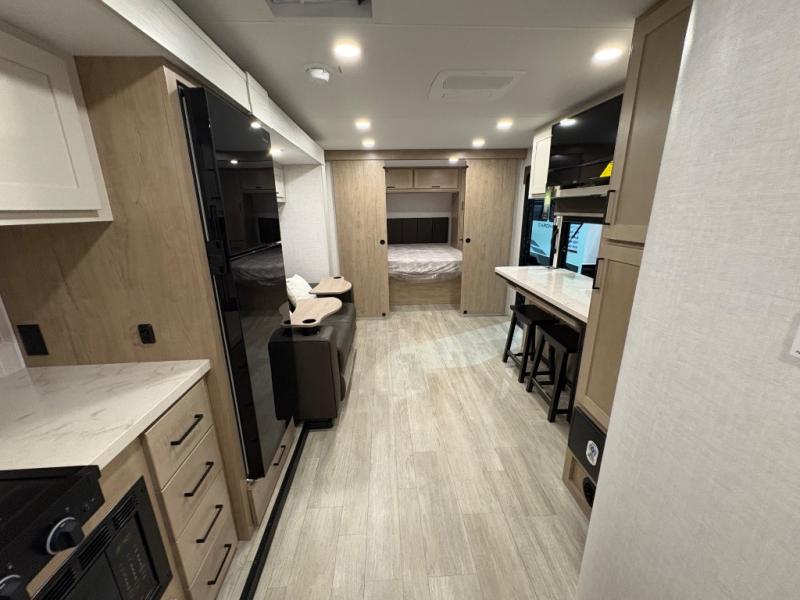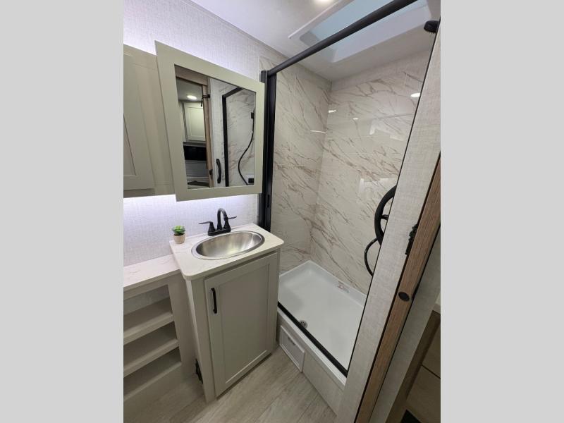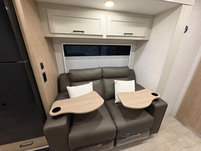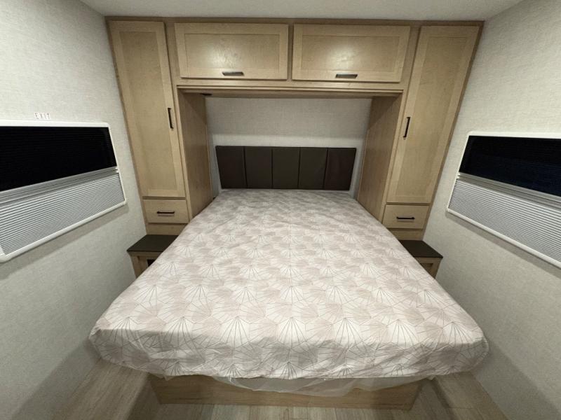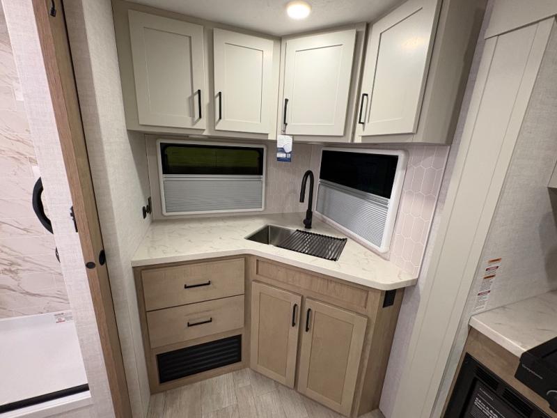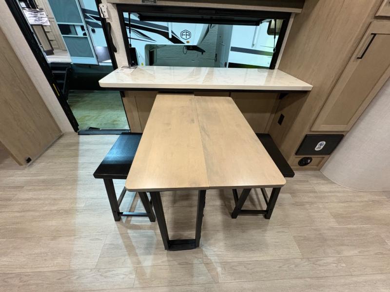 Pack your bags and head to your favorite camping spot in this front bedroom travel trailer! You will sleep soundly on the walk-around residential queen bed with an optional Murphy bed, and there are dual nightstands and dual wardrobes to keep your things tidy. The rear of the unit is shared with the full bath and the kitchen countertop with a large stainless-steel sink, and you'll find the dual-burner LP cooktop and air fryer convection microwave within the large slide out! There is also theater seating with rotating side tables here, which is in perfect view of the HDTV for movie nights. And you're going to love the EmberFlex Dinesk, dining table/bar/desktop that can be reconfigured to fit your needs best!