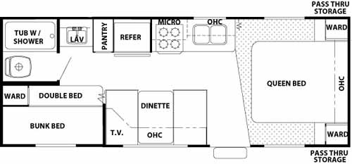 Bunk Bed w/Lower Double Bed, Tub/Shower, Pantry, Refrigerator, 4 Burner Range, Double Kitchen Sink, Microwave, Dinette w/TV Above, Queen Bed, Pass-Thru Storage, Wardrobes, and More.