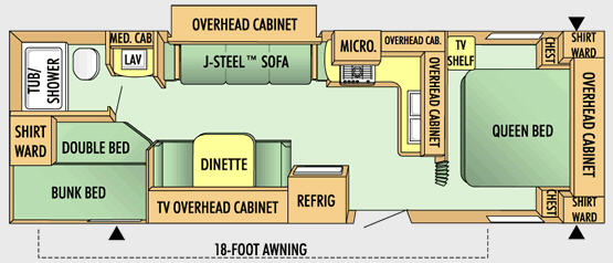 Single Slide Jay Flight TT by Jayco, Rear Bathroom w/Toilet, Sink, Tub/Shower, Rear Double Bed w/ Bunk, Shirt Wardrobe, Booth Dinette, Slide Out J-Steel Sofa, Kitchen, Refrigerator, 3 Burner Range, Double Kitchen Sink, Overhead Cabinets, Front Bedroom, Queen Bed, TV Shelf, Double Shirt Wardrobe/Chests, Pass Thru Storage and More.