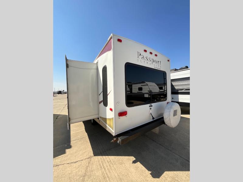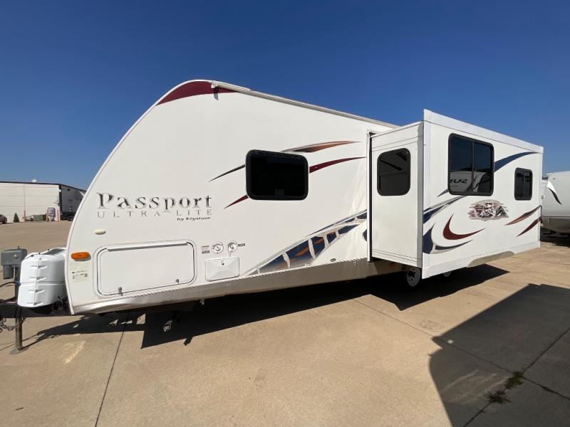Passport Ultra Lite Travel Trailer by Keystone w/Rear Living Area Including 2 Lounge Chairs w/End Table Between and Overhead Storage Cabinets, Fold-Down Sofa & U-Shaped Dinette Slide, TV Cabinet, Dbl. Kitchen Sink, 3 Burner Range, Refrigerator, Tub/Shower, Vanity w/Sink & Toilet, Front Queen Bed w/Private Bedroom Entry, Wardrobes Both Sides of Bed, 3rd Wardrobe, Front Pass-Thru Storage and More!