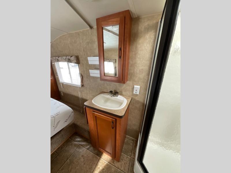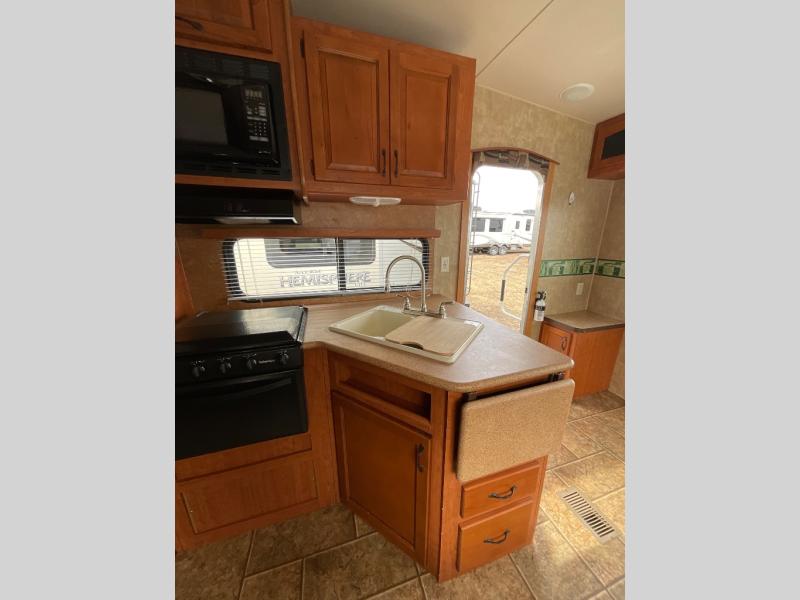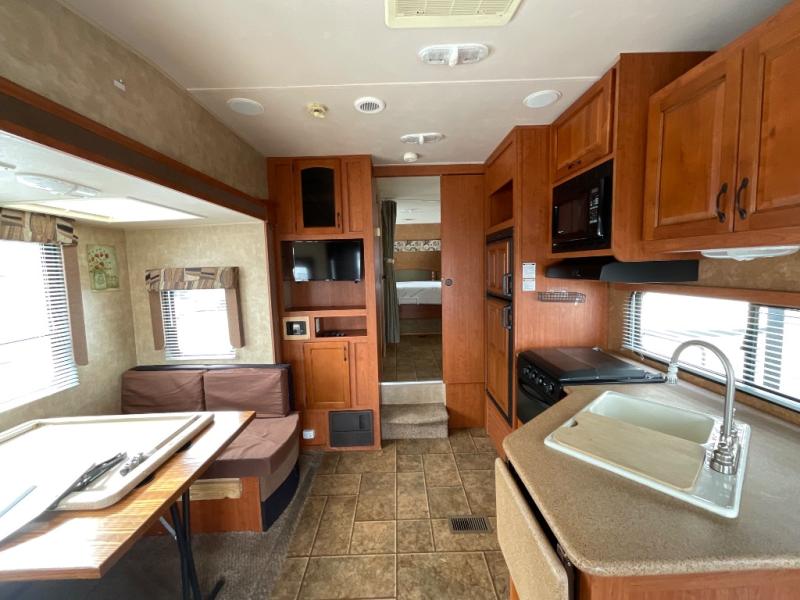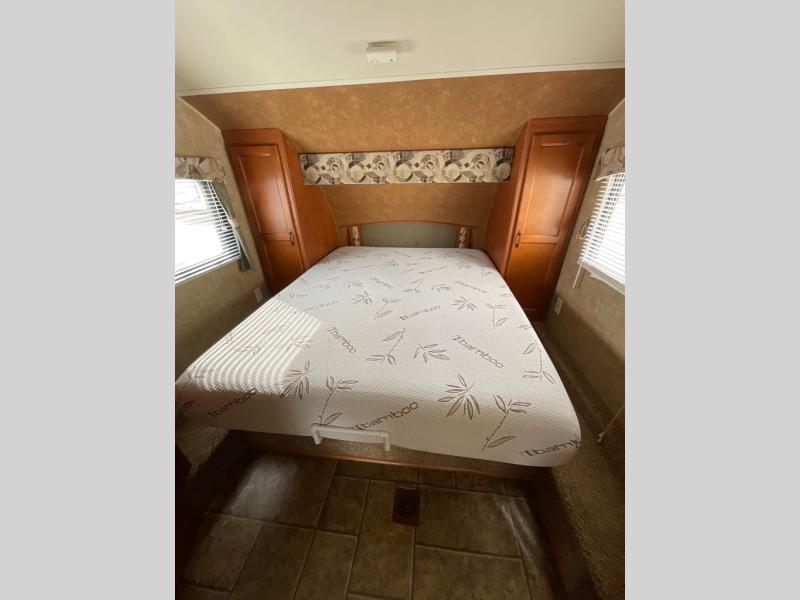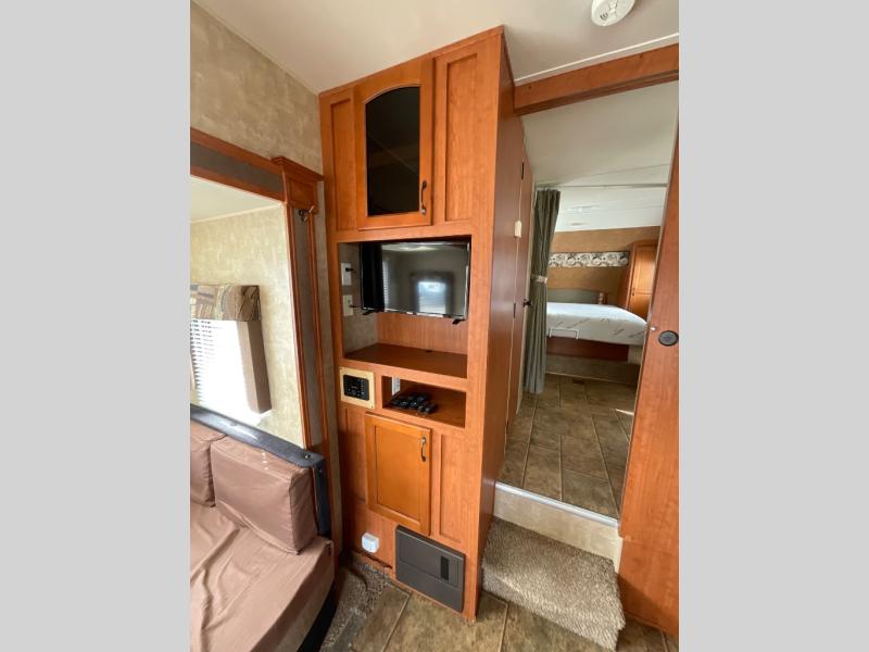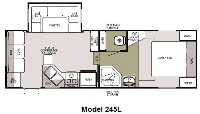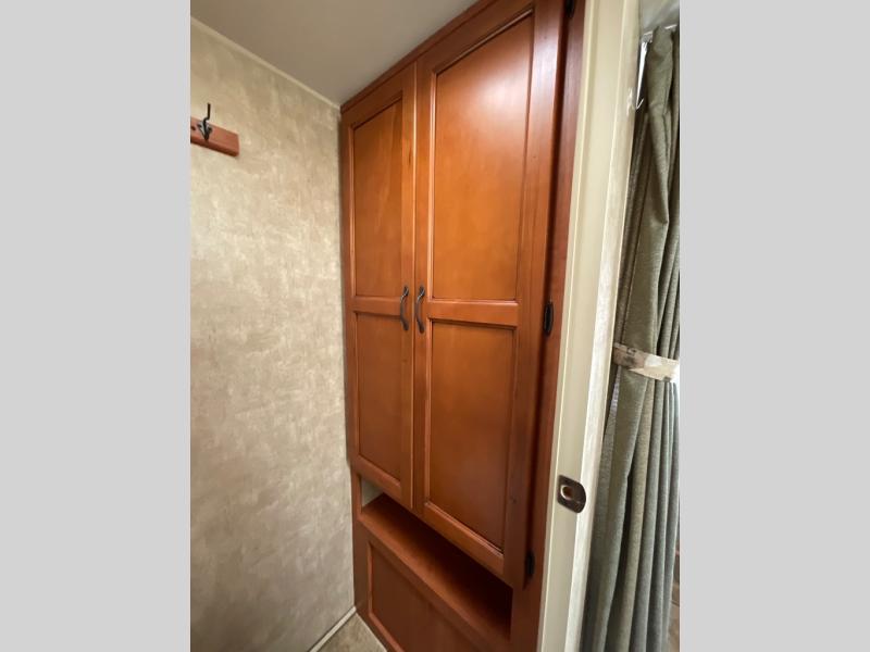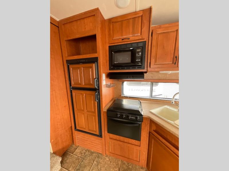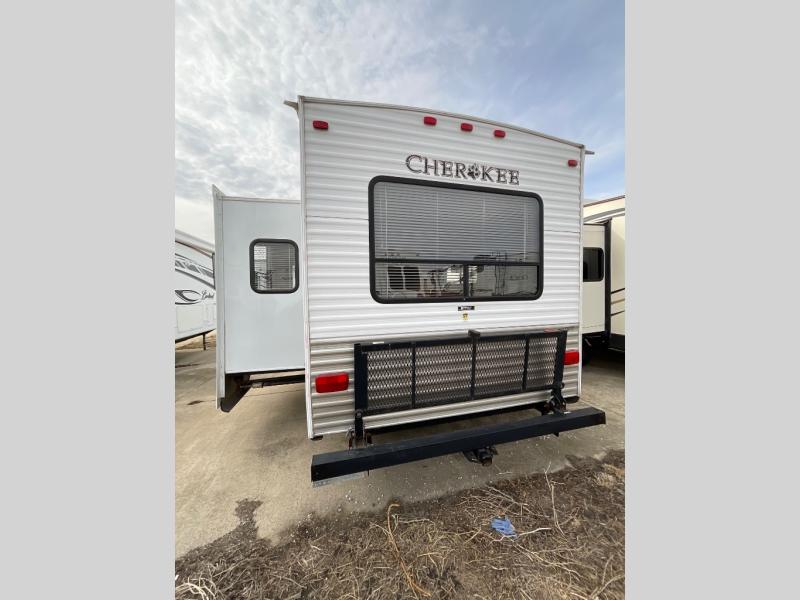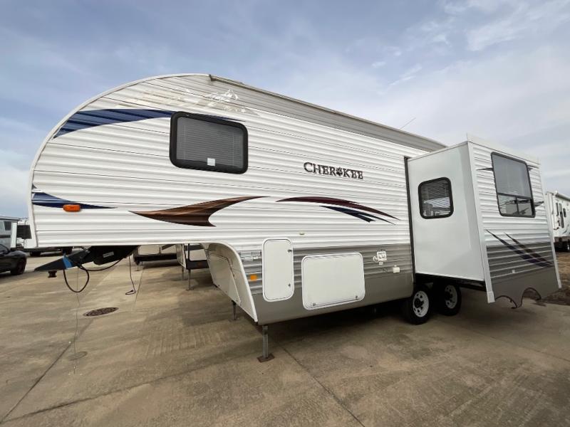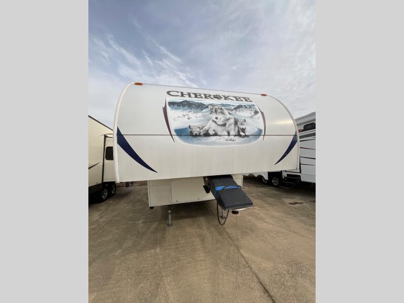 Single Slide Cherokee Fifth Wheel, Rear Sofa w/End Table, U-Shaped Dinette w/Skylight Slide Out, Flip-Up Counter Top Ext., Dbl. Kitchen Sink, 3 Burner Range, Micro., Refrig., Ent. Ctr., Pantry, Step Up Front Bath/Bedroom, Private Toilet Area w/Linen, Corner Shower, Lav., Pass Thru Storage, LCD TV Mount w/Ward., Front Queen Bed w/Dbl. Wardrobes, Overhead Cab. Throughout and More.