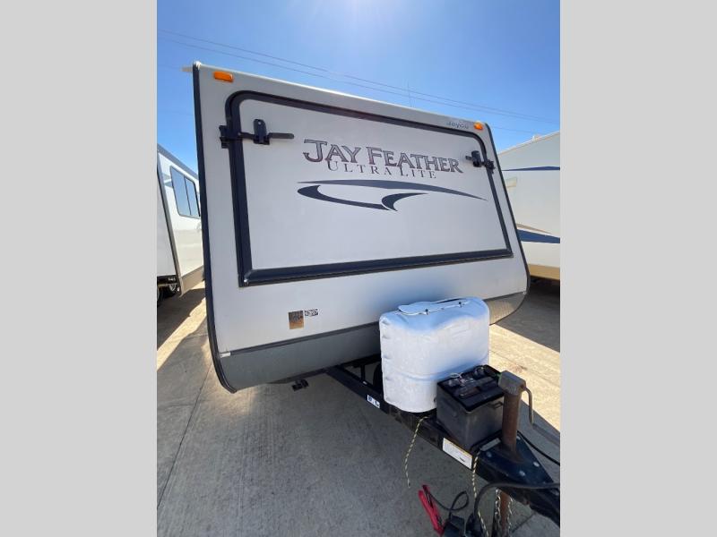 Single Slide Jay Feather Ultra Lite Expandable Travel Trailer, Rear Bed, Overhead Shelf, Tub/Shower, Toilet, Lav., J-Steel Sofa Slide, U-Dinette w/Overhead Shelf, Front Tent Bed, Refrigerator/TV Shelf, Microwave, 3-Burner Range, Single Galley Sink, Pantry, Ward., Overhead Cabinets Throughout, 10' Awning & Much More.