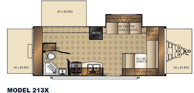 Enjoy a spacious Solaire expandable travel trailer model 213X by Palomino RV which features a single slide, plus three queen size tent expanding beds. The perfect unit for a larger family to enjoy traveling comfortably, yet still keeping the tow length down. This unit sleeps 9!