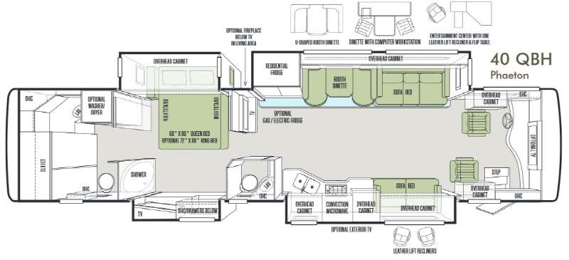 The quadruple slide out Phaeton 40 QBH from Tiffin Motorhomes features a rear full bathroom, an additional half bath and sleeping for up to seven.