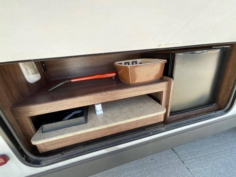 The exterior of the Coleman Explorer 281BH offers lots of storage in the front cavern storage as well as an outside kitchen.