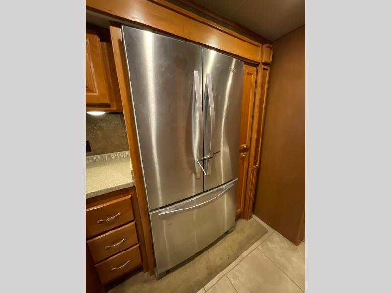 Step inside model 37 PA in front of the passenger seat and take a look back through the coach. You will find a wide open concept living space with dual opposing slides right up front. Behind the passenger seat there is a booth dinette with overhead cabinet, or you might wish to select either a dinette with computer workstation, or a u-shaped dinette instead. This slide also contains a three burner range, double sink, overhead microwave oven, residential refrigerator, and pantry.