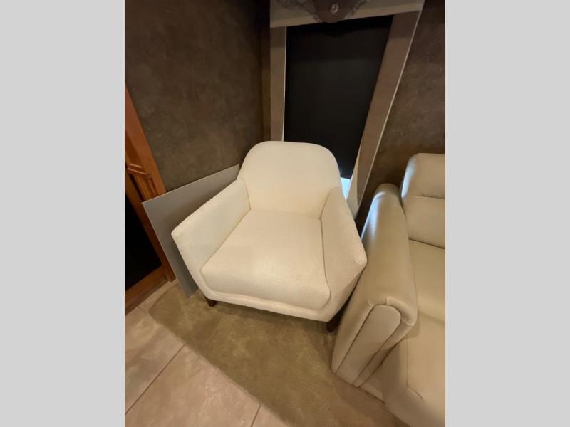 Behind the driver's seat find an L-shaped chaise sofa bed slide out along with a chair including a foot stool. You could also opt. for a hide-a-bed sofa and two recliners if you wish. Within this slide area along the interior wall is a standard TV and optional fireplace that will bring in a warm cozy home-like feel.