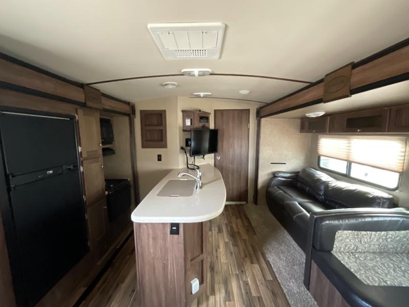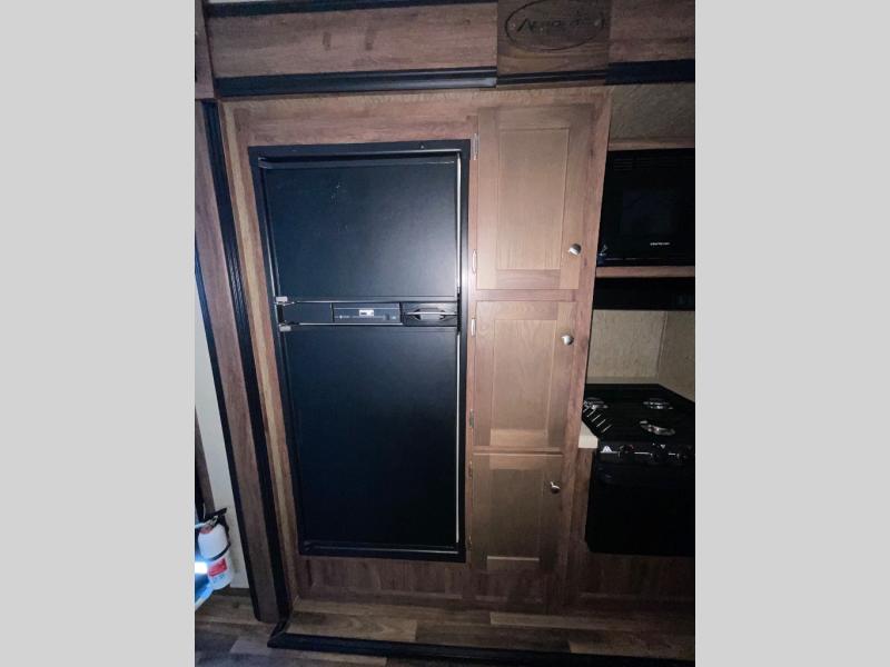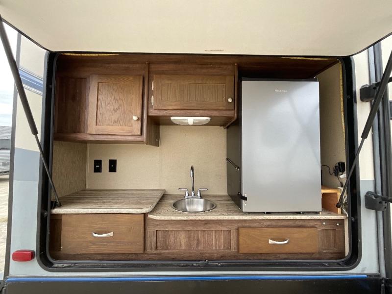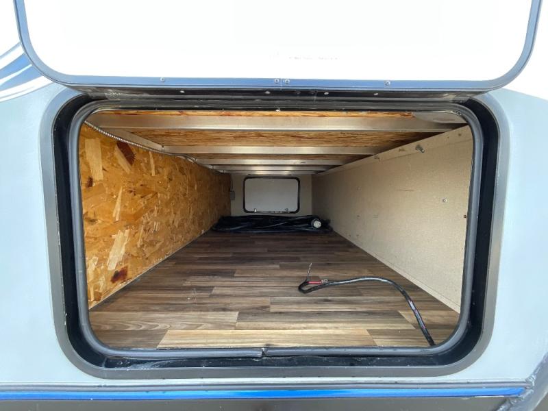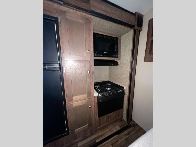 The Aerolite 319BHSS also offers an outside kitchen with countertop, a double burner range, a 3 cubic foot refrigerator, and a TV mount. The front of the travel trailer features pass through storage.