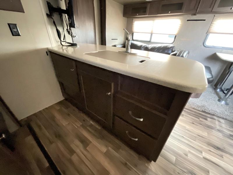 The opposite wall has a kitchen slide out with a refrigerator, pantry, and a three burner range with overhead cabinets. A galley kitchen features lots of counter space, double kitchen sink, and a microwave below. There is also an angled wall that has a TV mount and radio.