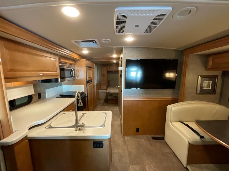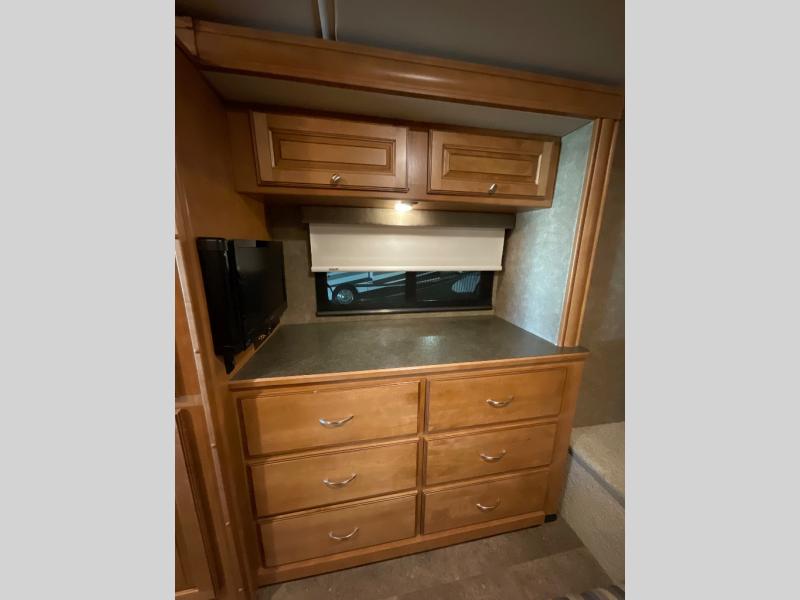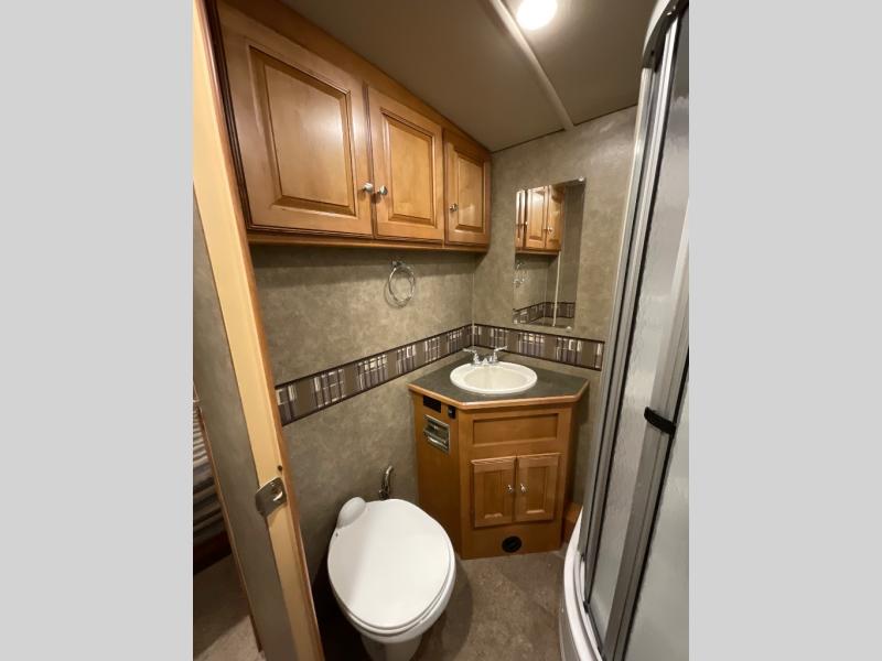 Along the outer bathroom wall is the location for a living area 48" HD TV. There is also an optional powered Studio Loft Bed that can be lowered with the push of a button for additional sleeping space. There is a location above the cab area for an optional 32" HD TV to be added if you choose too.