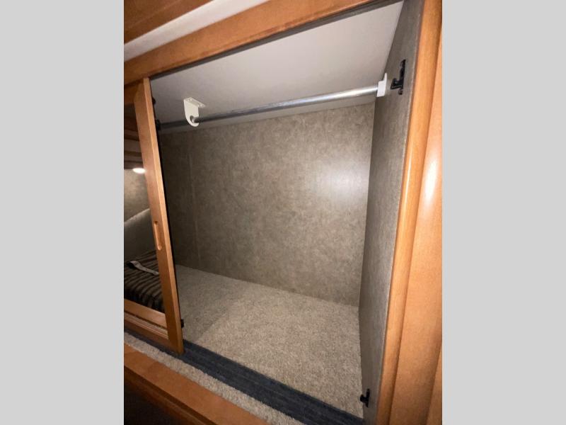 Head back to the rear of this Sunstar LX and find a private bedroom with sliding door. Inside find a queen bed with shirt closet and nightstand, plus overhead storage, and a slide out wardrobe.