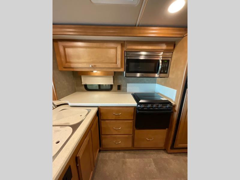 To the left of the entry door find a large wall slide featuring the kitchen appliances and rear bedroom chest of drawers. The L-shaped counter features a double kitchen sink, overheads storage, a three burner range, refrigerator, and pantry, plus chest of drawers back in the rear master bedroom.